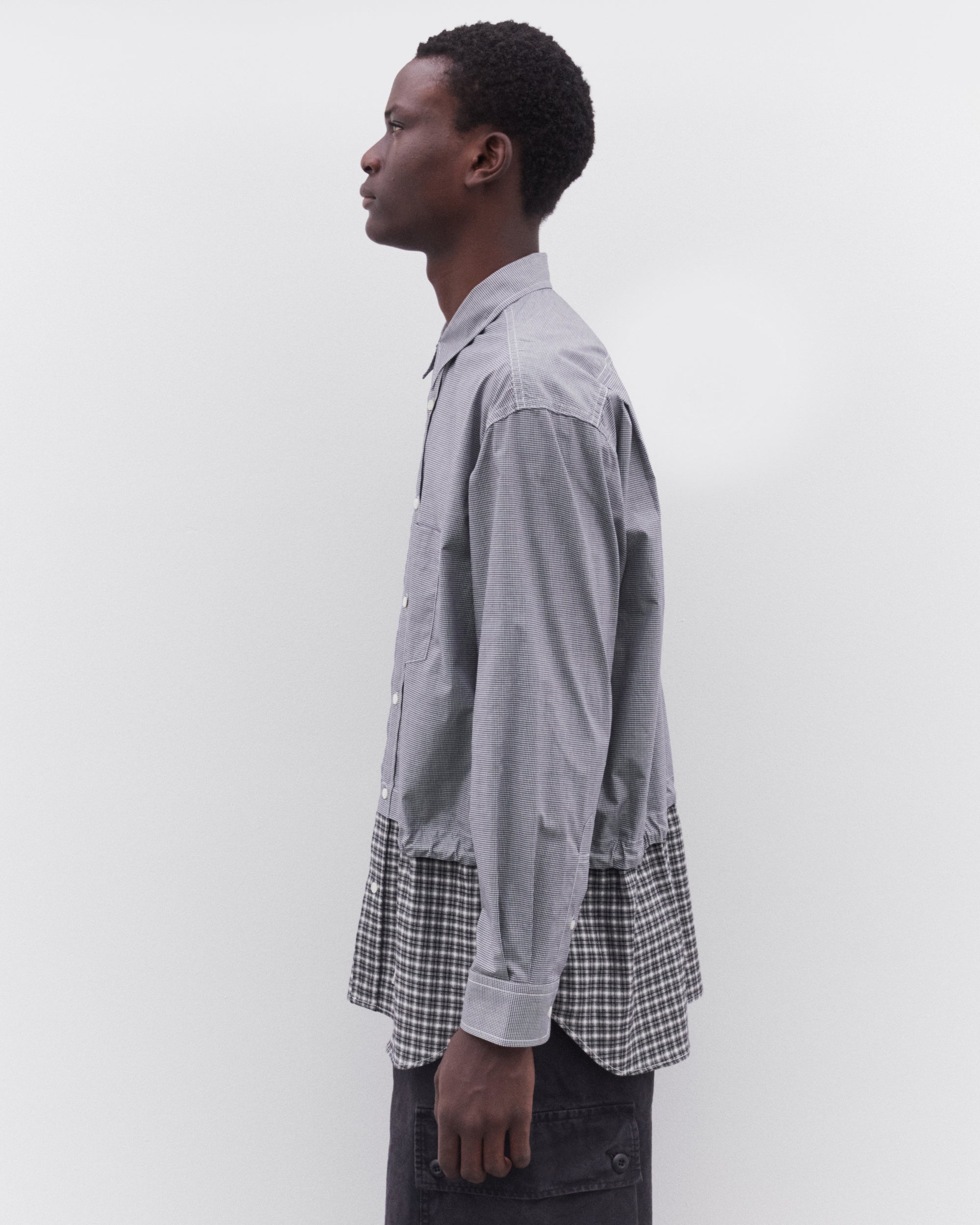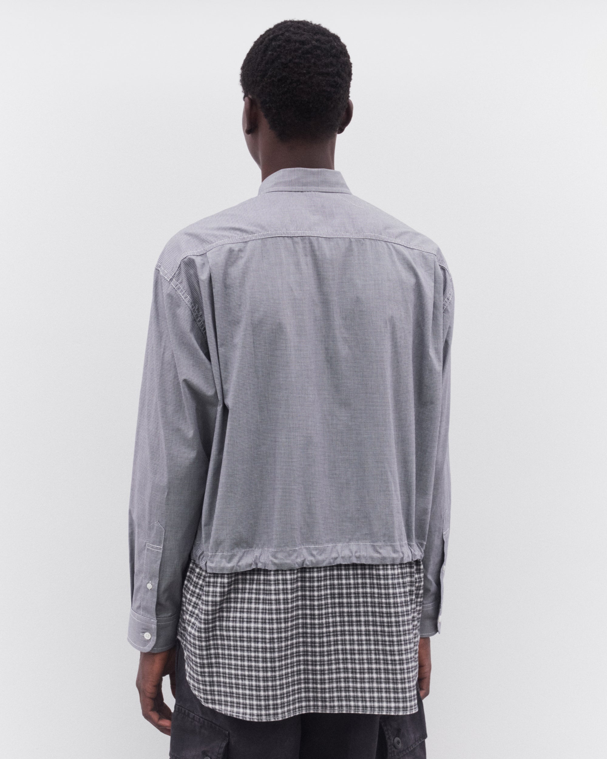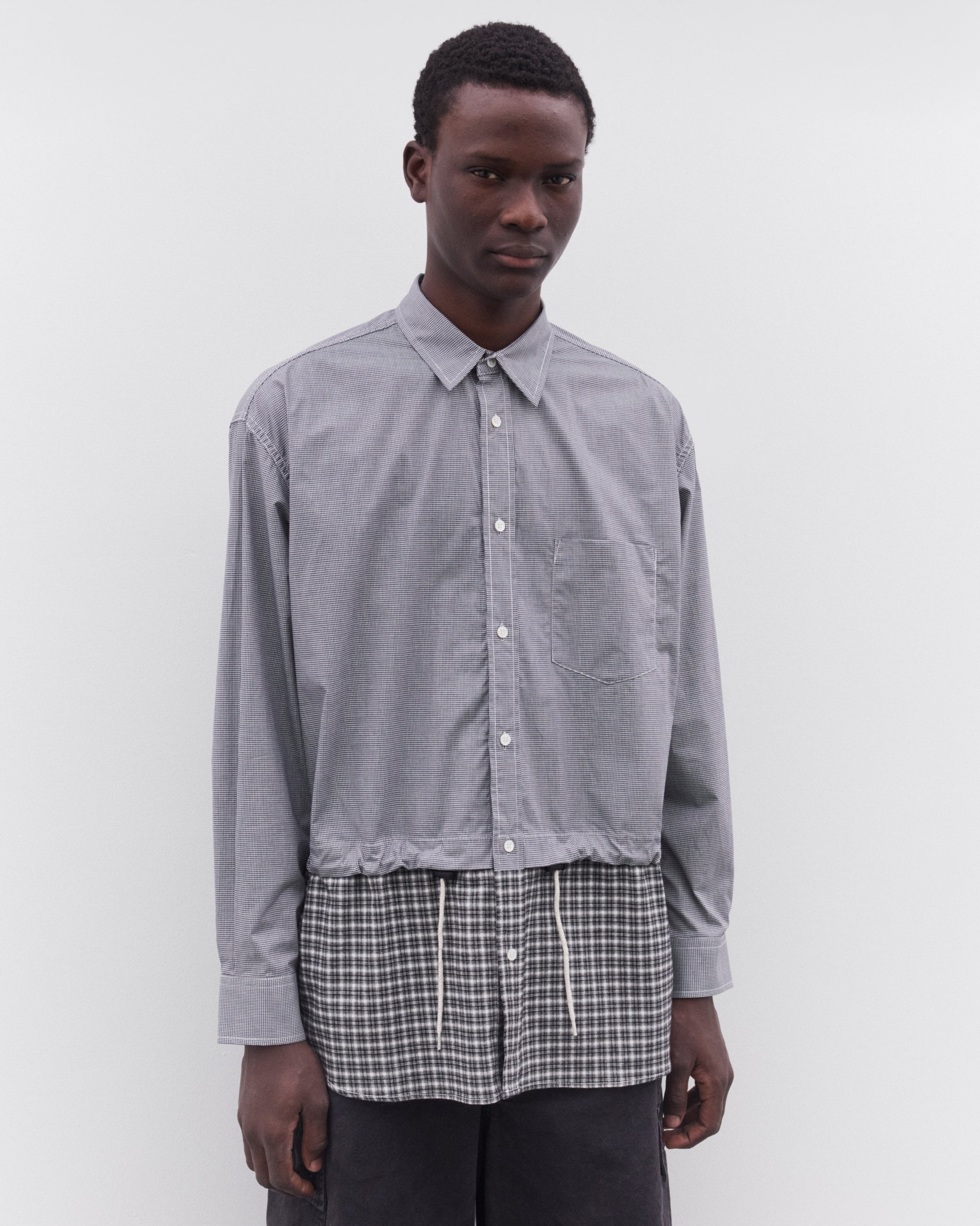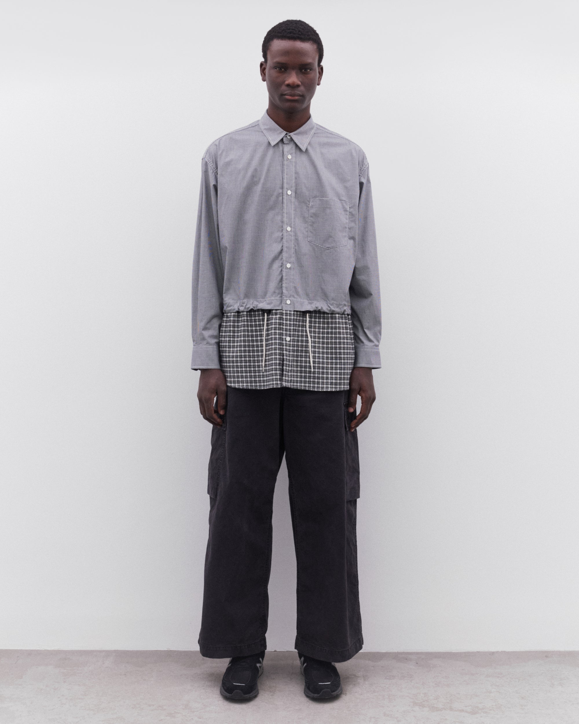 Point collarChest patch pocketDrawcord detailContrast check panel at hemCurved hem Button cuffs100% CottonMade in Japan
