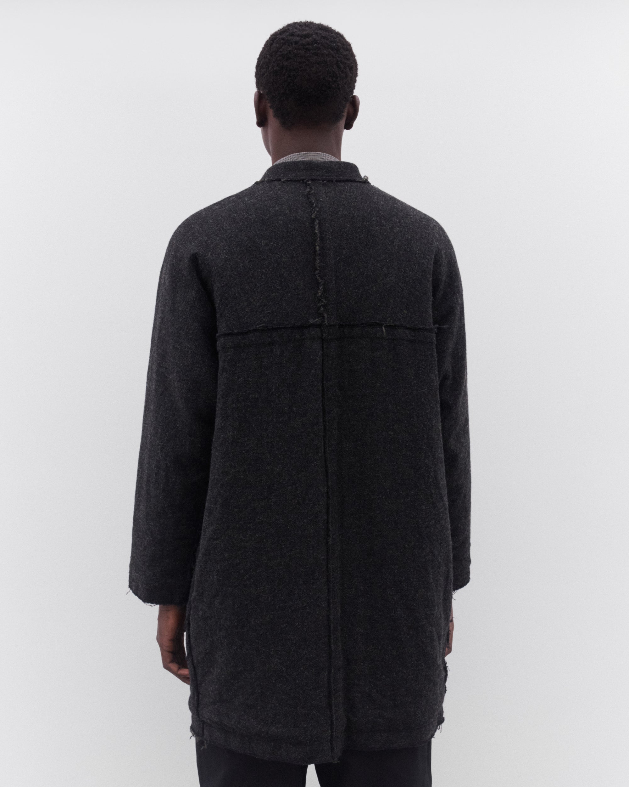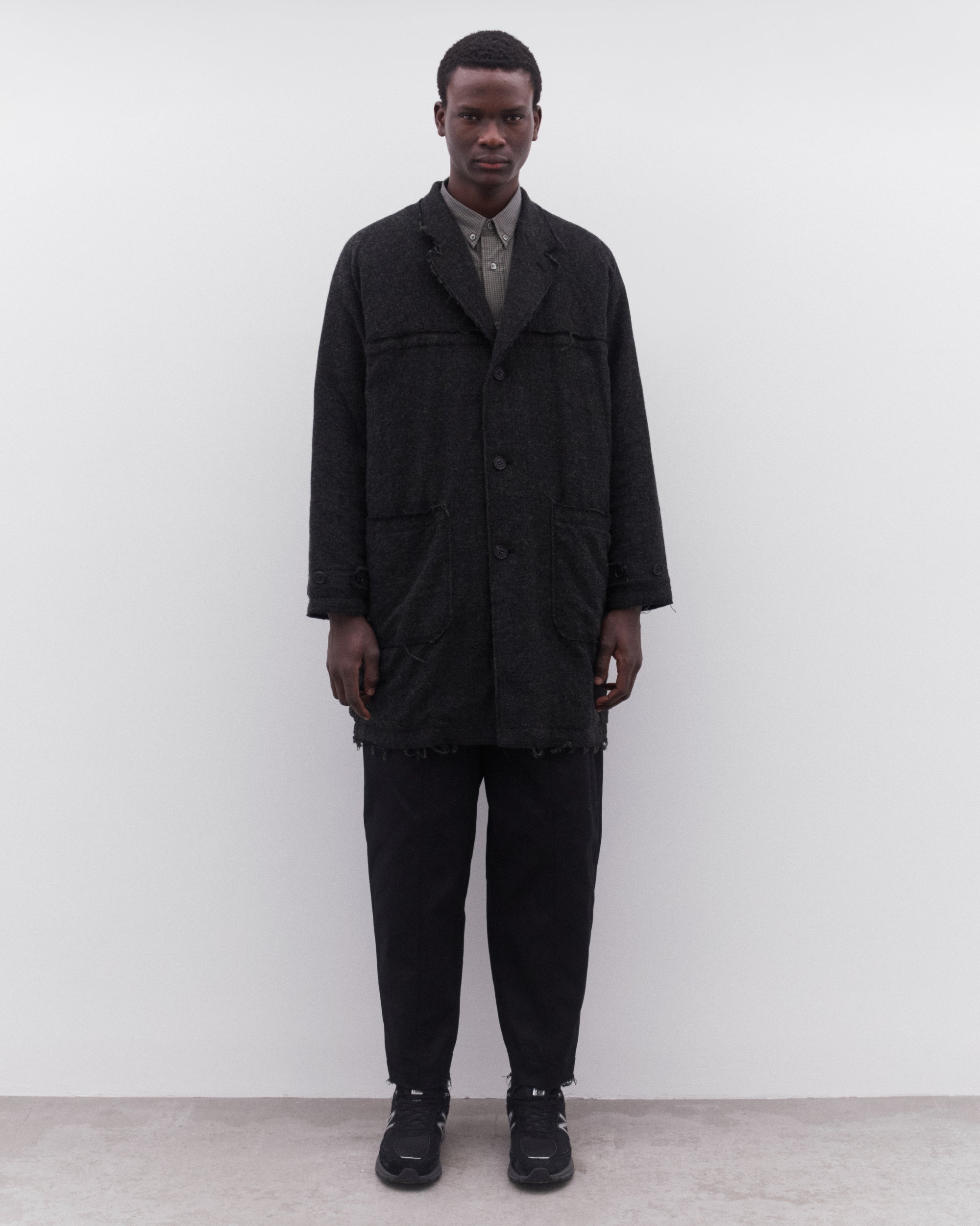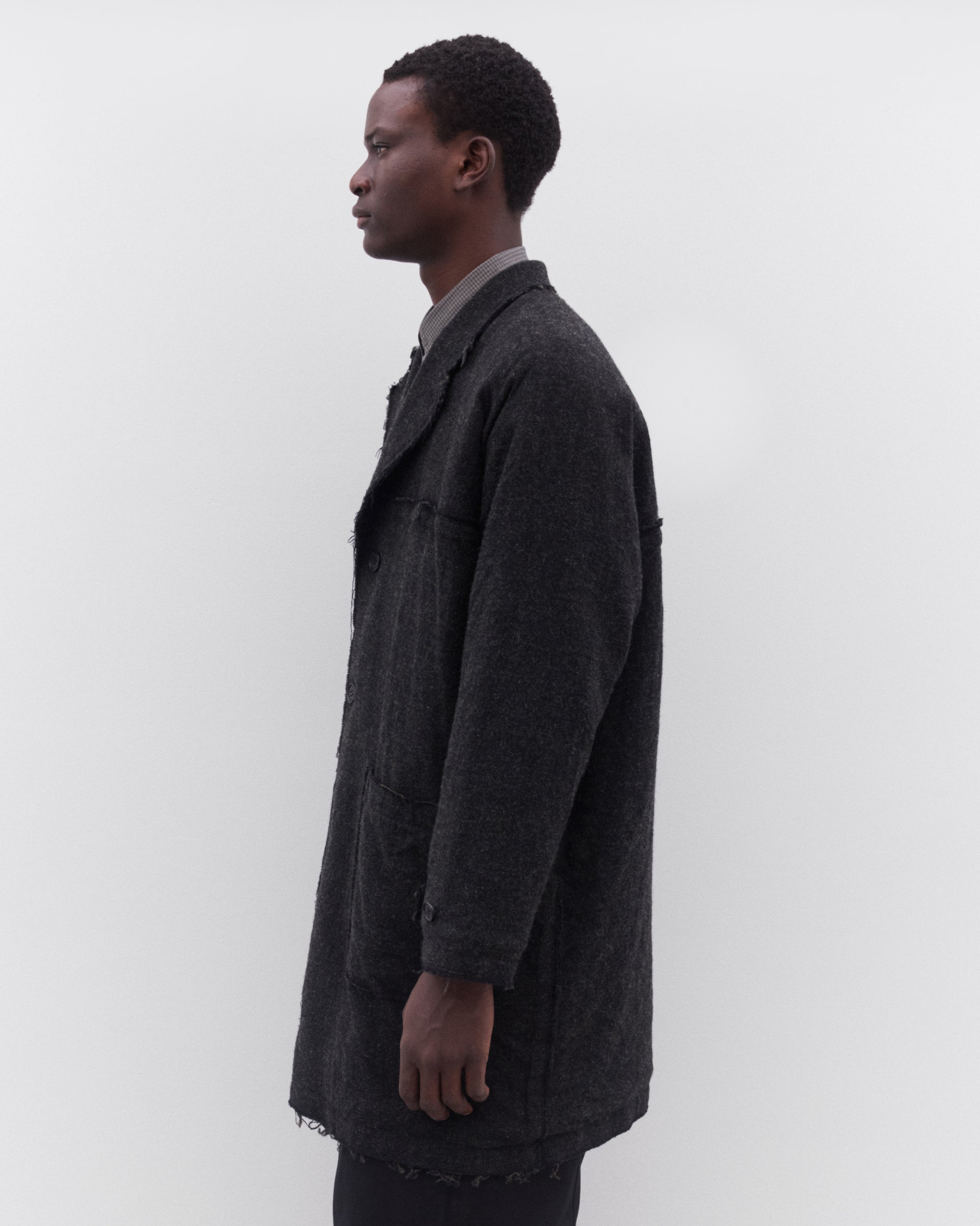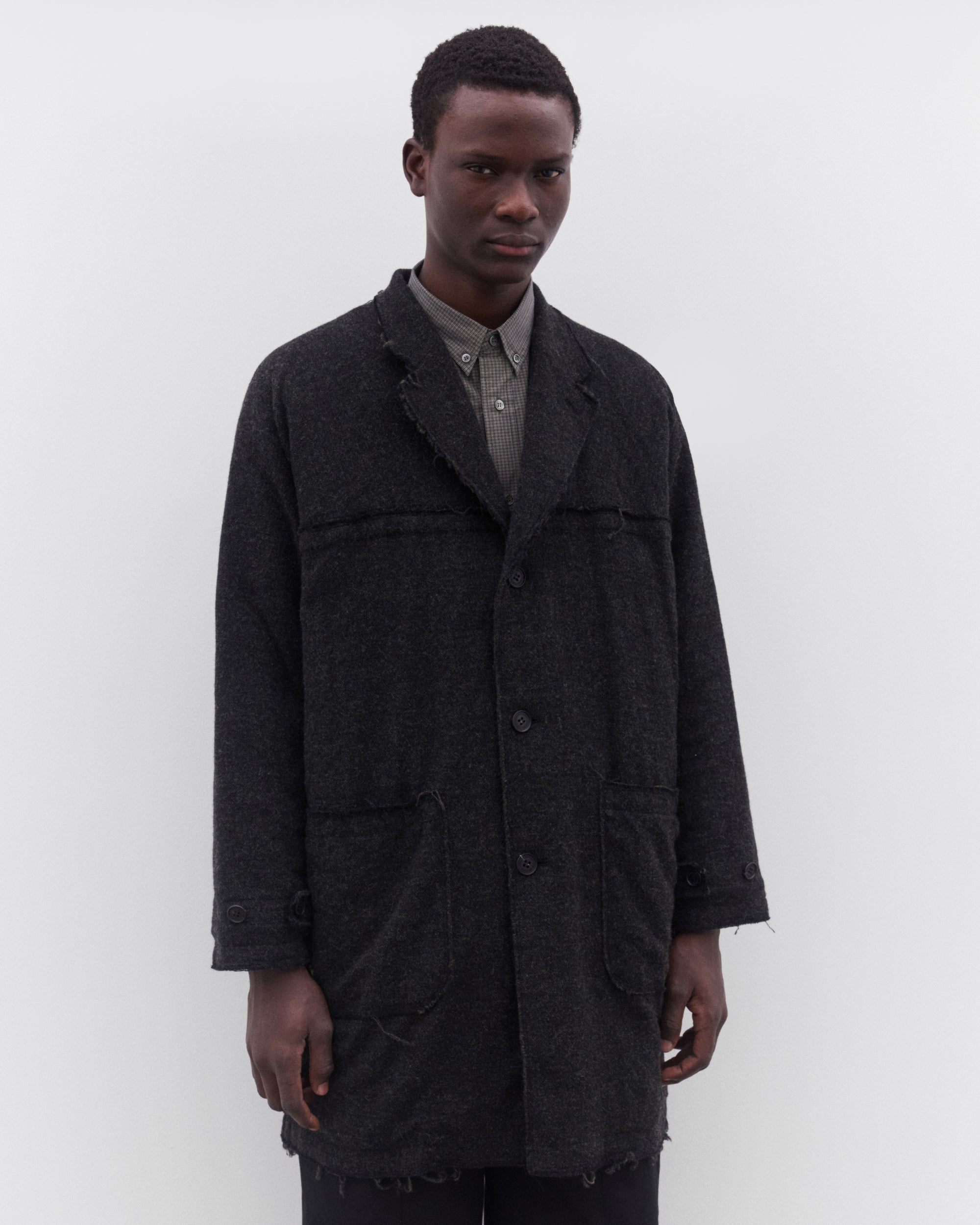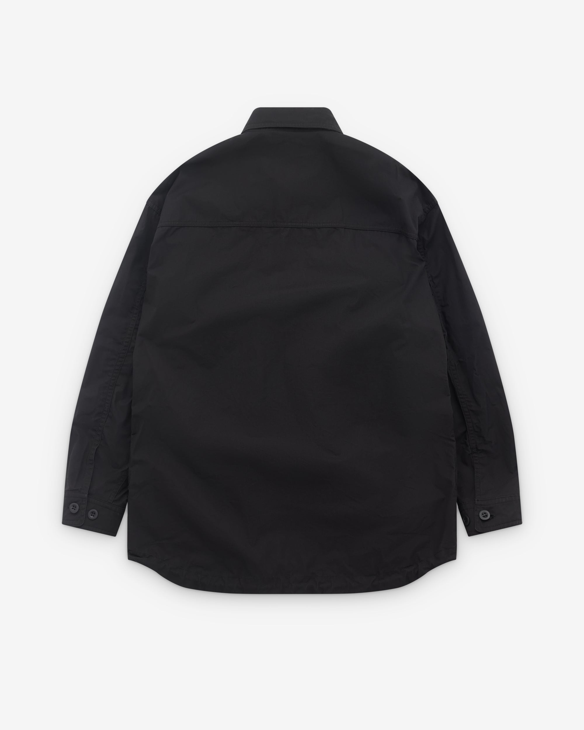 Point collarButton placketFront button utility pocketsCurved hemButton cuffs