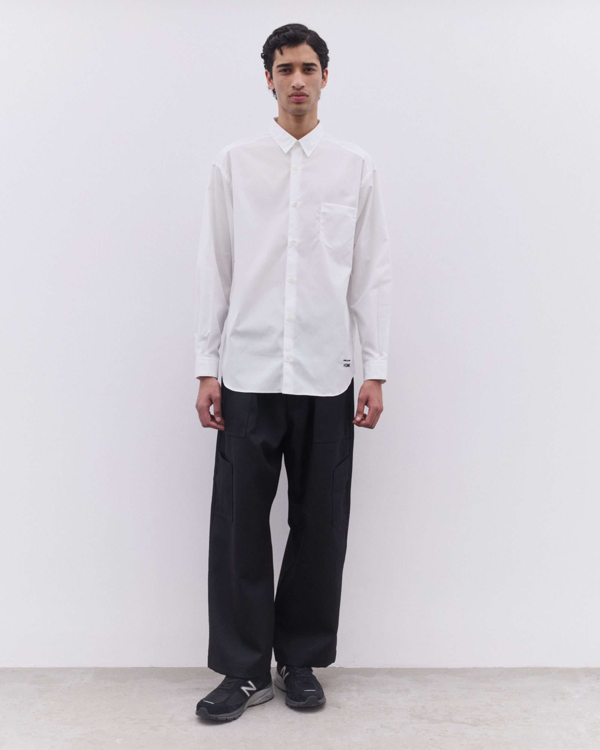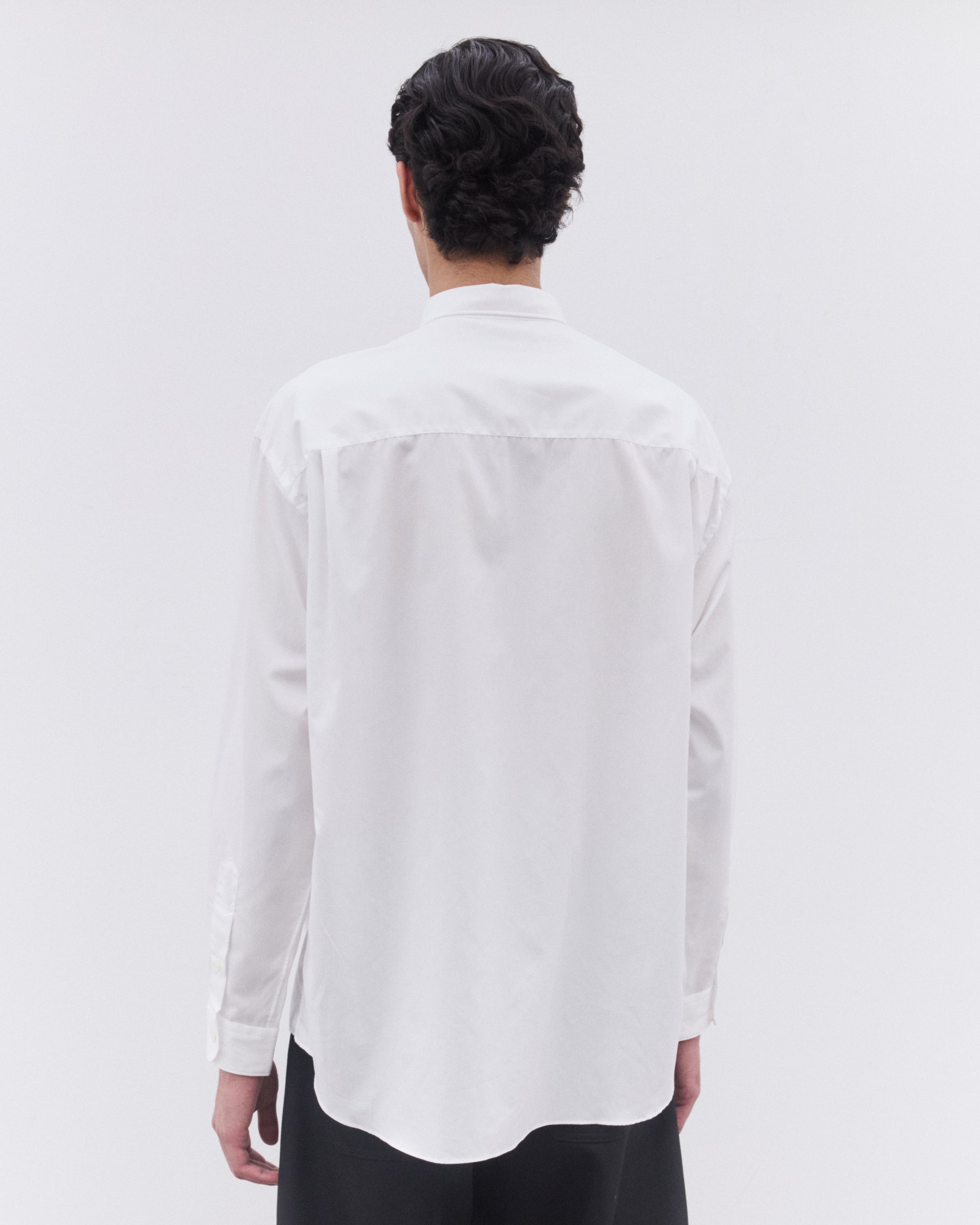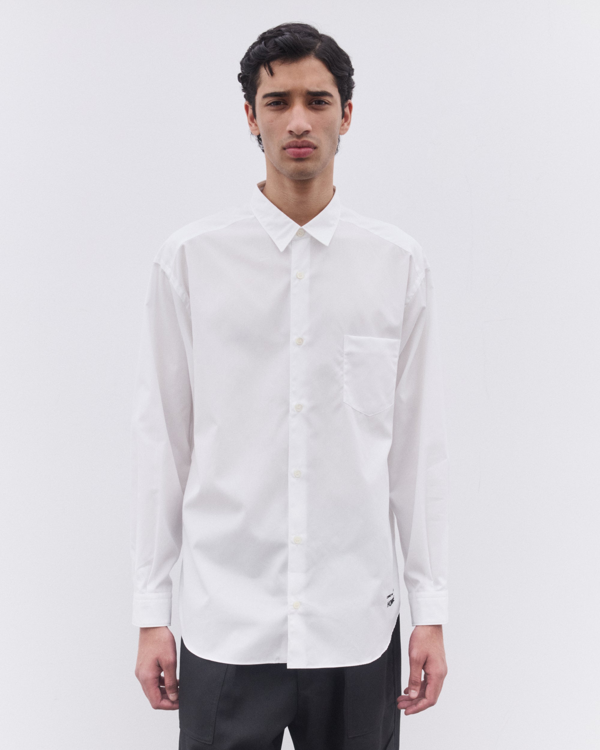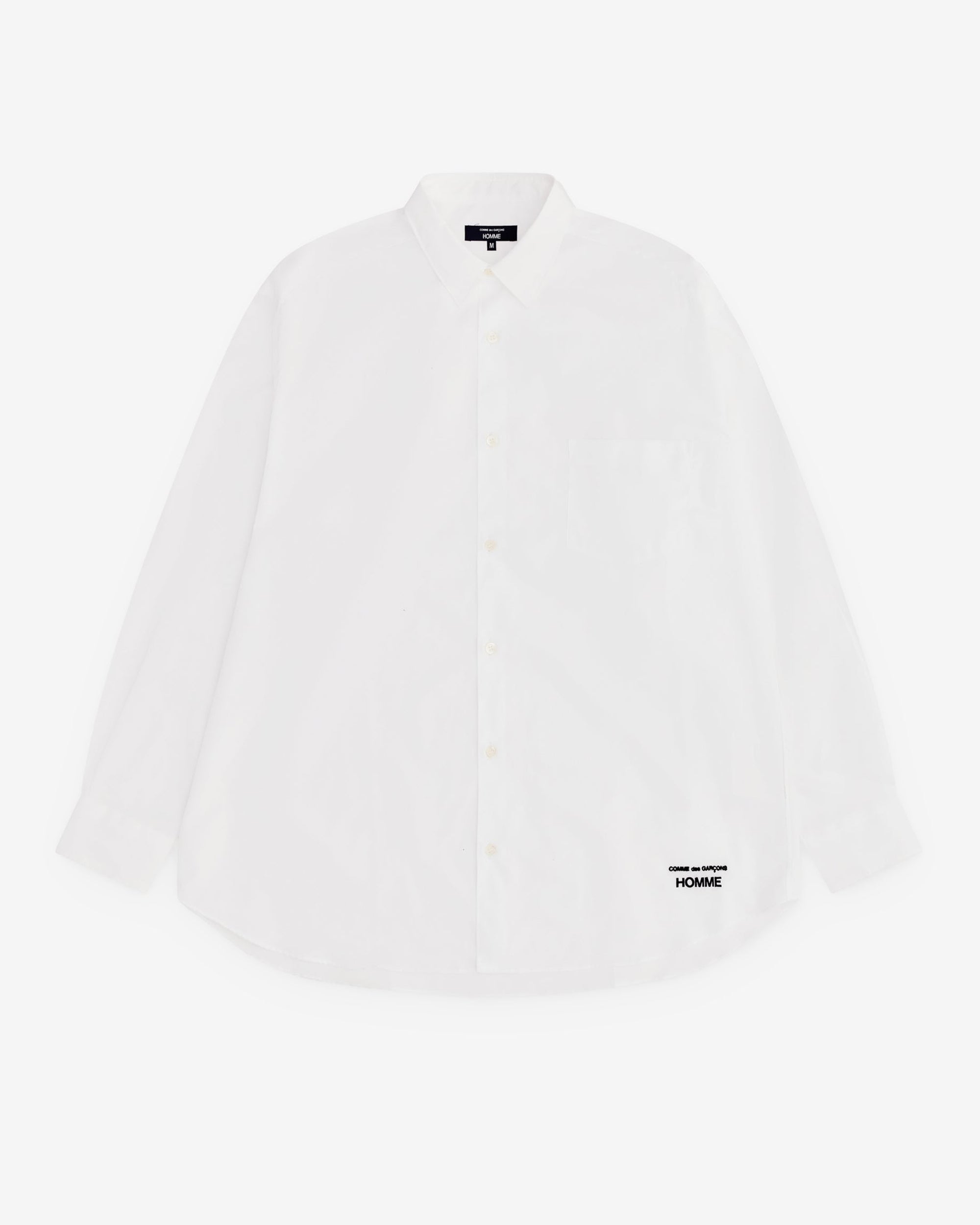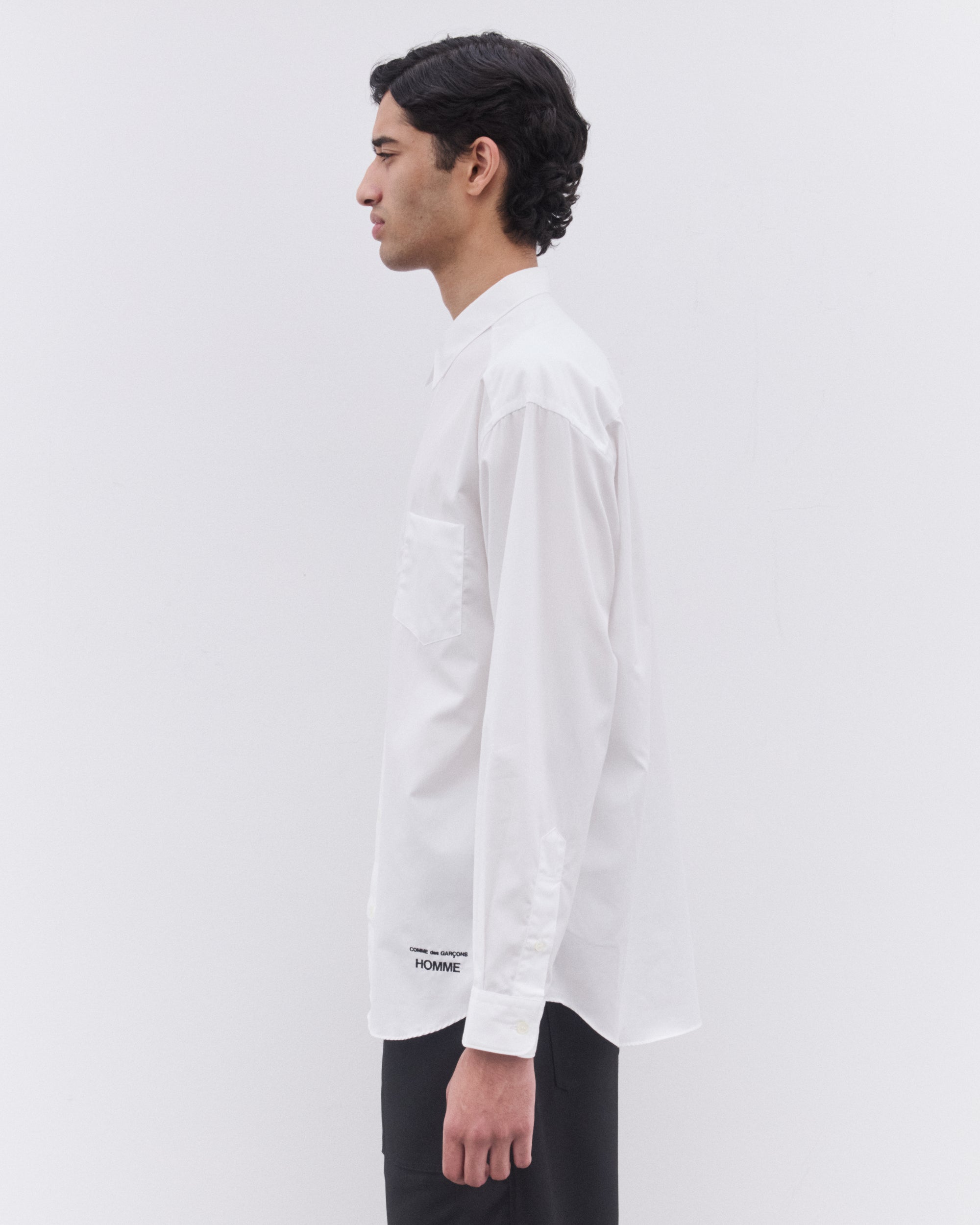 Point collarCurved hemPatch pocketButton placketButton cuffsPrinted logo at hem