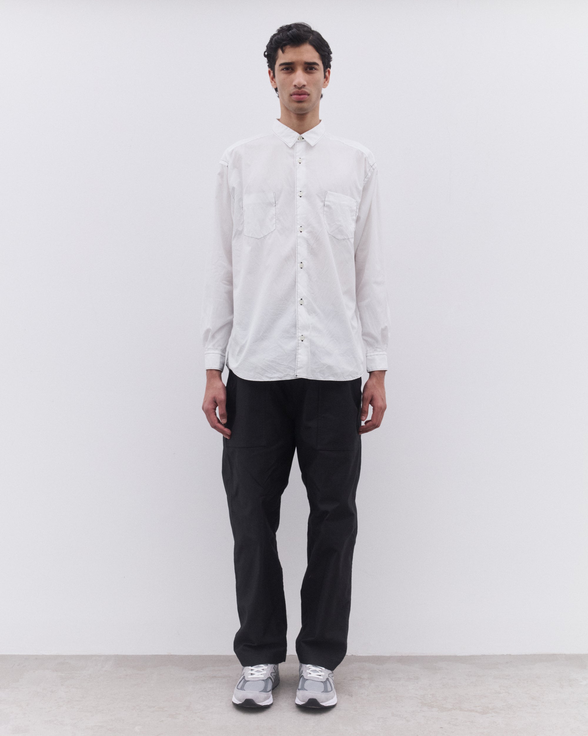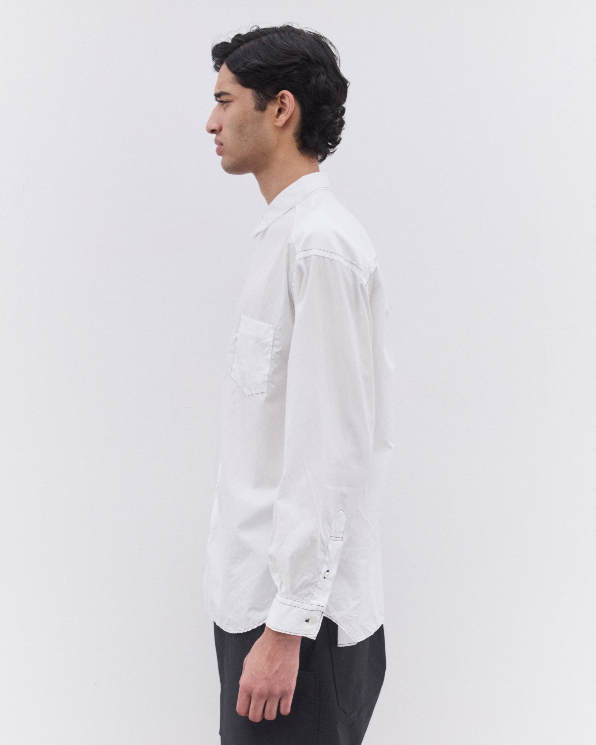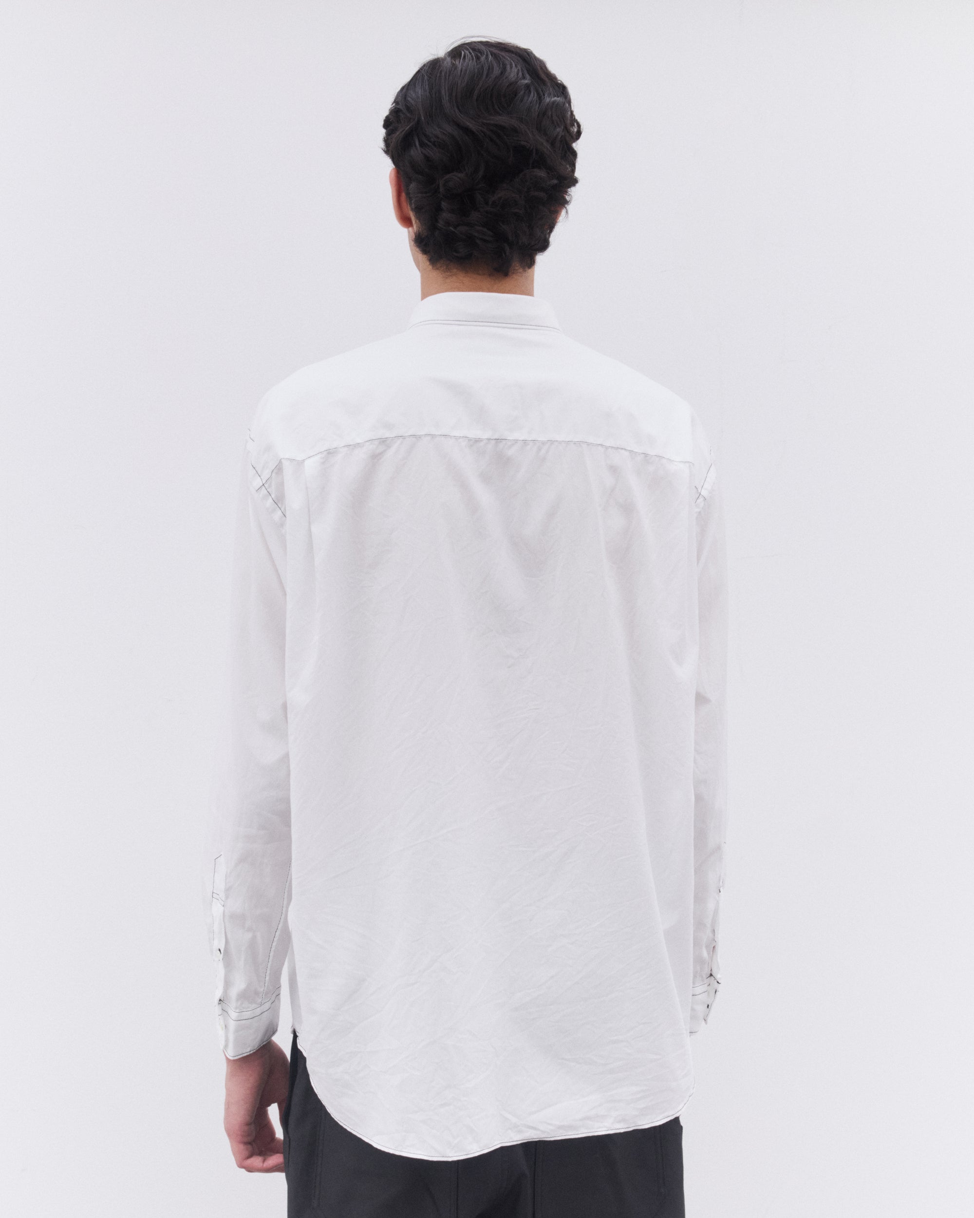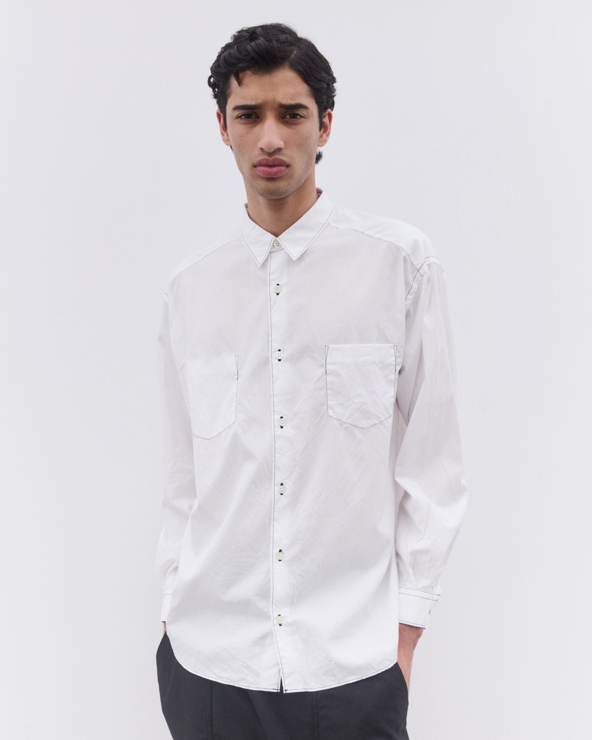 Point collarCurved hemPatch pocketsButton placketButton cuffsContrast topstitching throughout