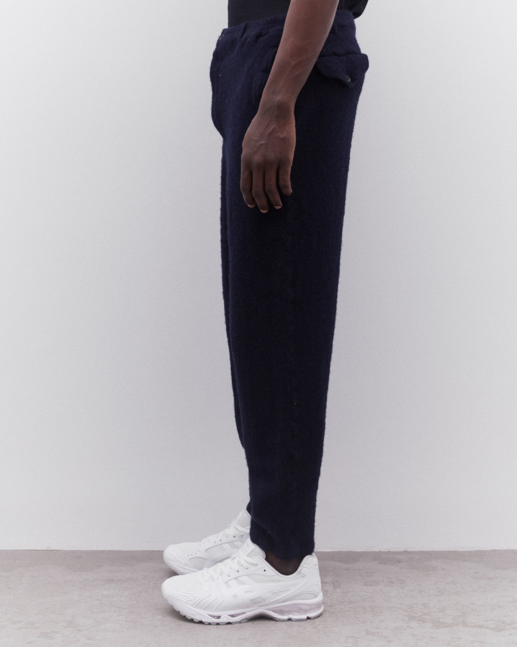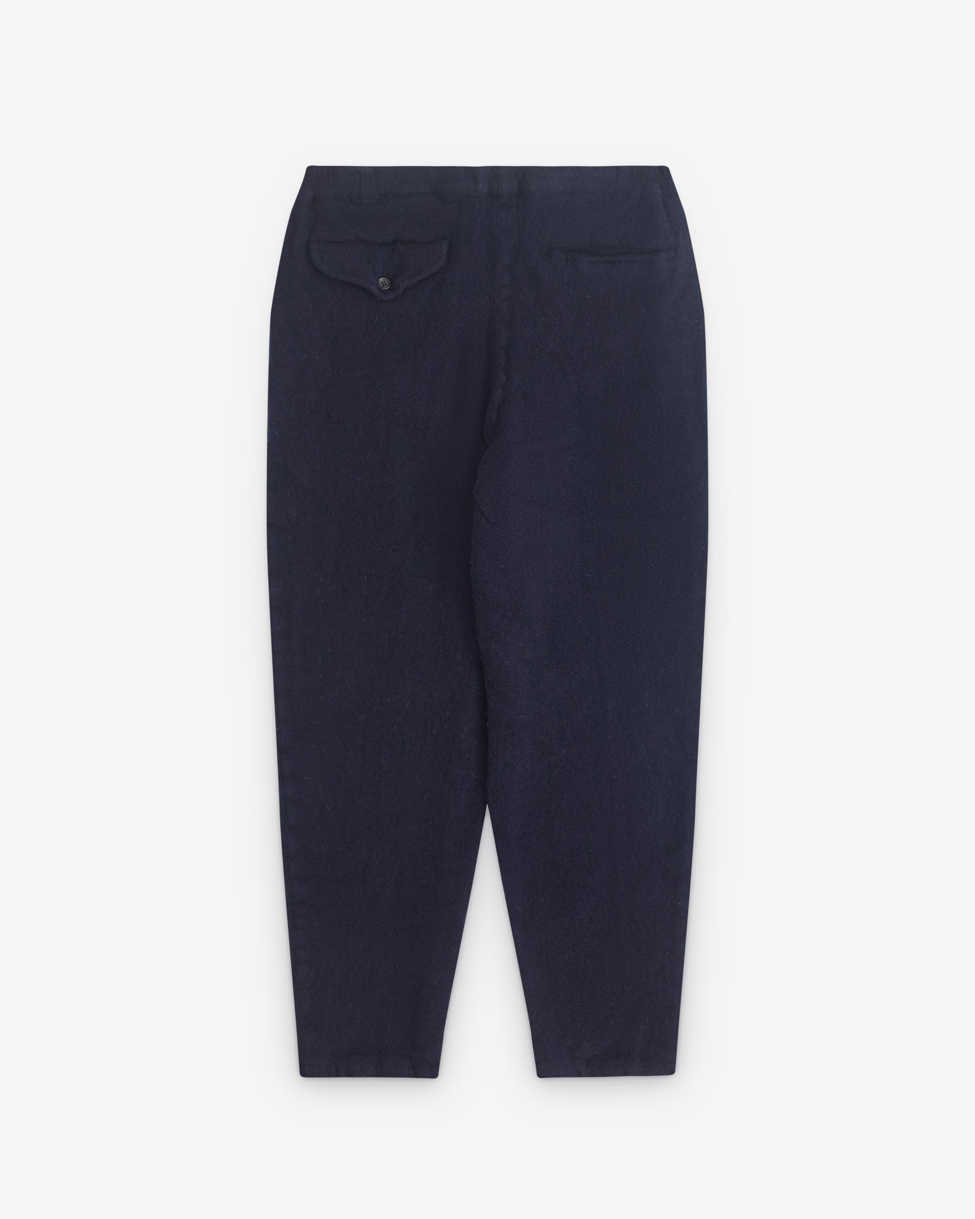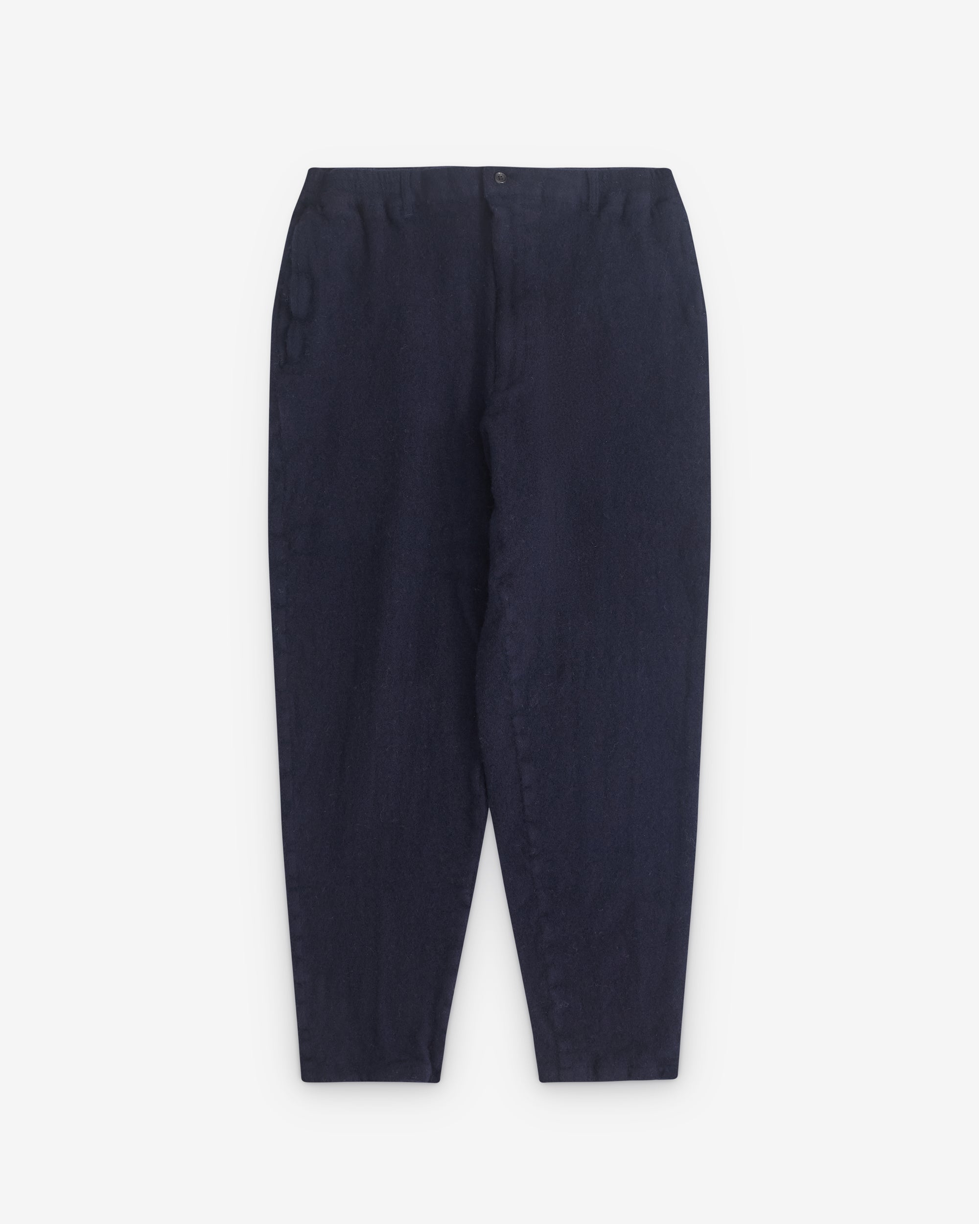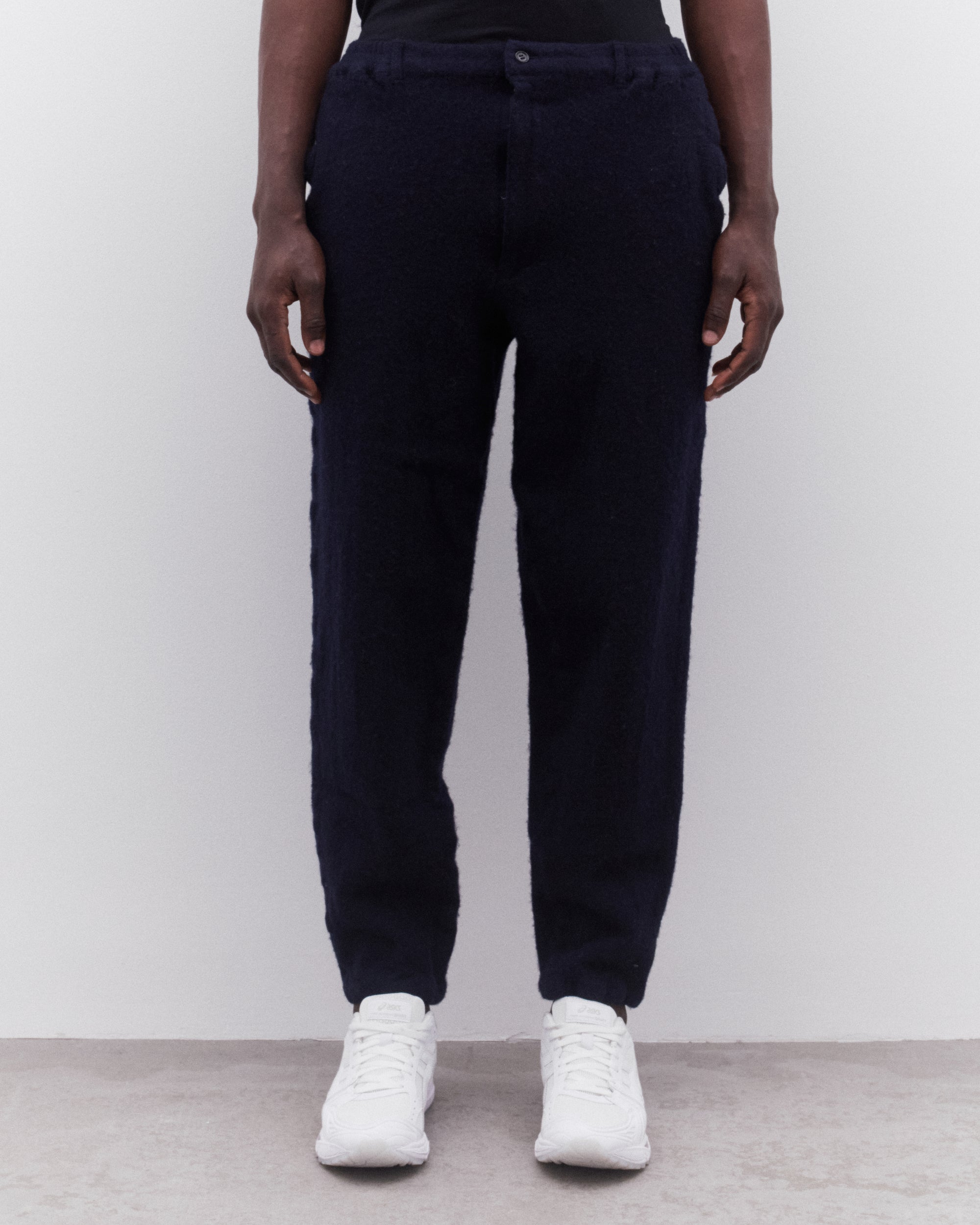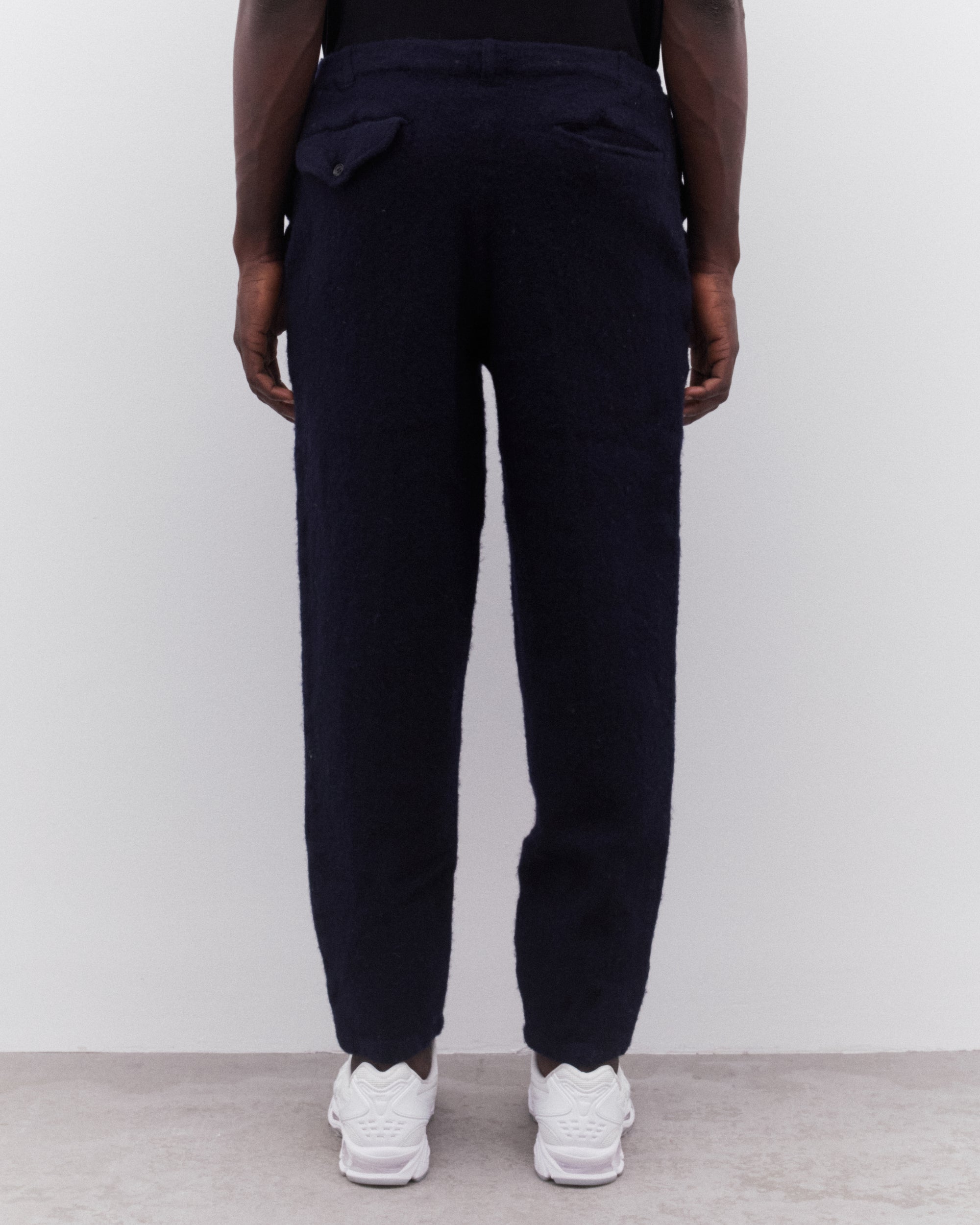 Elasticated waistButton and zip flyTapered legGarment treatedSide seam pocketsRear flap pockets90% Wool, 10% NylonMade in France
