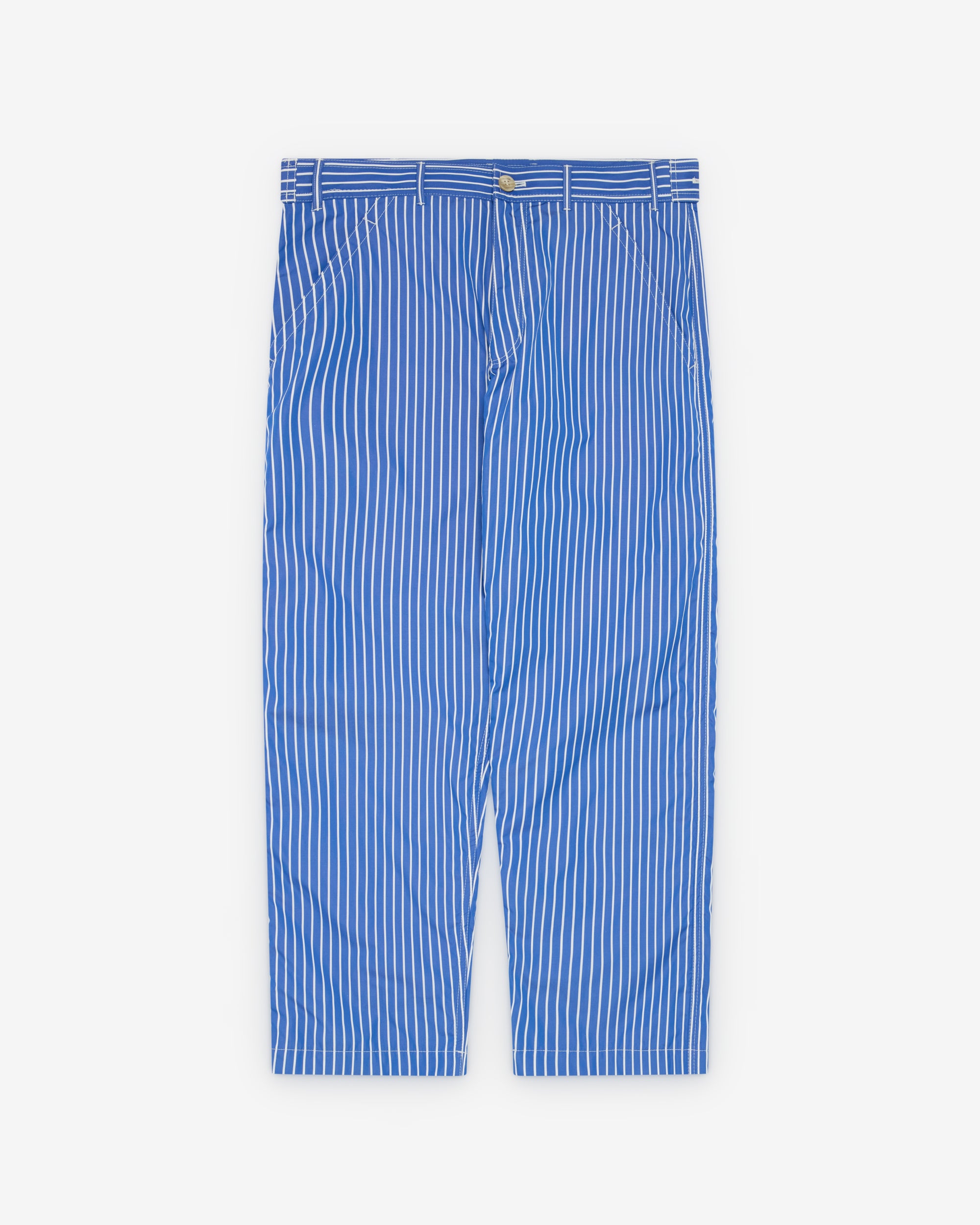 Button waist, zip flyFront slip pocketsStriped fabricButton adjustable tabs at waistTwo back pocketsStraight leg