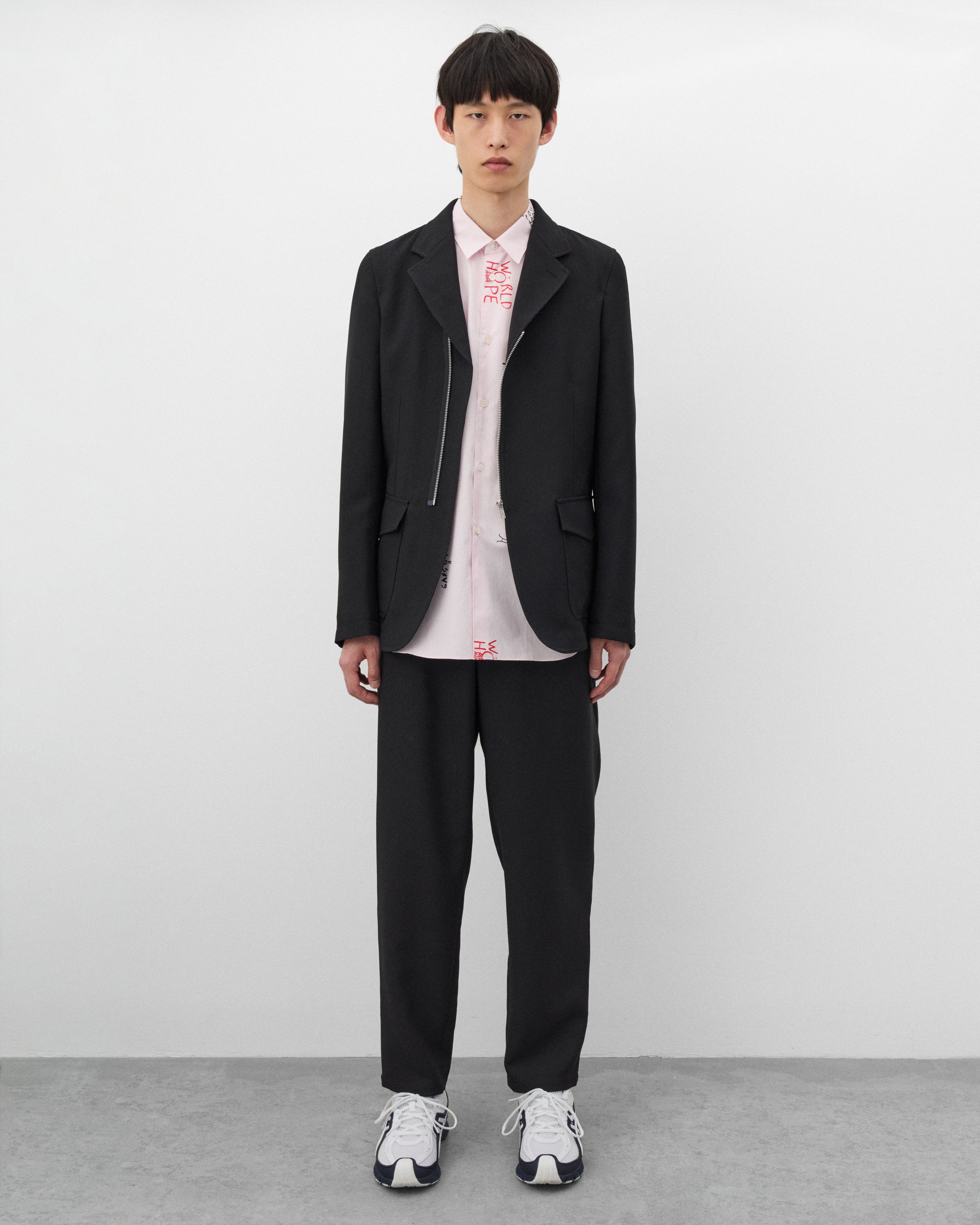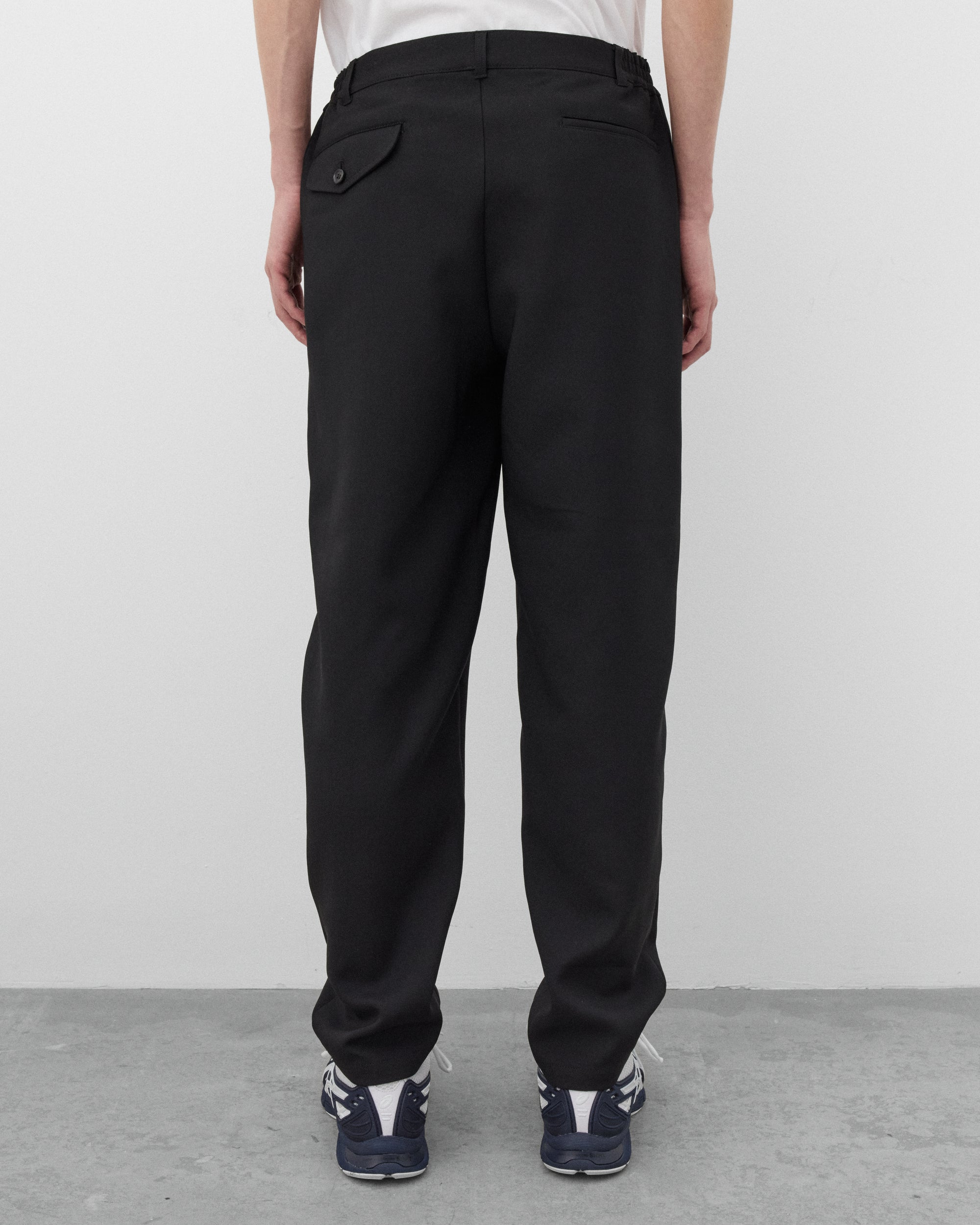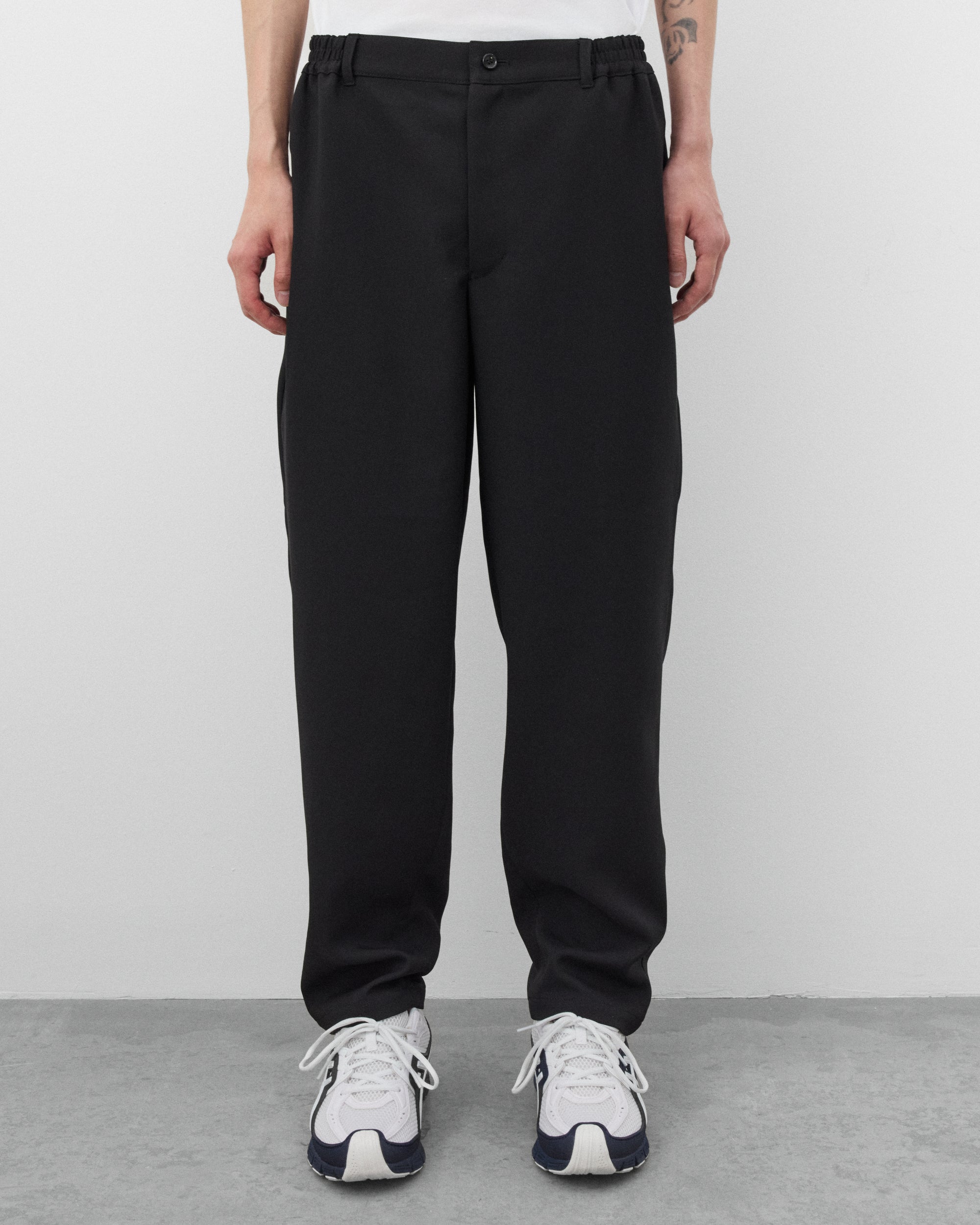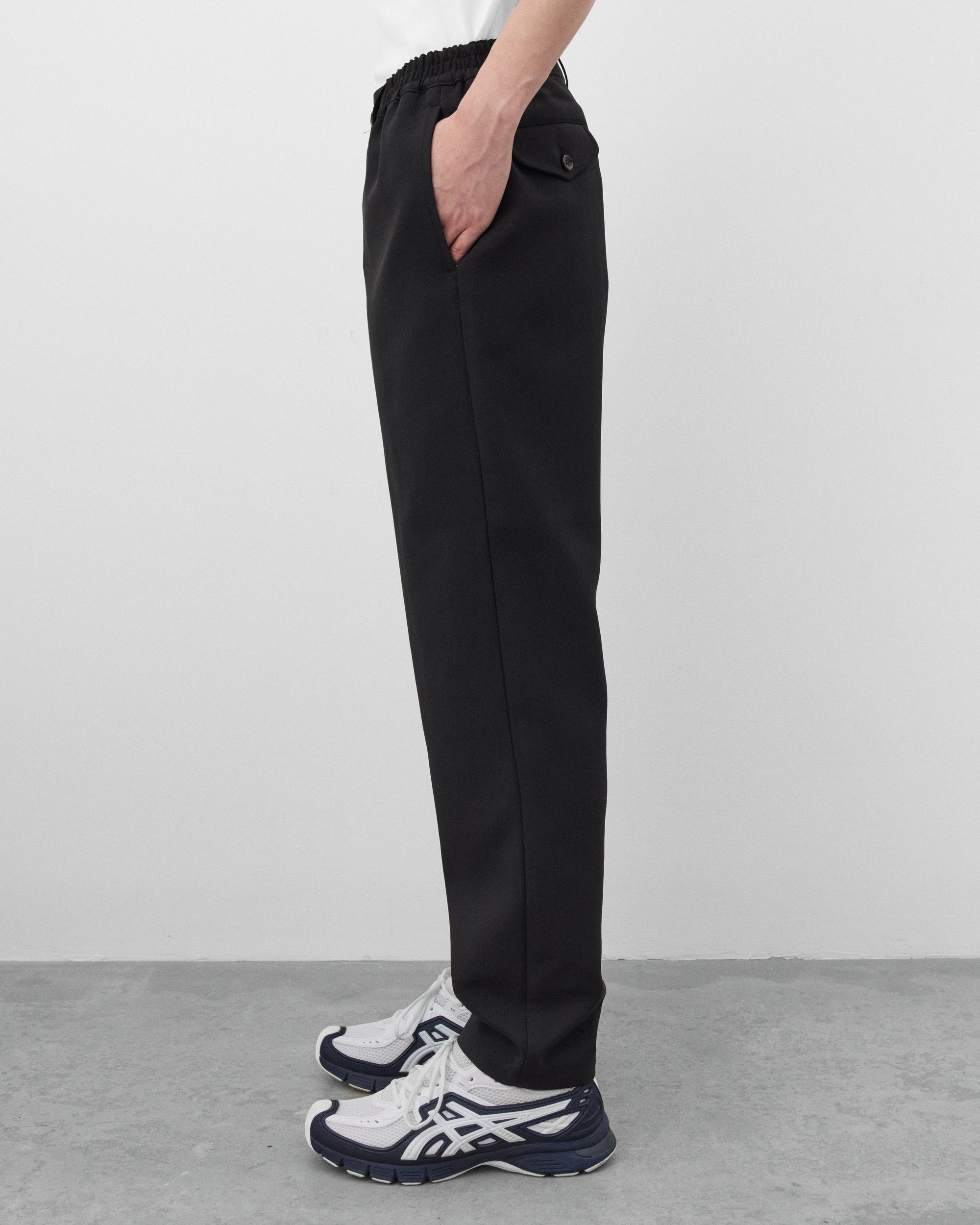 Button waist, zip flyFront slash pocketsLoose thigh, tapered legTwo rear pocketsPartial elasticated waist band