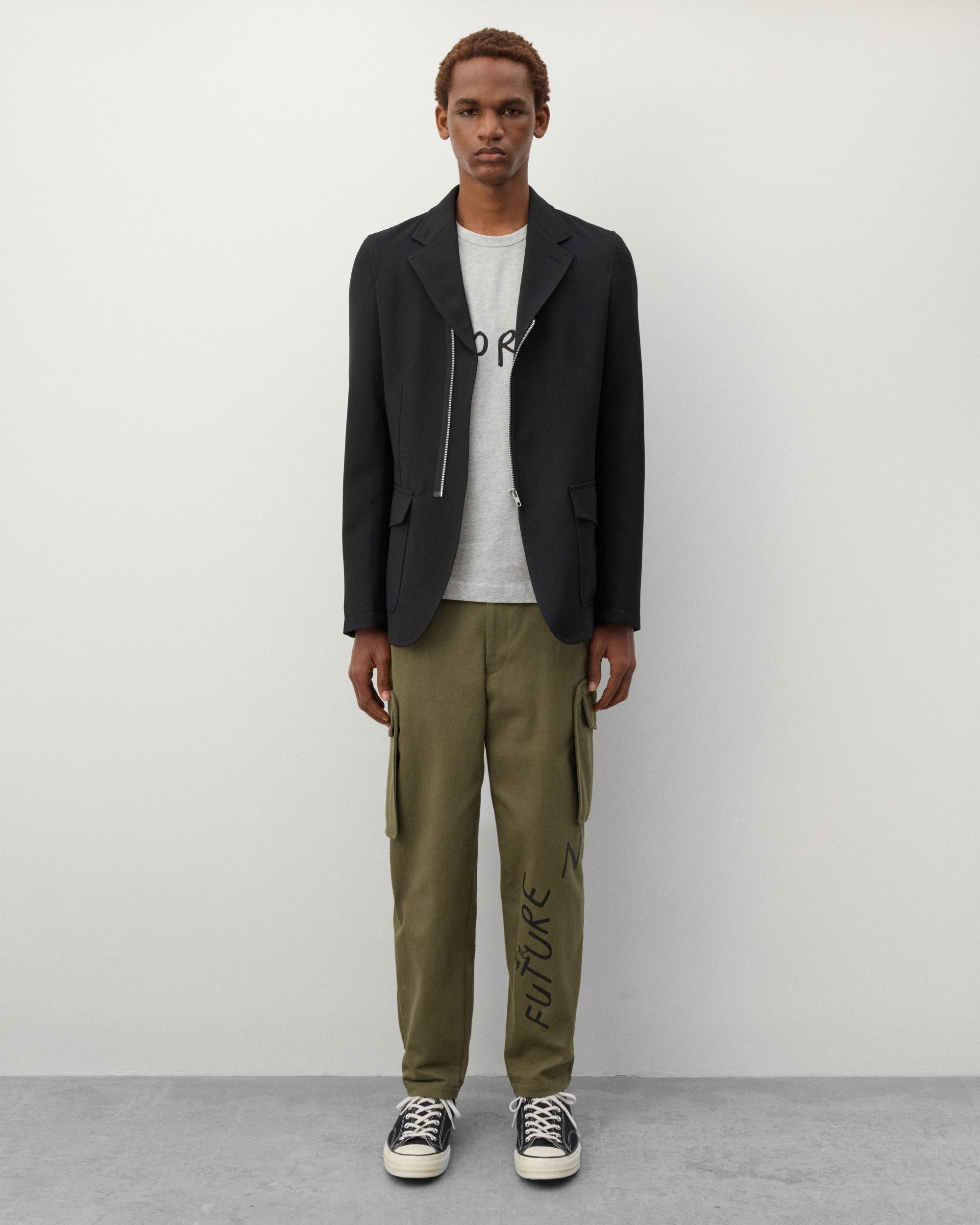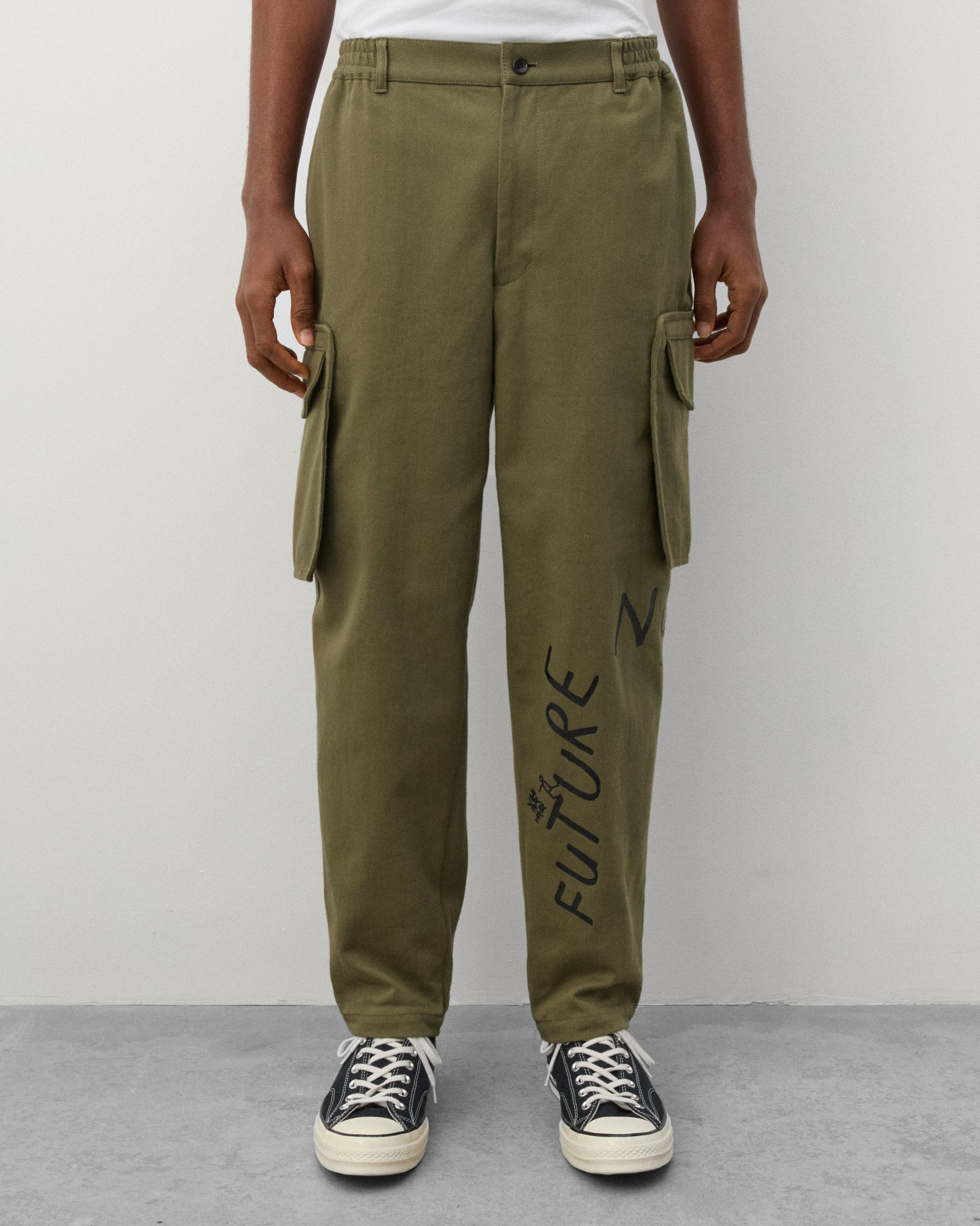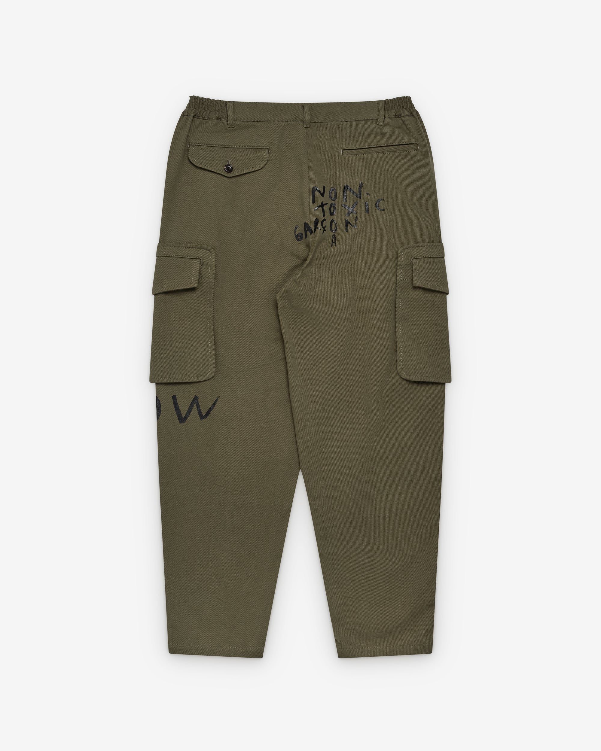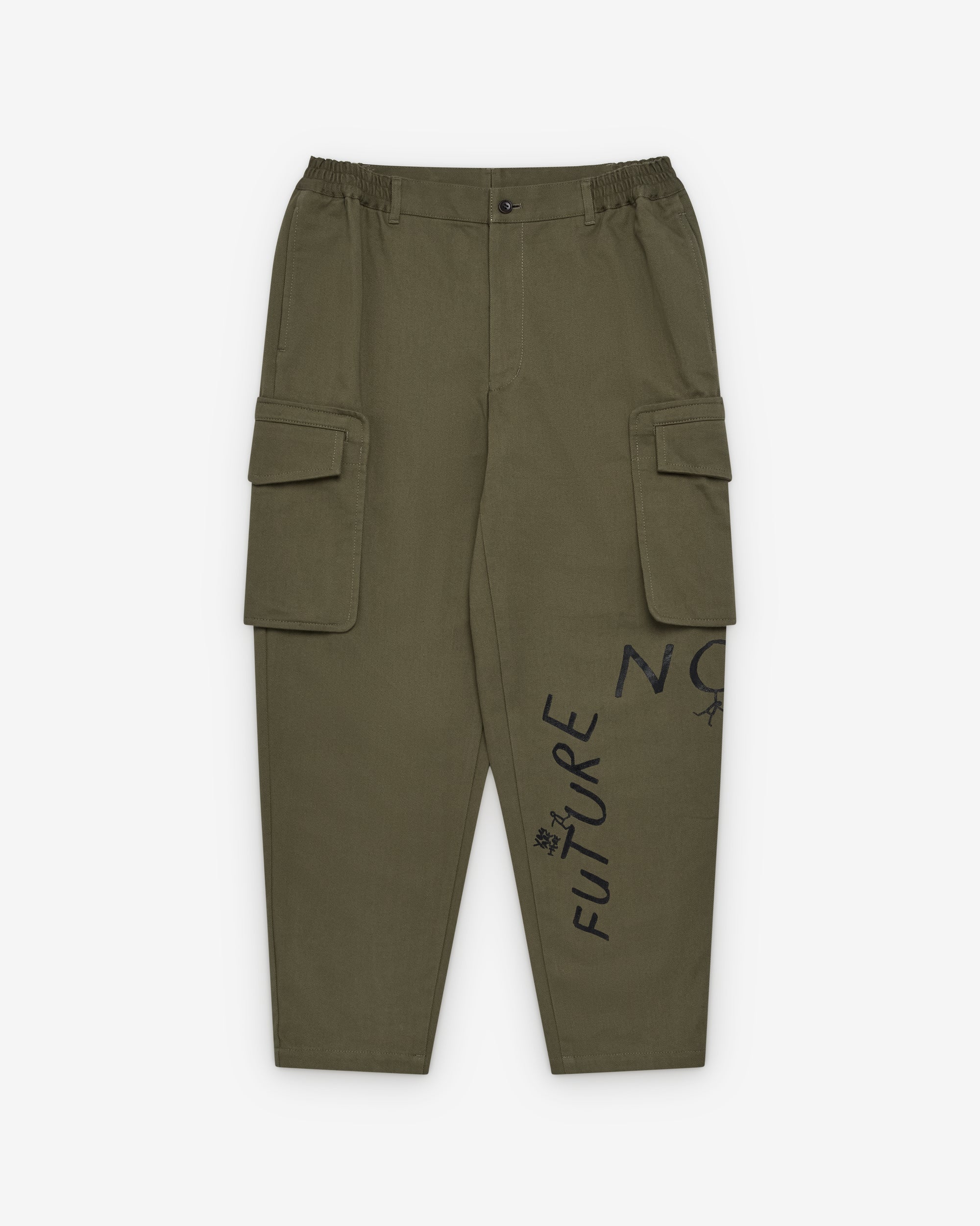 Elasticated waist band at sideButton waist, zip flySide seam pocketsCargo leg pocketsLoose thigh, tapered legTwo back pocketsPrinted graphics throughout