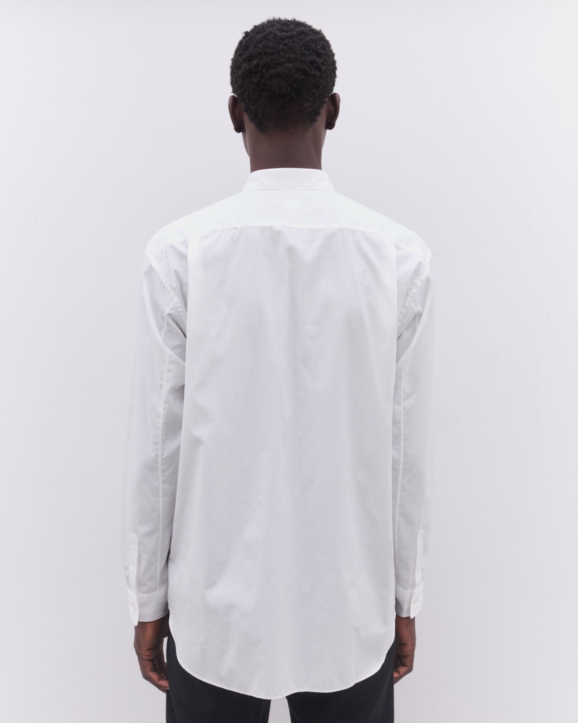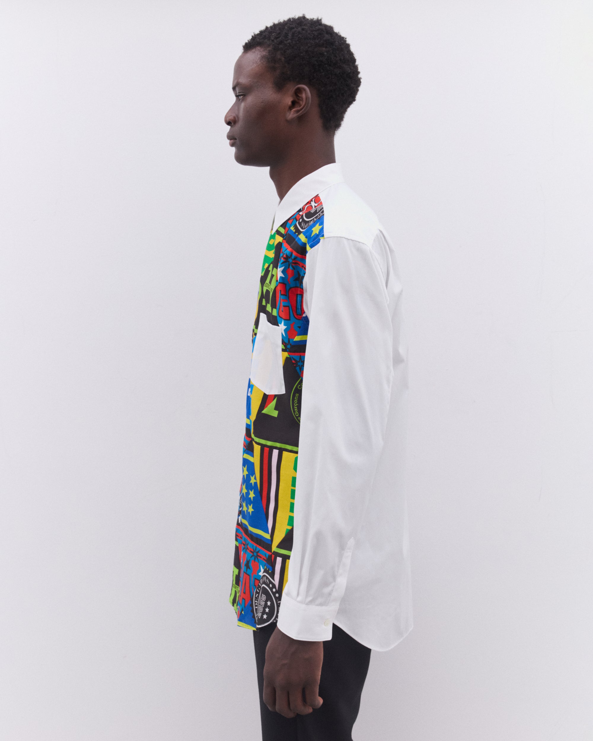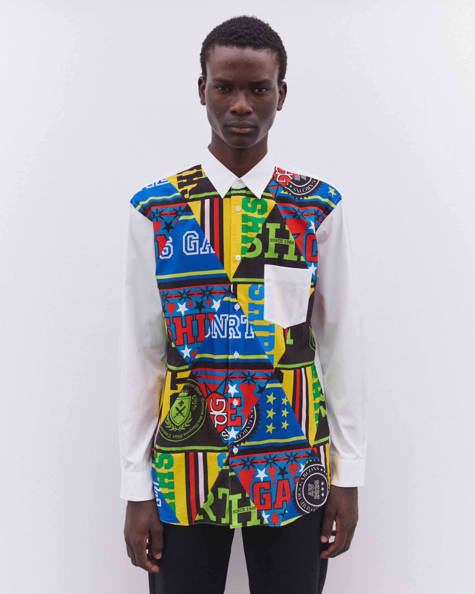 Point collarCurved hemPatch pocketButton placketButton cuffsInterwoven football scarf pattern at body