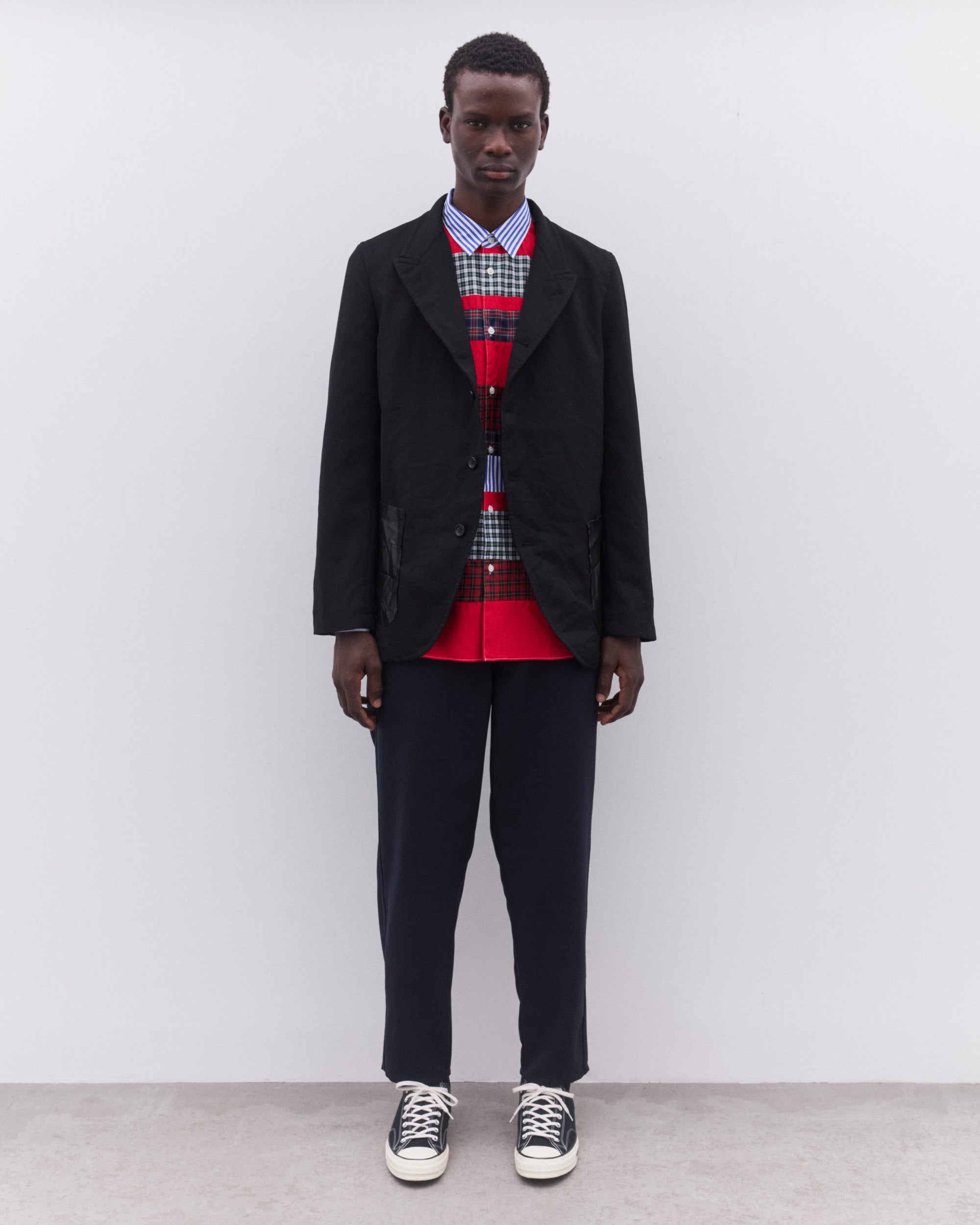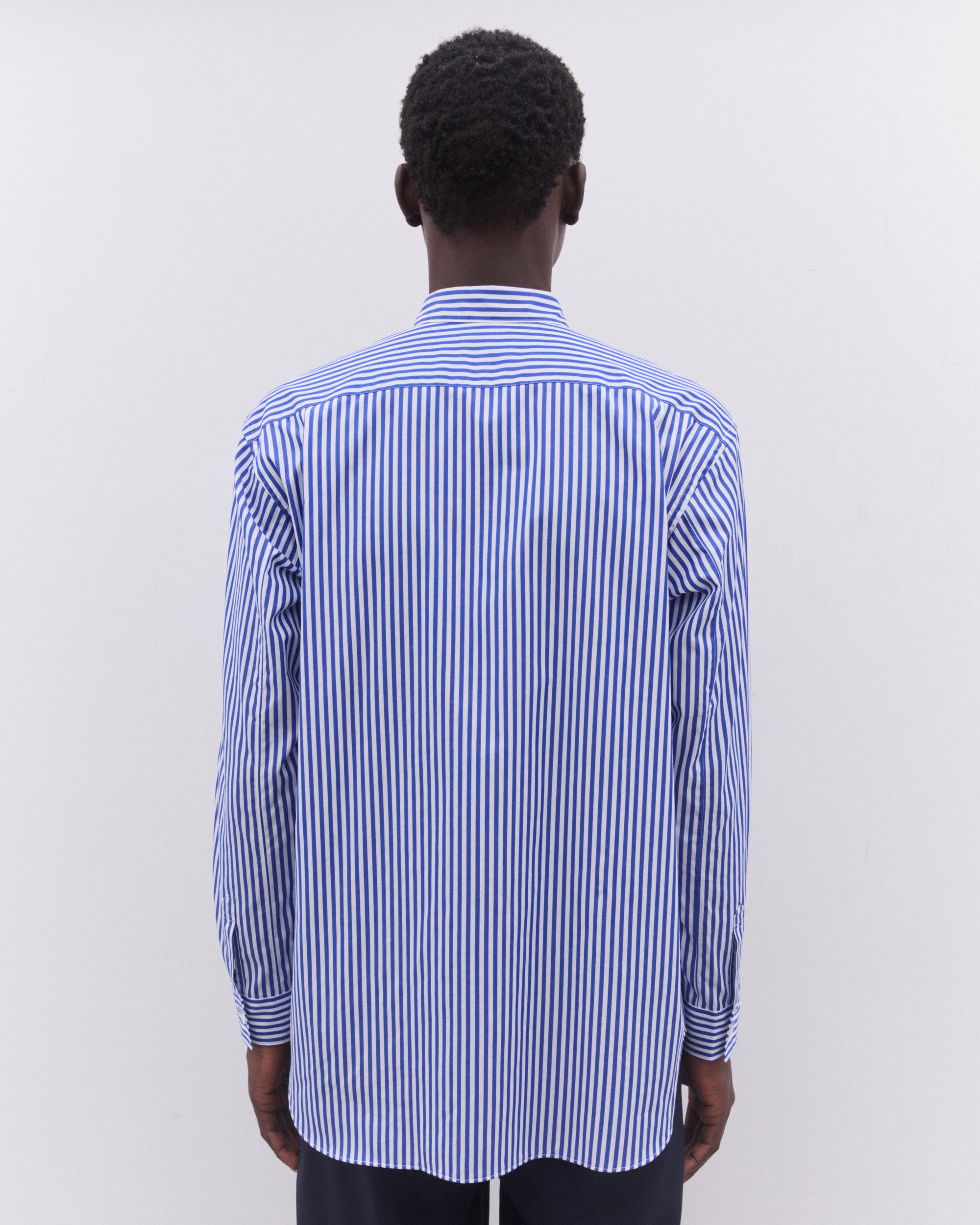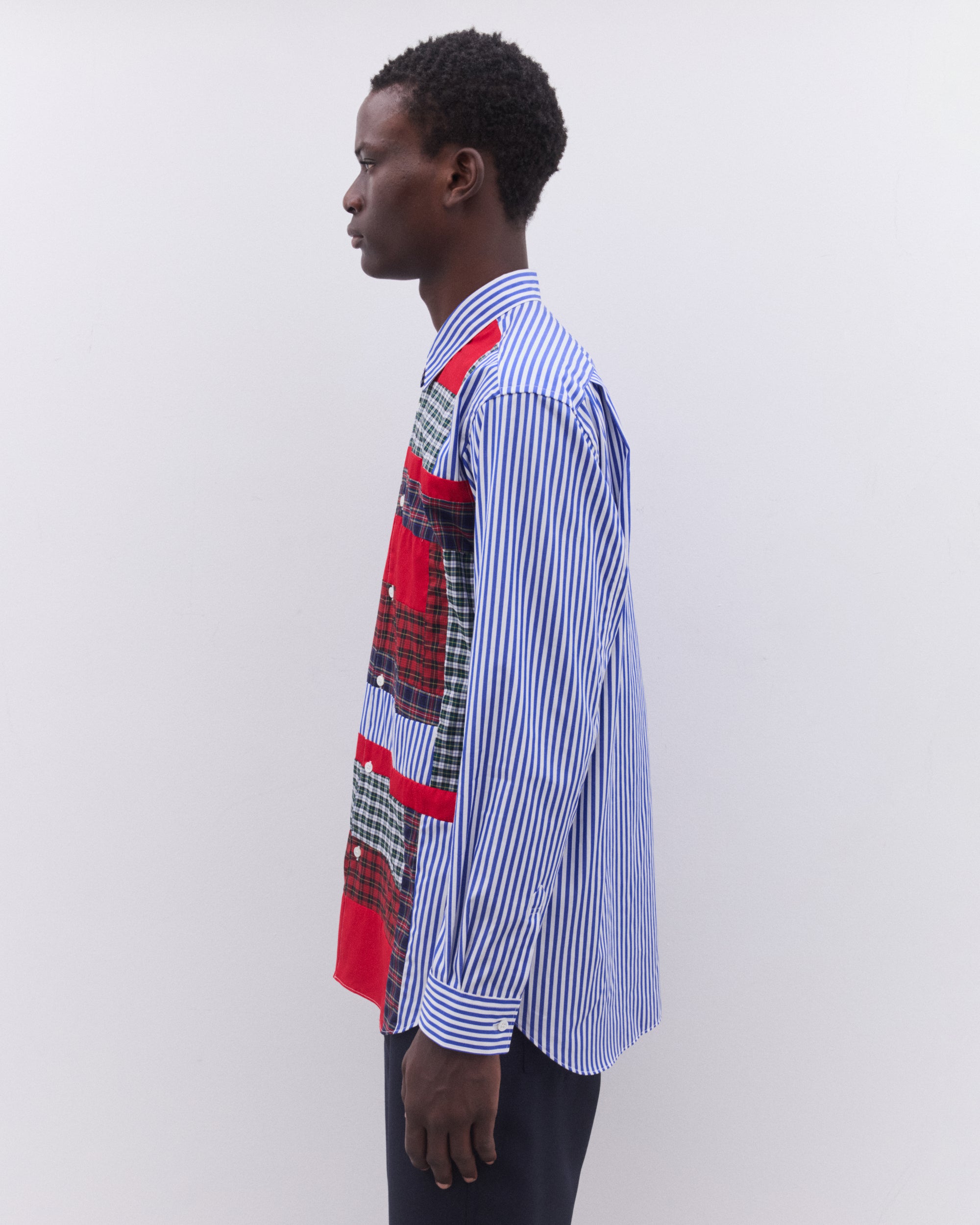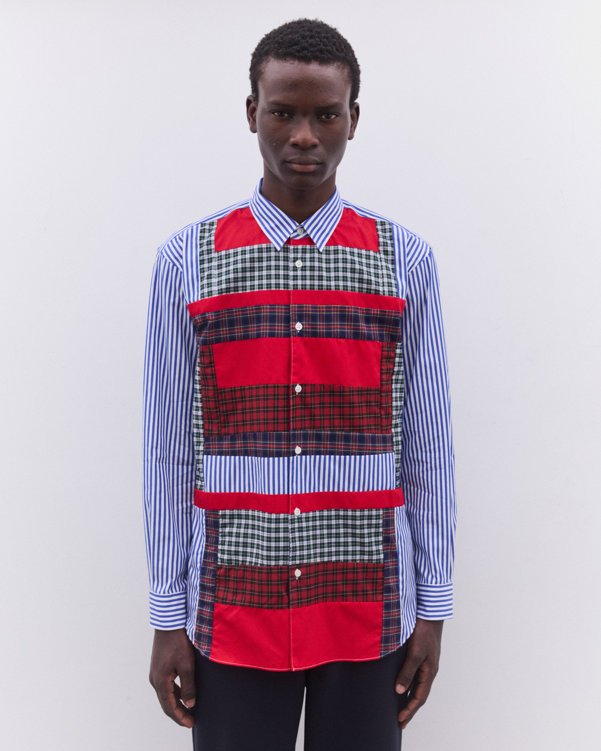 Point collarCurved hemPatch pocketButton placketButton cuffsStriped bodyTartan patch detail at front