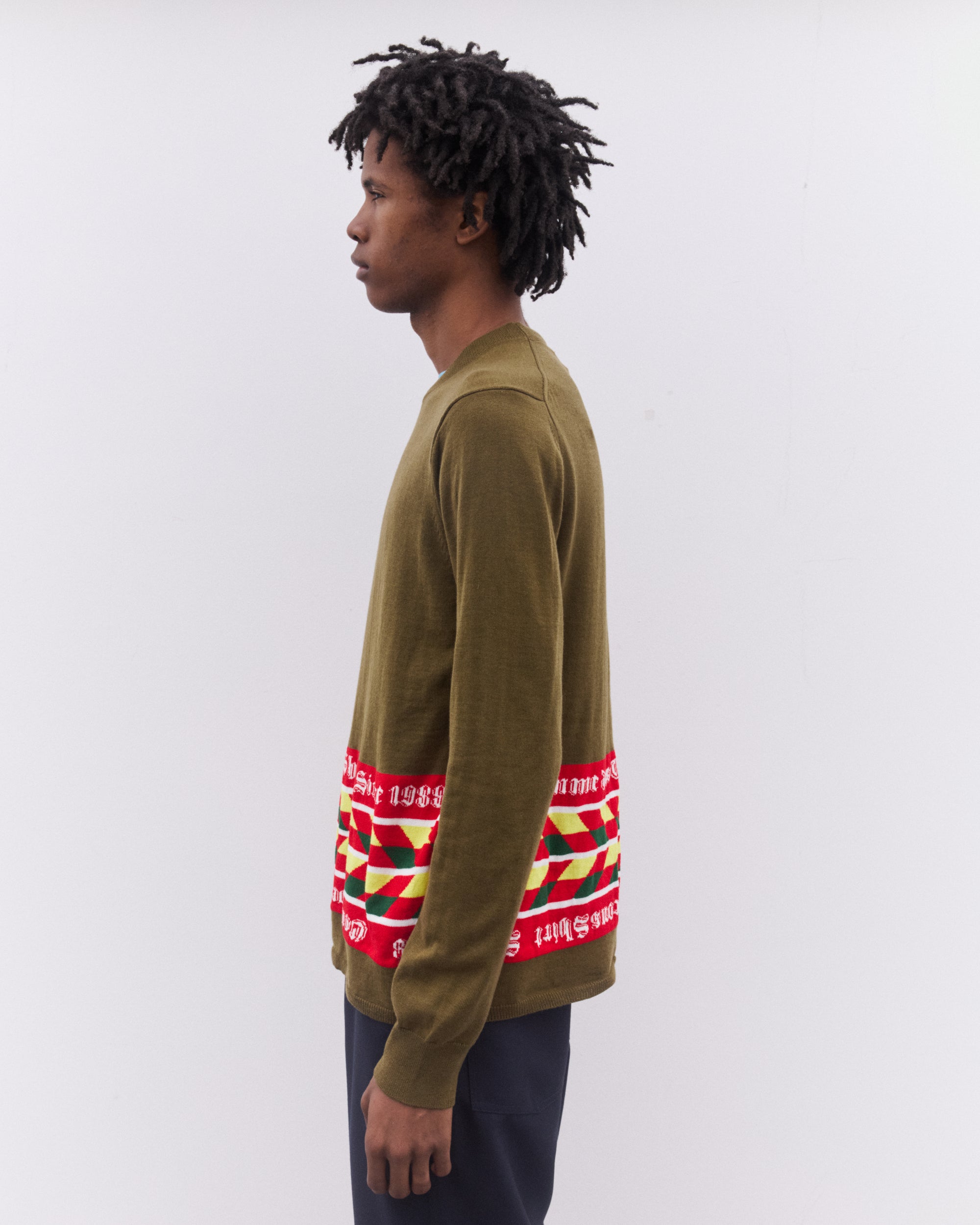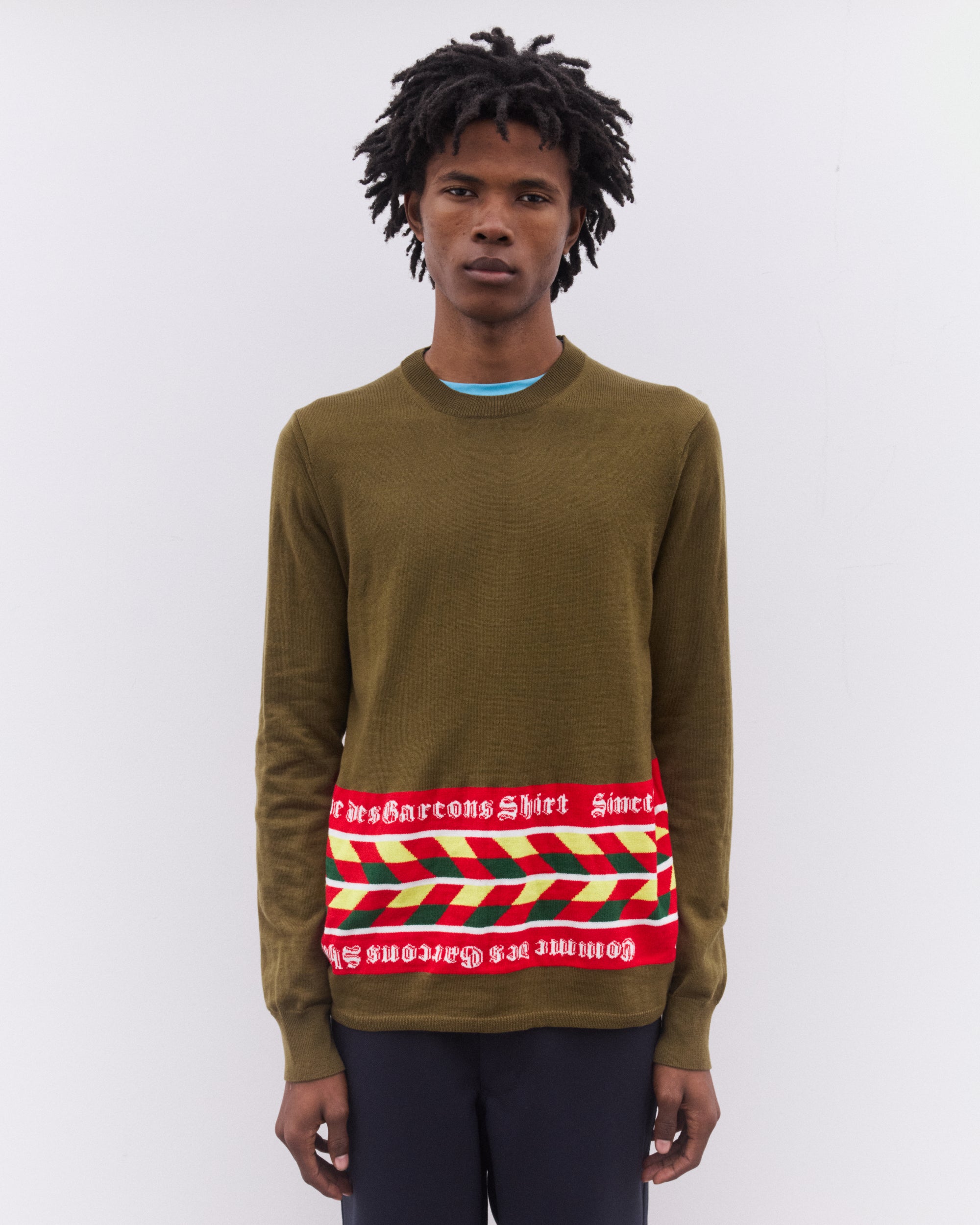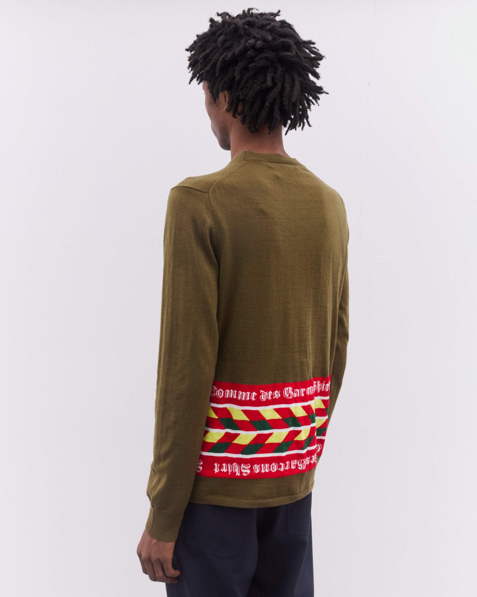 Round neckLong sleevesRib knit trimsIntarsia knit football scarf inspired design at hem