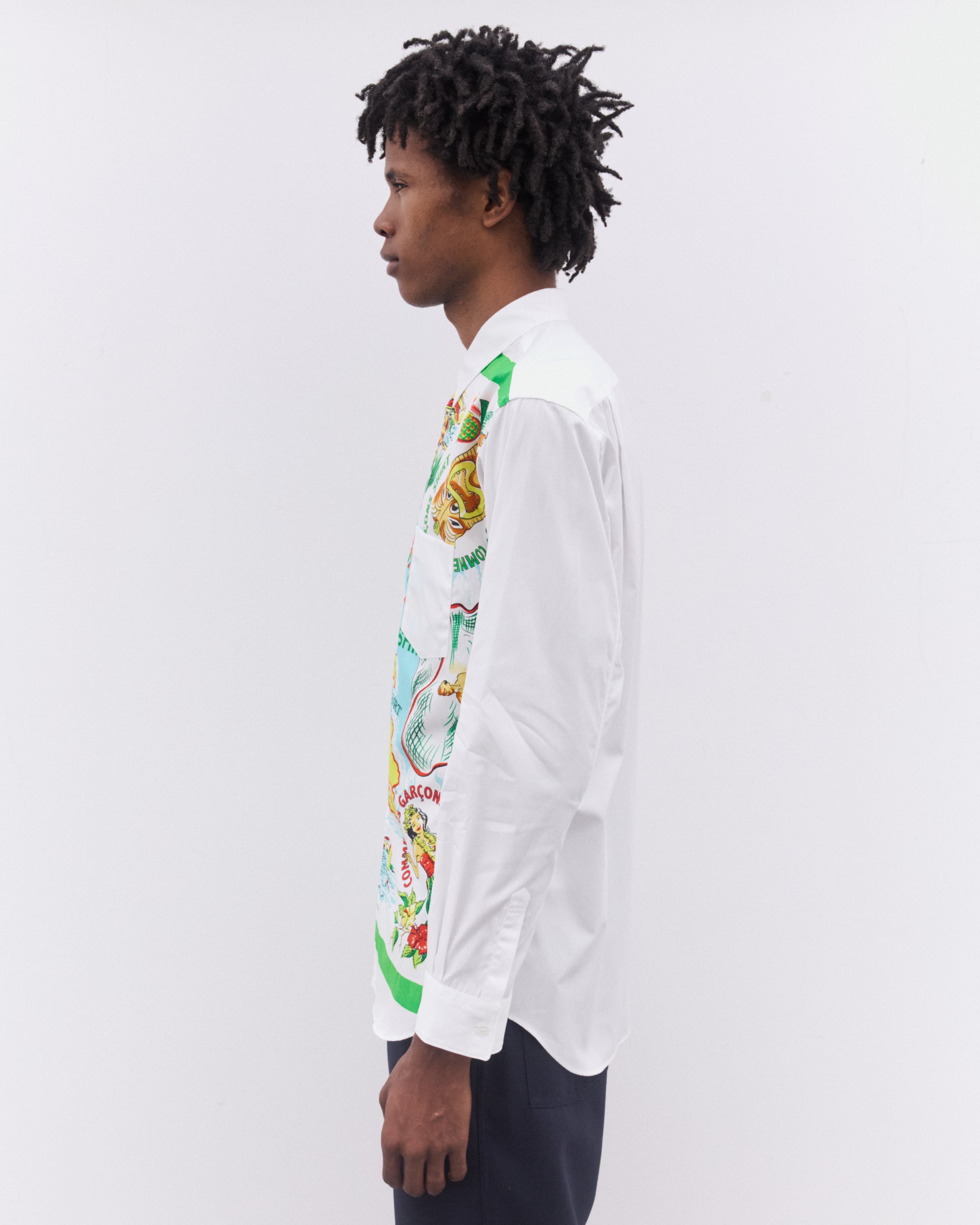 Point collarCurved hemPatch chest pocketButton placketButton cuffsRetro holiday print at body