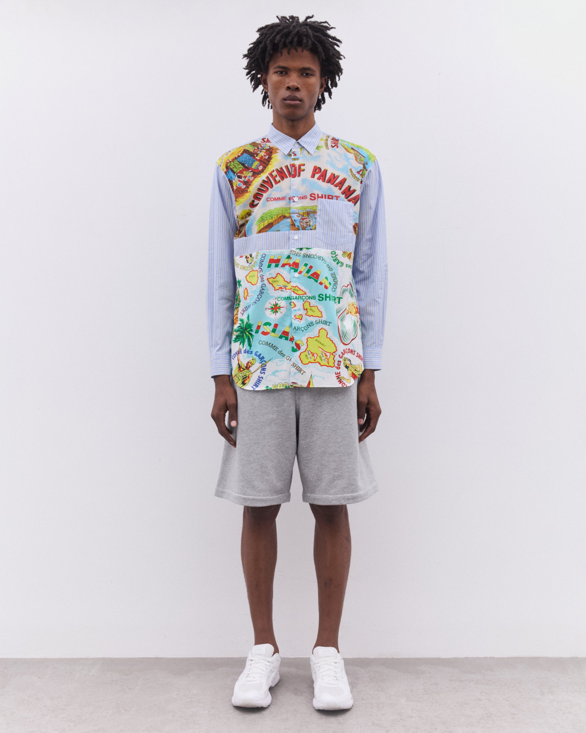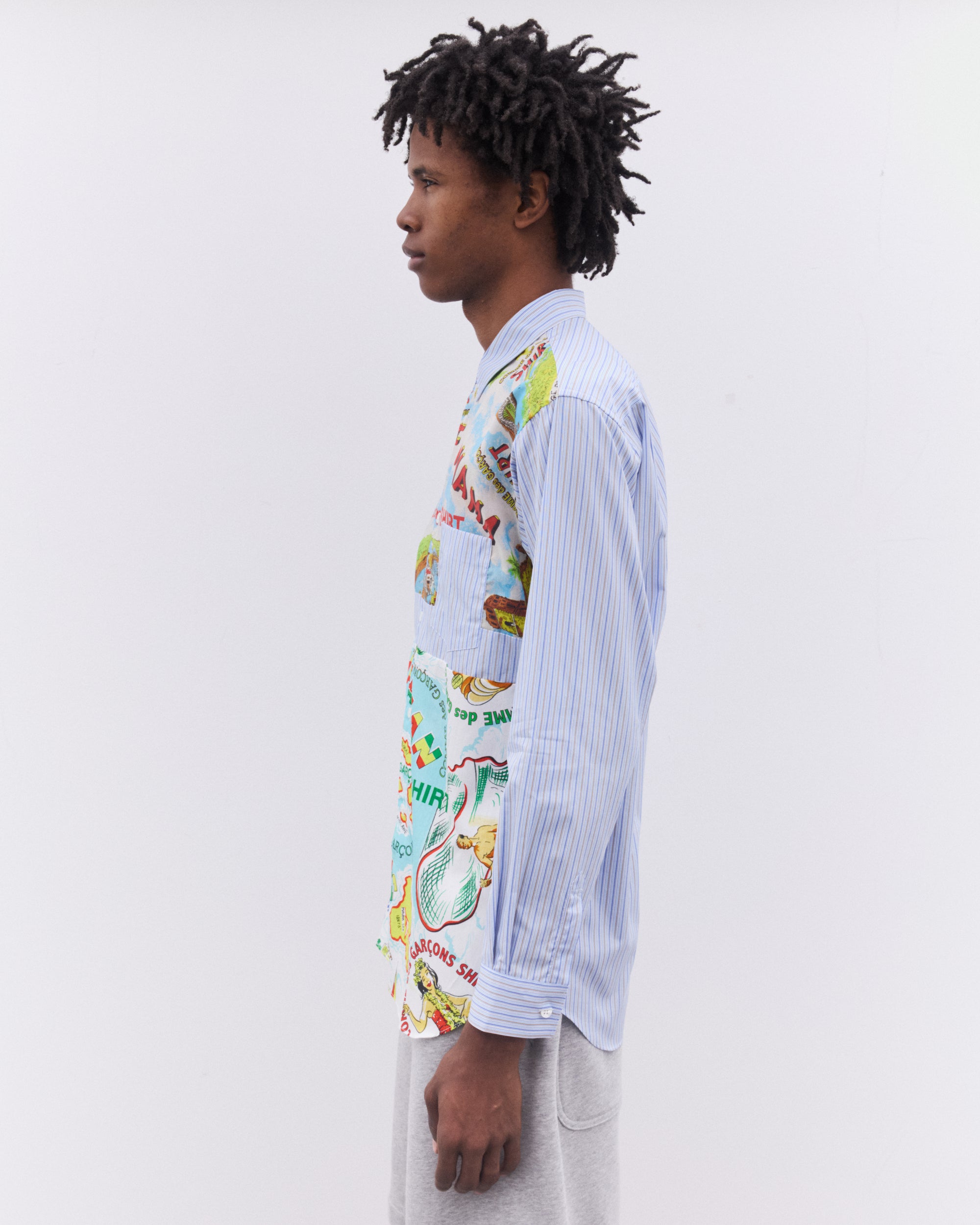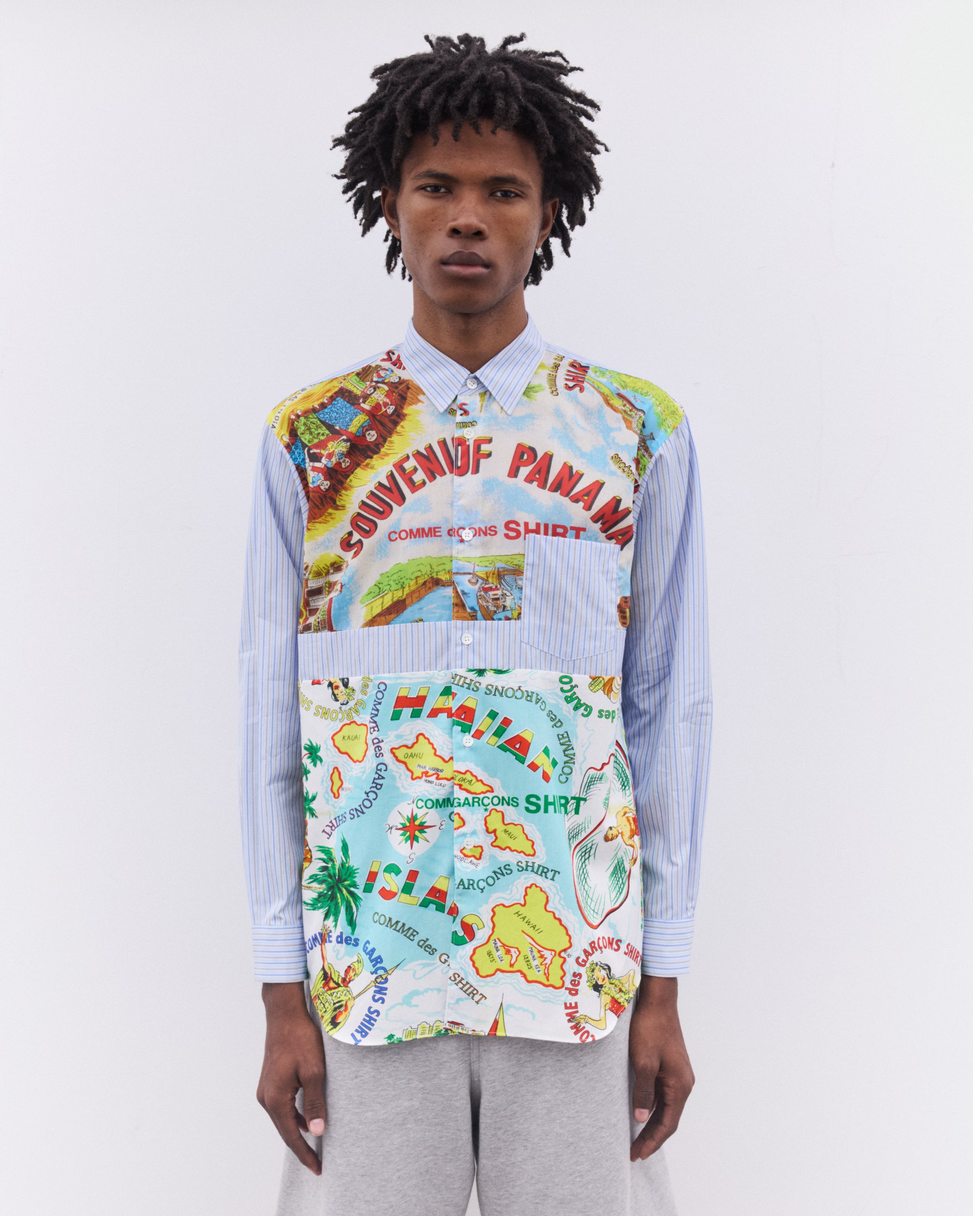 Point collarCurved hemPatch chest pocketButton placketButton cuffsPatchwork, retro souvenir print at body