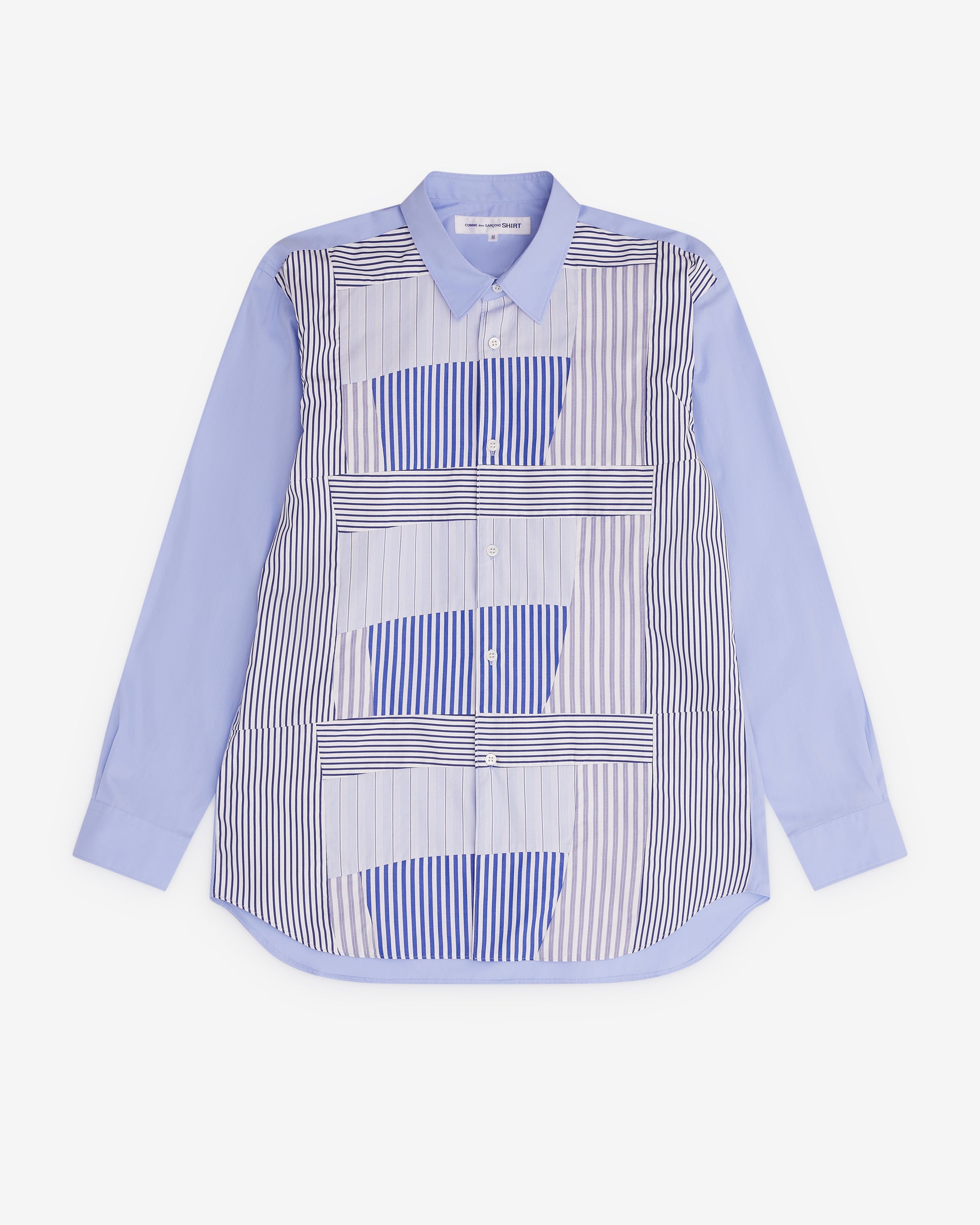 Point collarCurved hemPatch chest pocketButton placketButton cuffsPatchwork stripe panelling at body