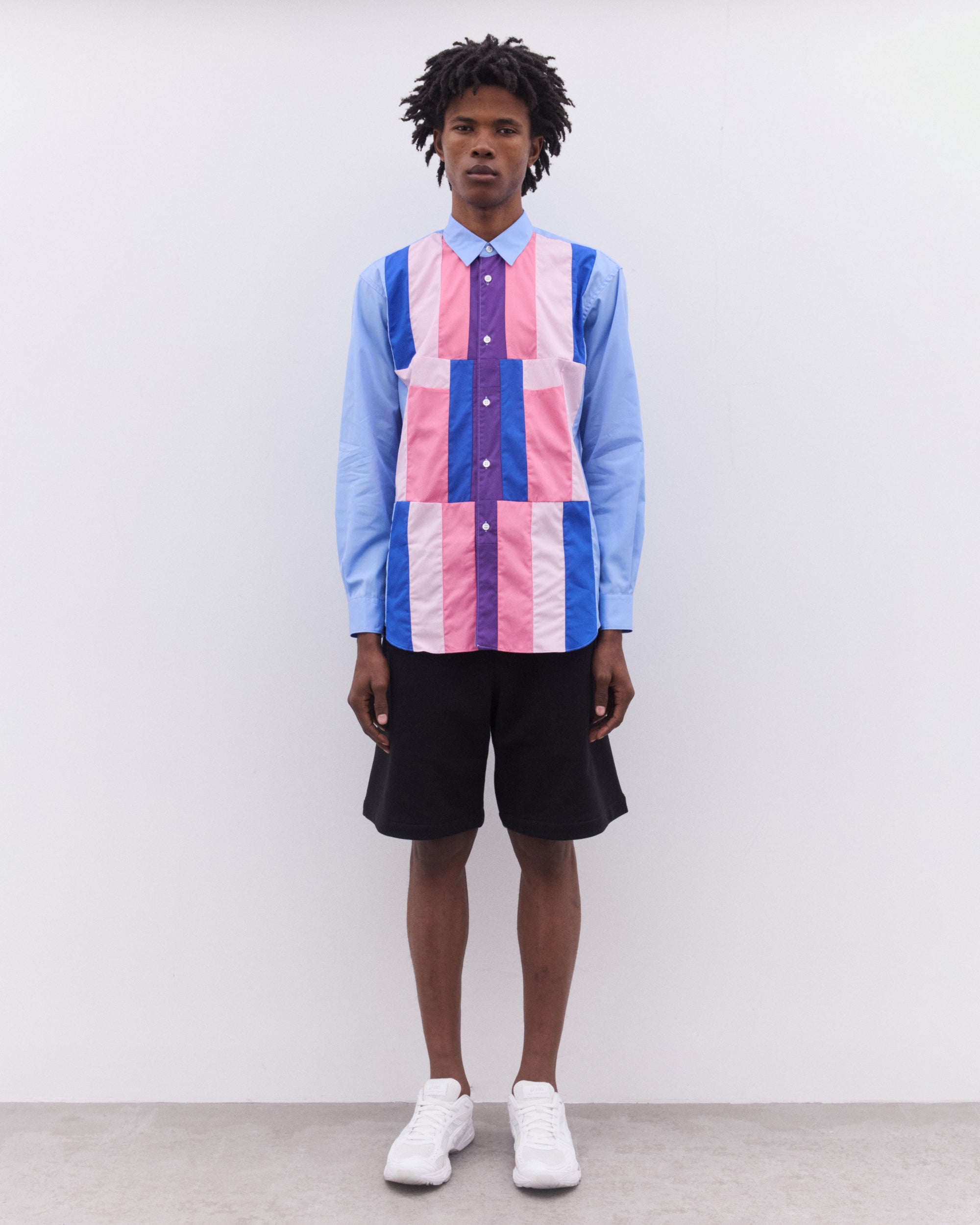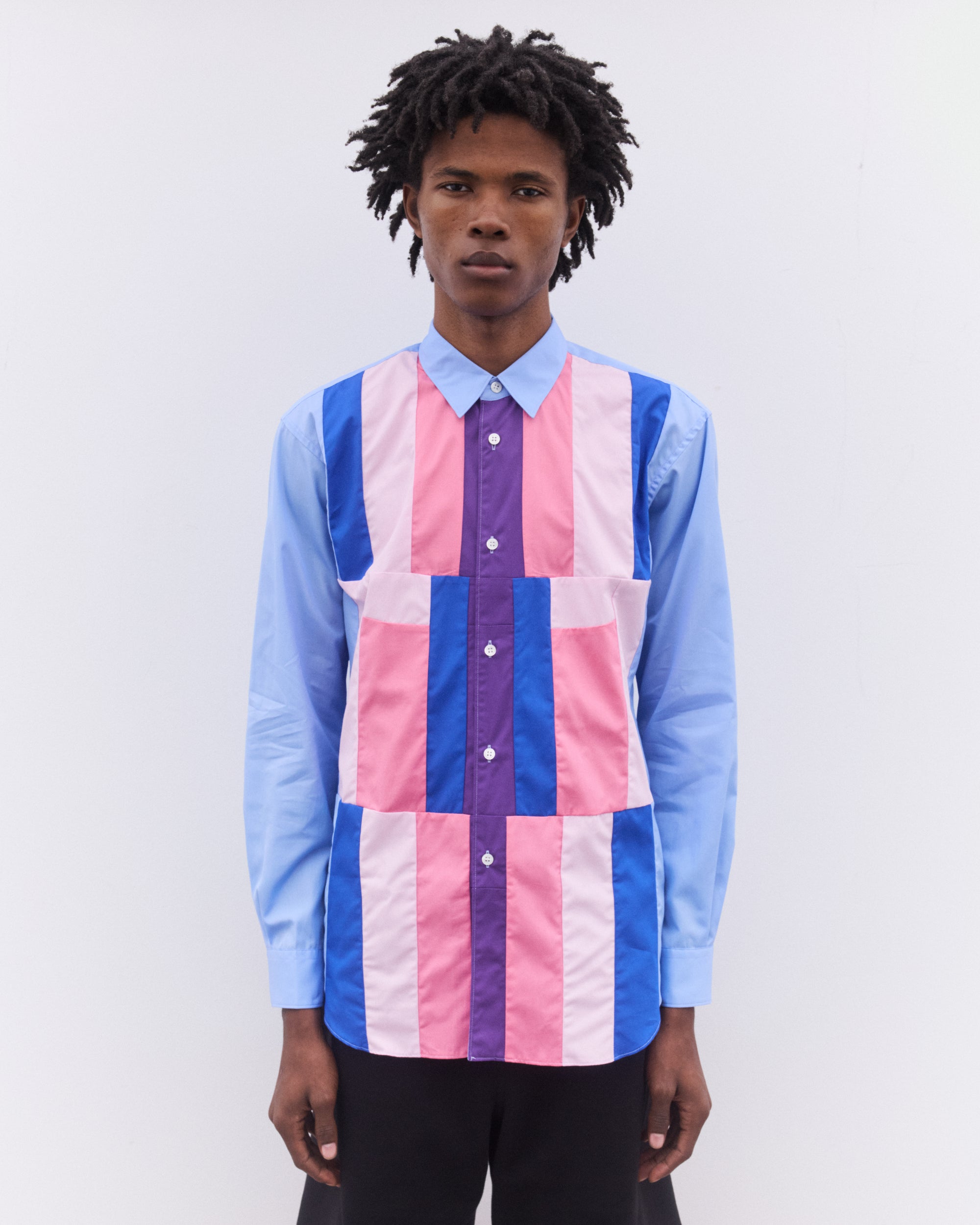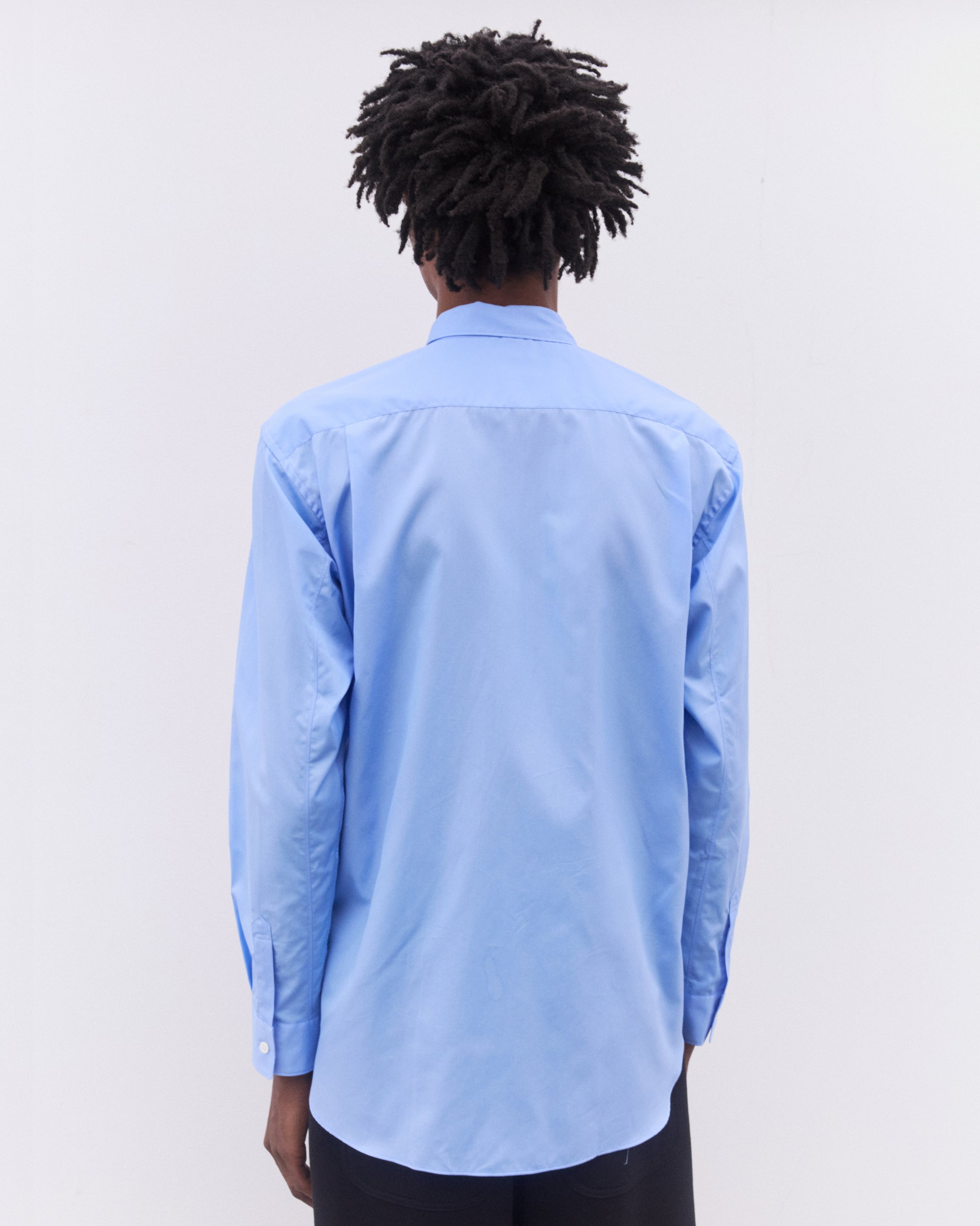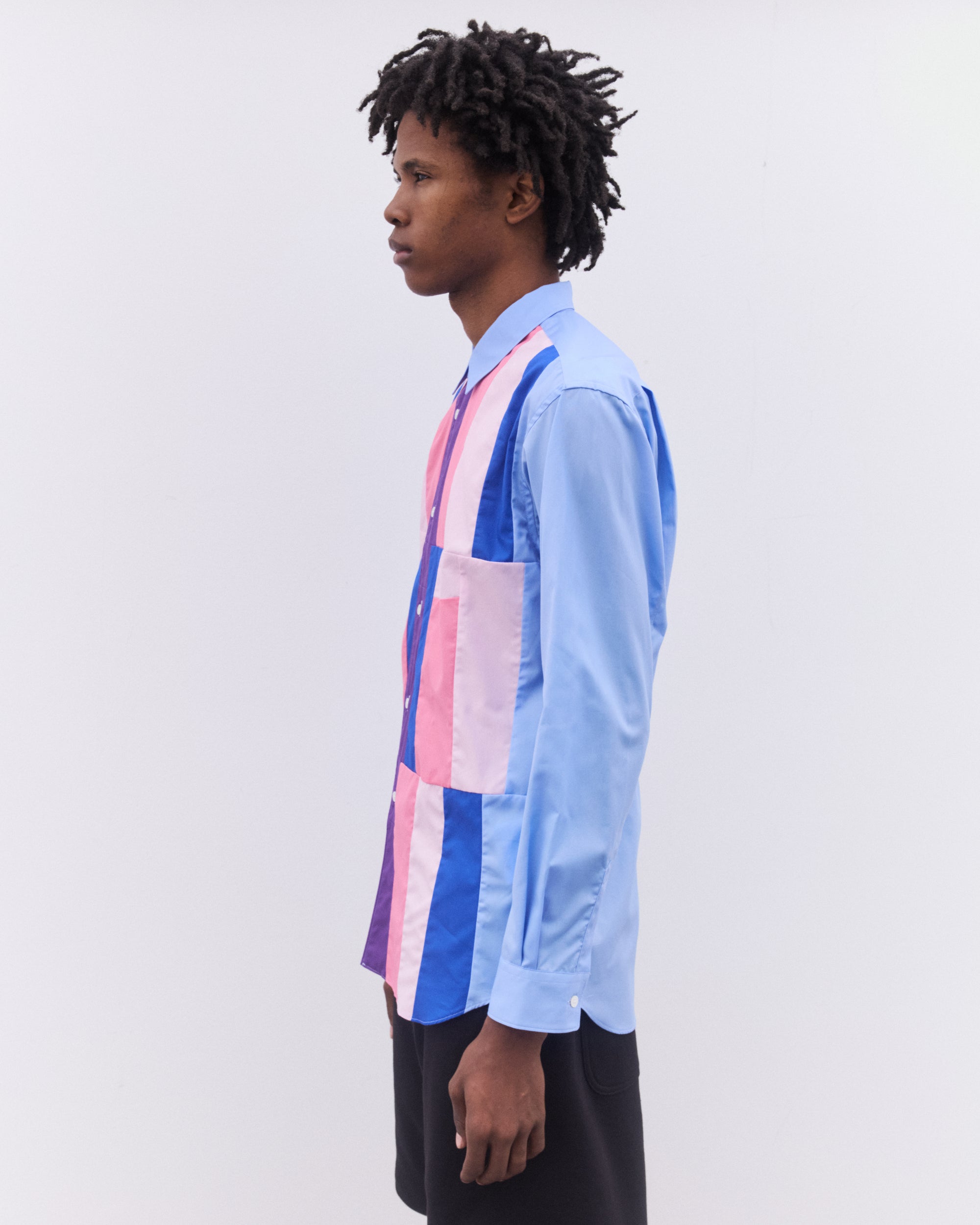 Point collarCurved hemPatch chest pocketButton placketButton cuffsColourblock panelling at body