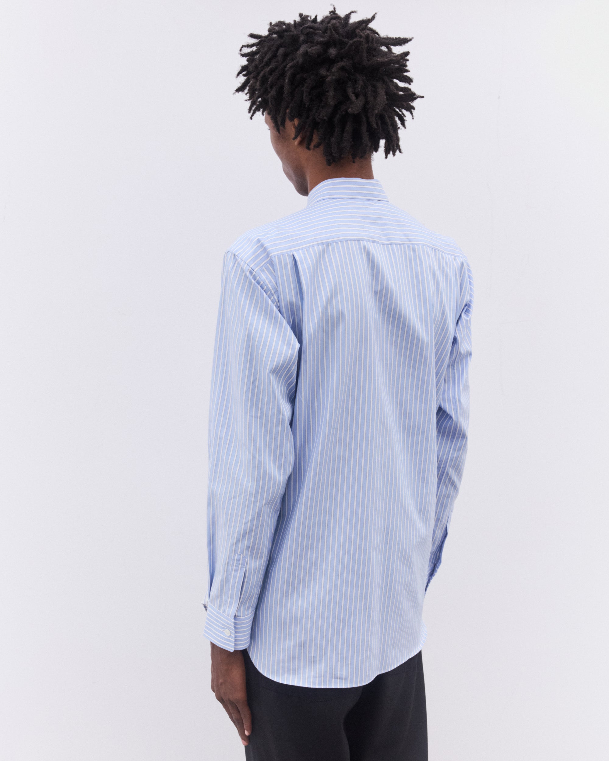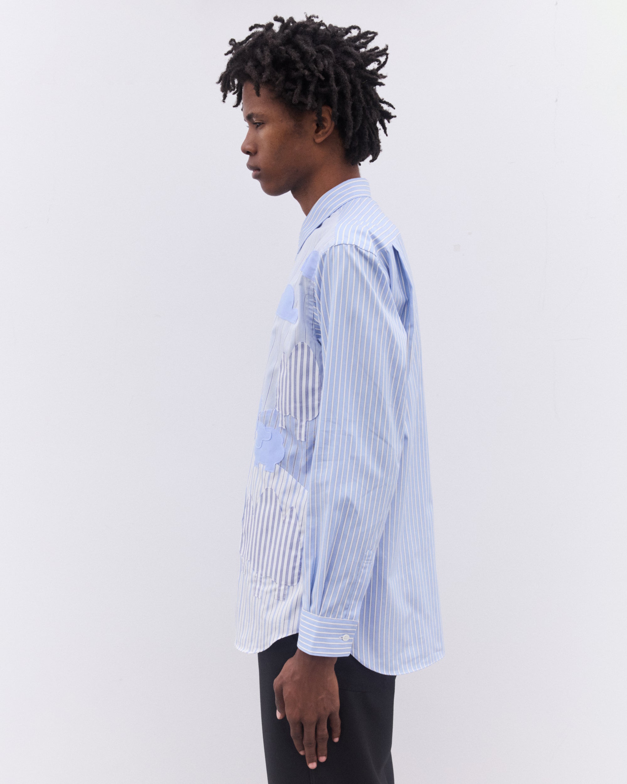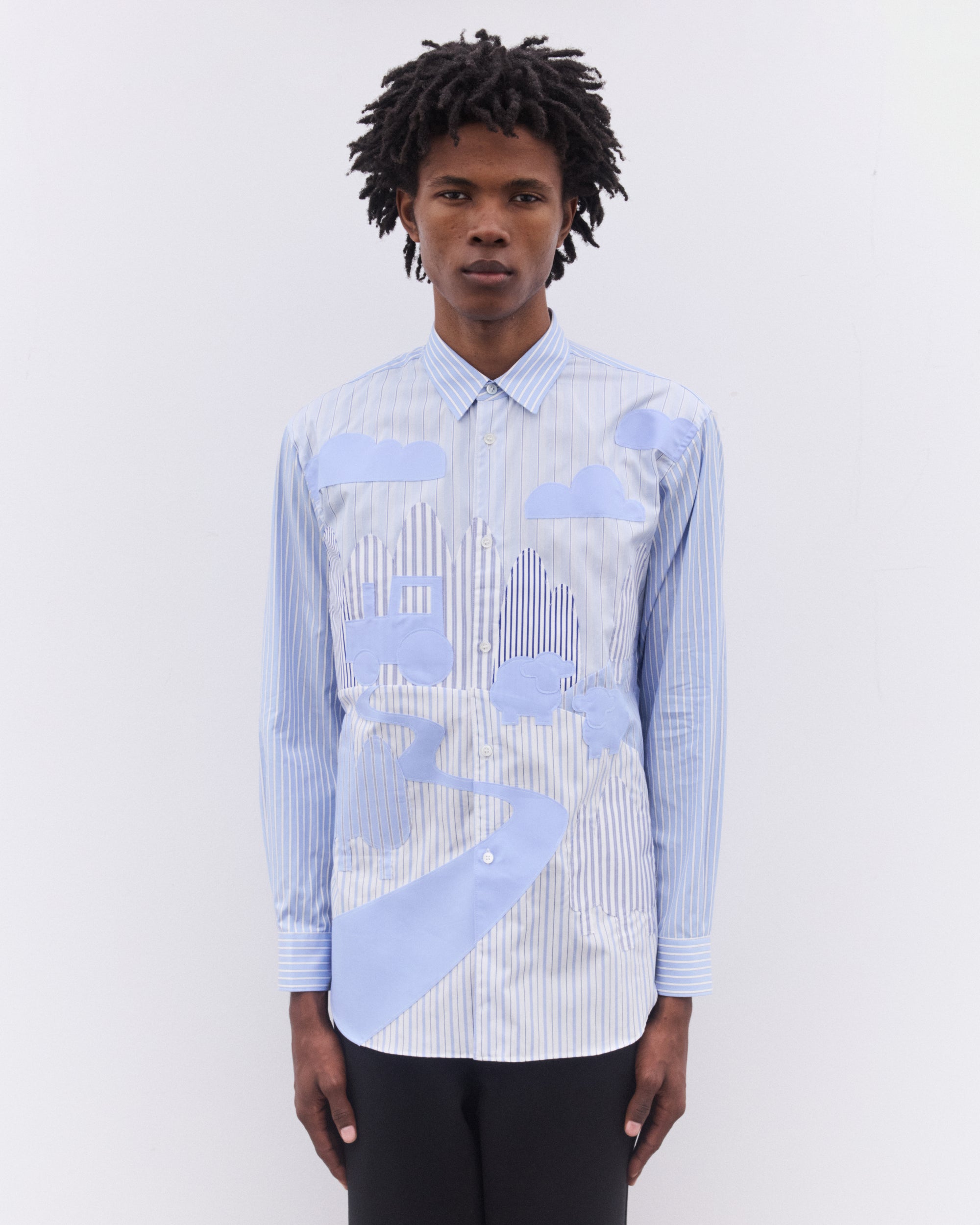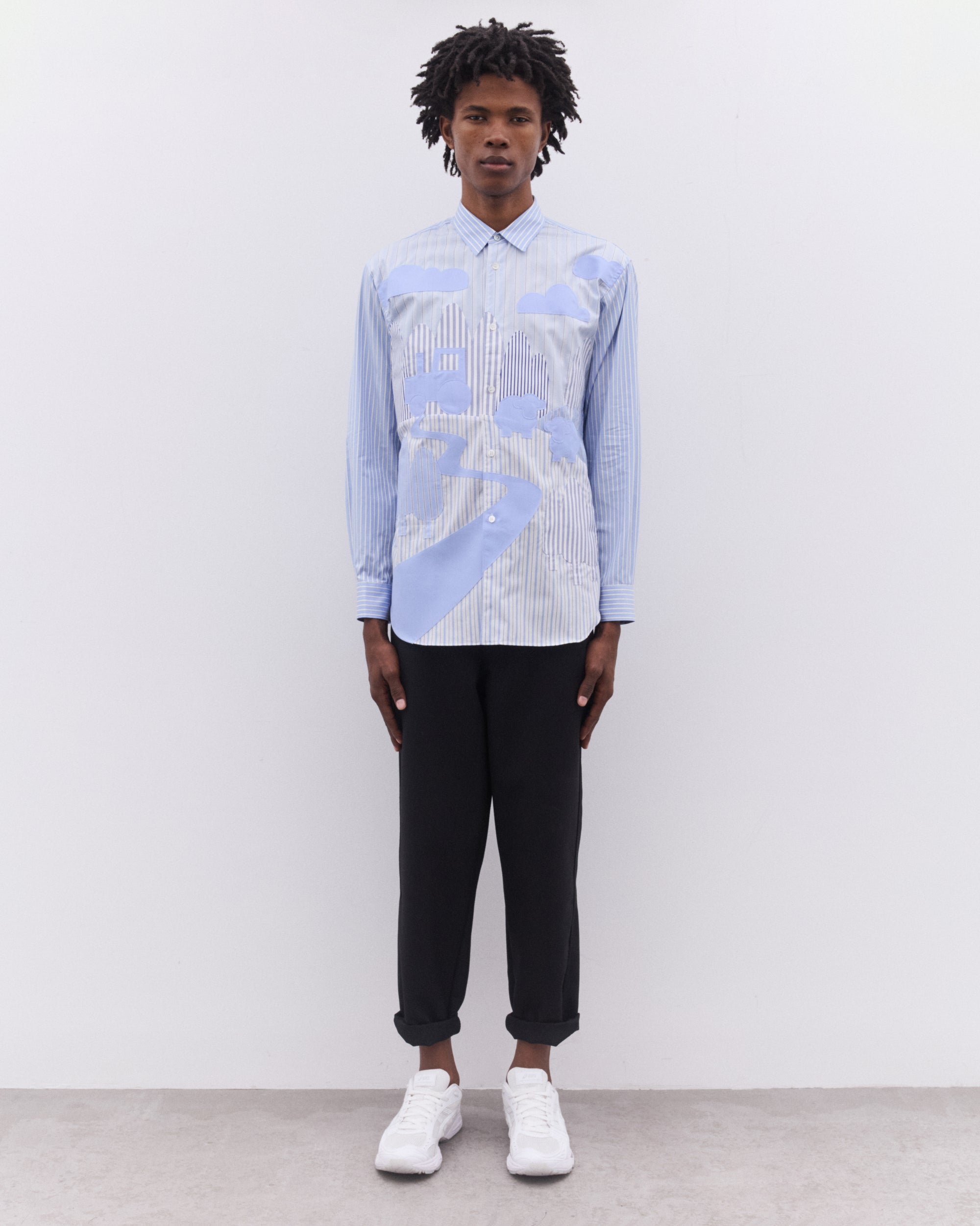 Point collarCurved hemPatch pocketButton placketButton cuffsSewn-on landscape scene