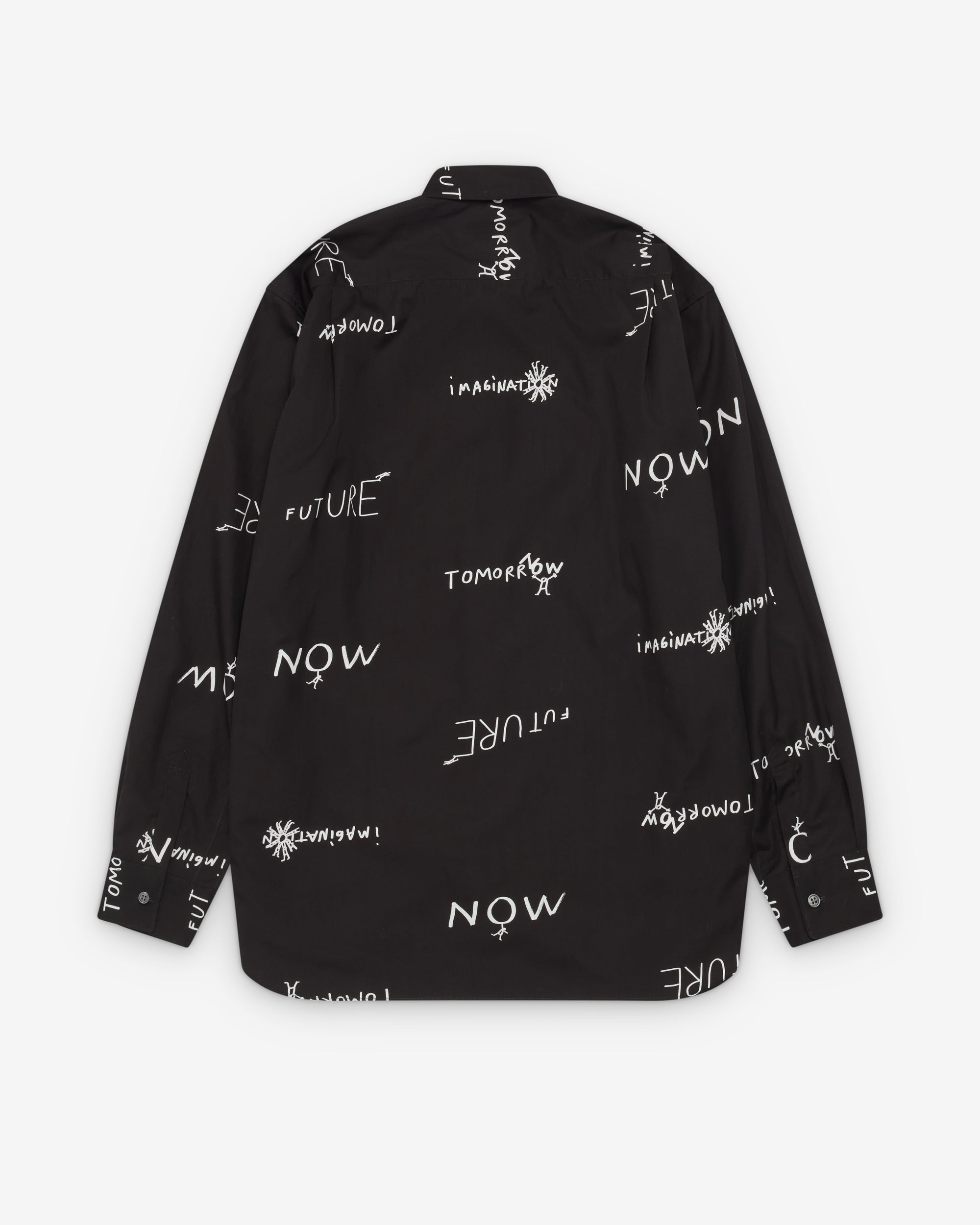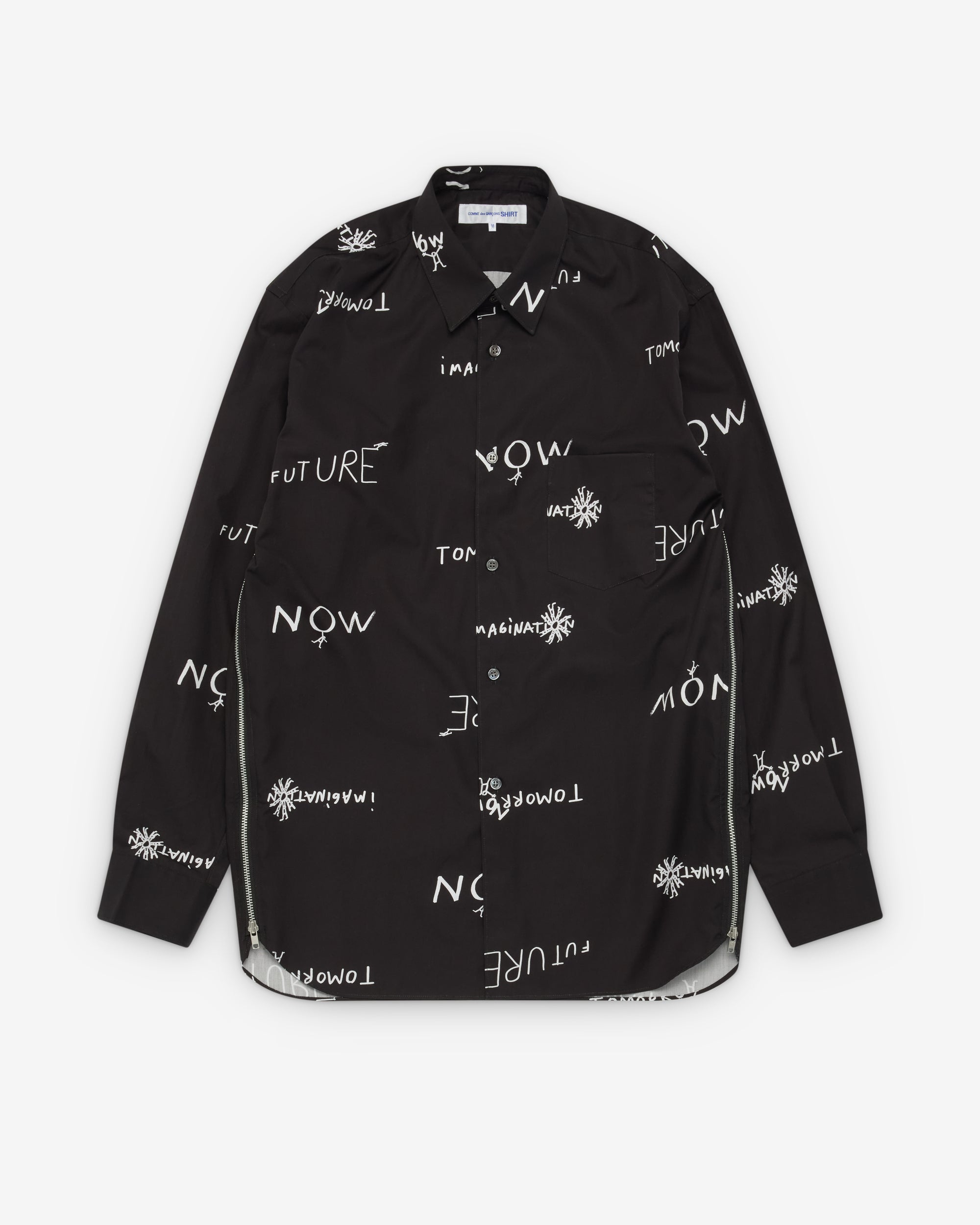Classic point collarFront mother of pearl buttonsPrinted slogans all overAdjustable zip side seamsButton close cuffs