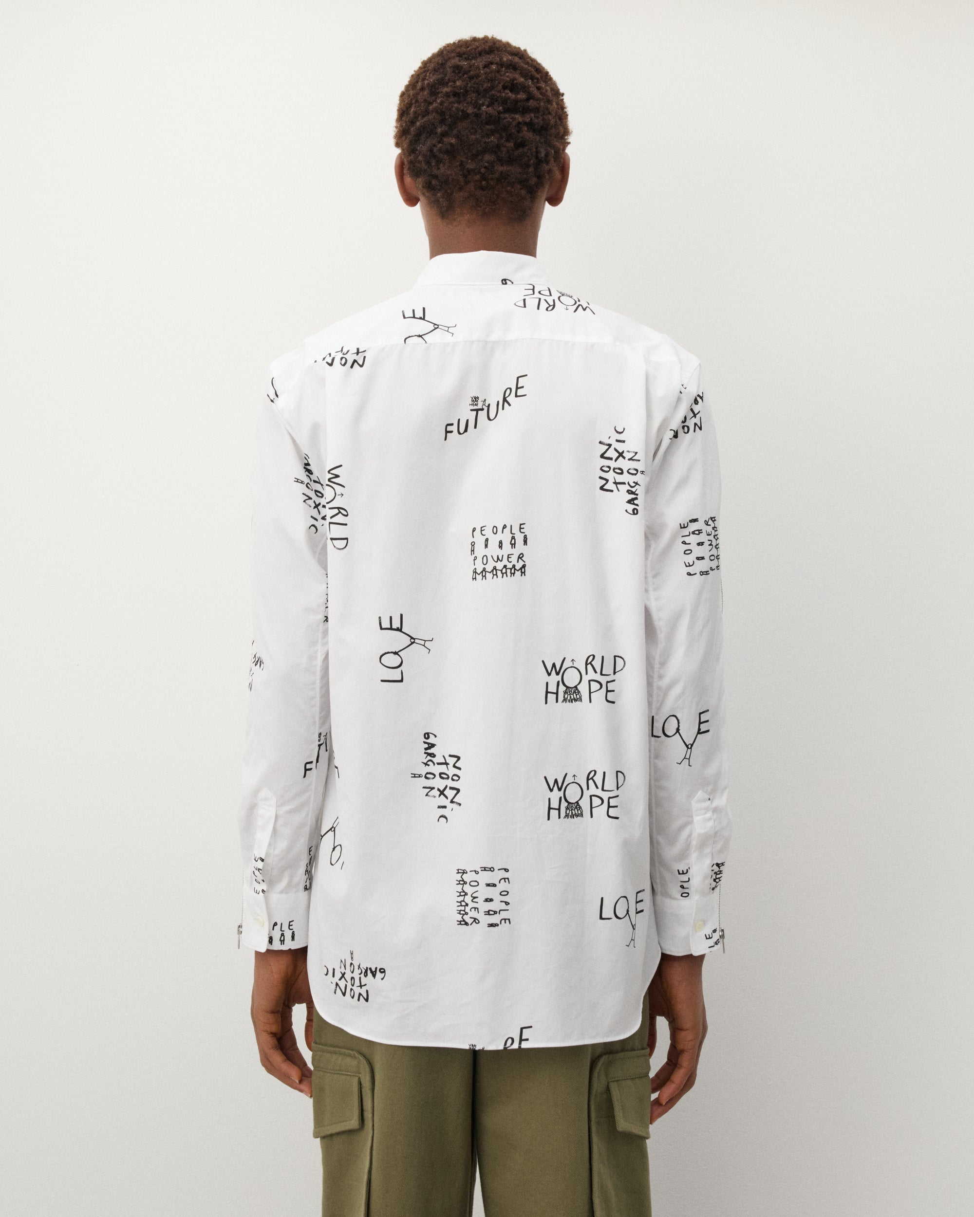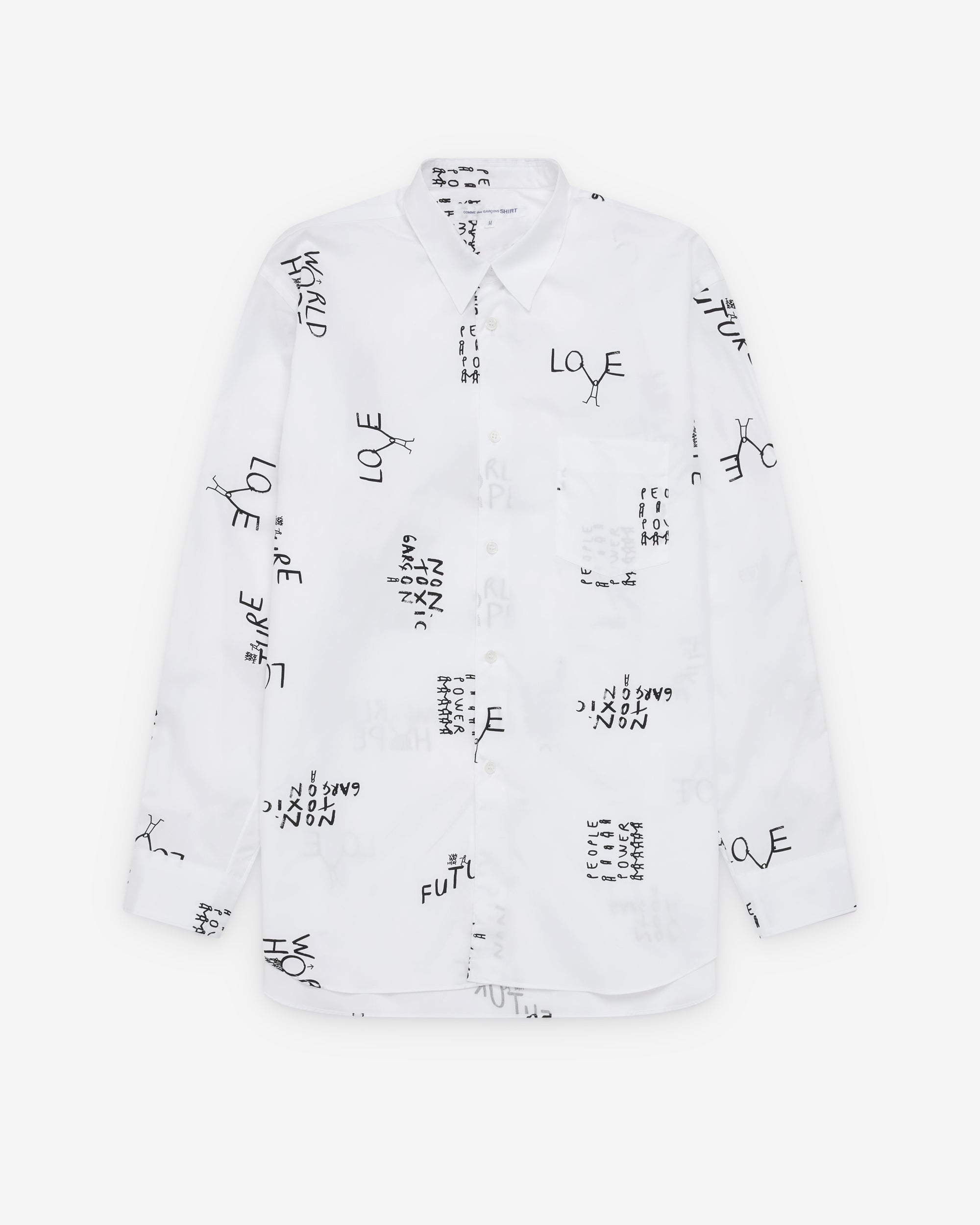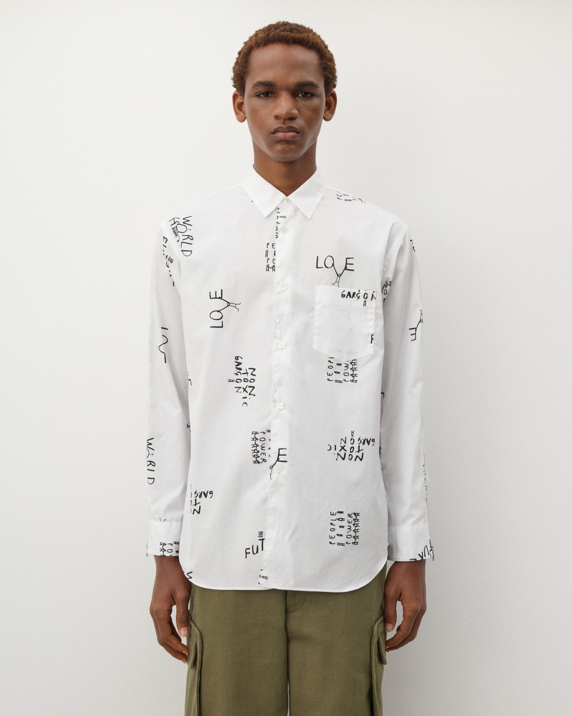 Classic point collarPrinted graphics throughoutFront mother of pearl button placketShirttail curved hemCotton poplin fabricButton close cuffs