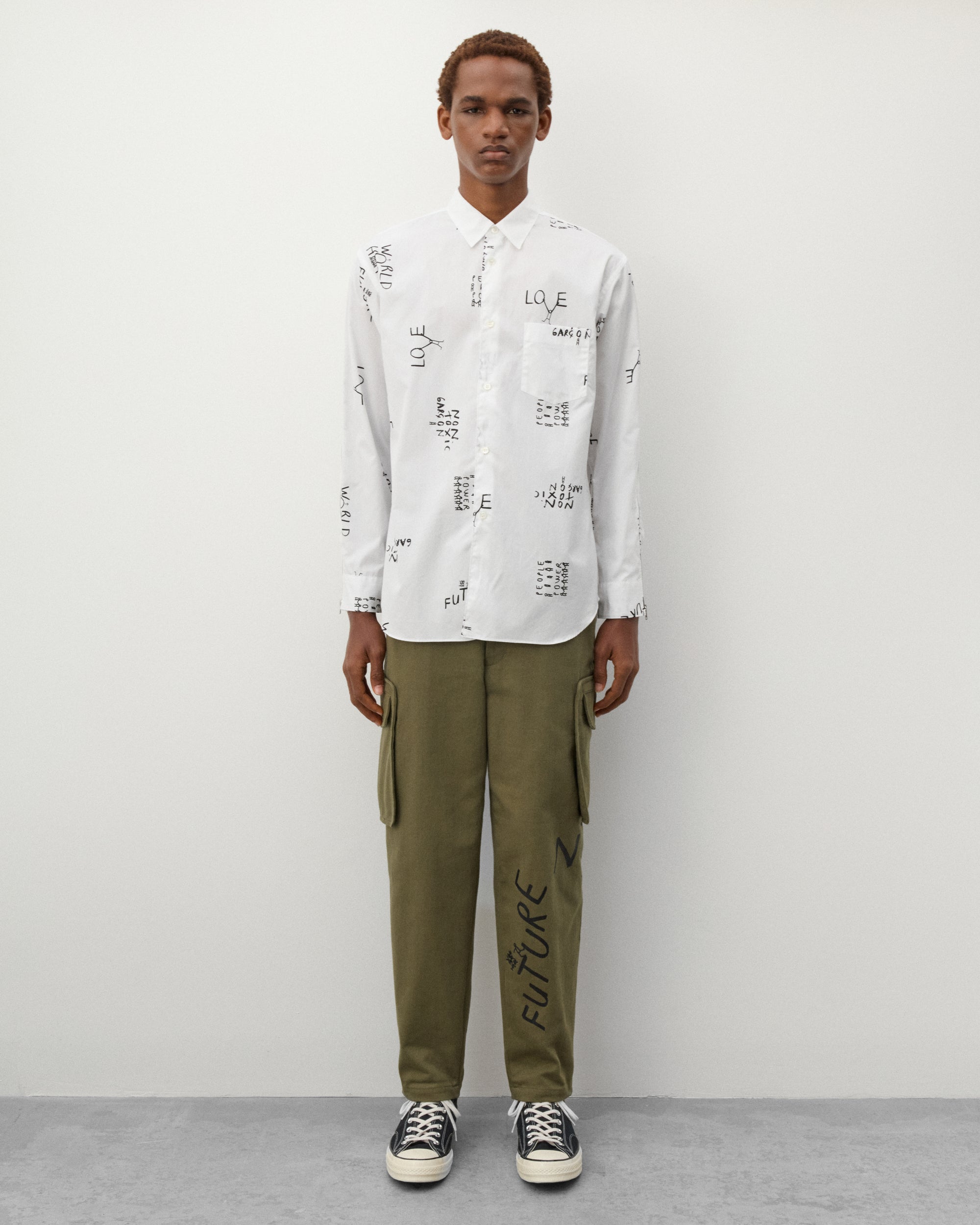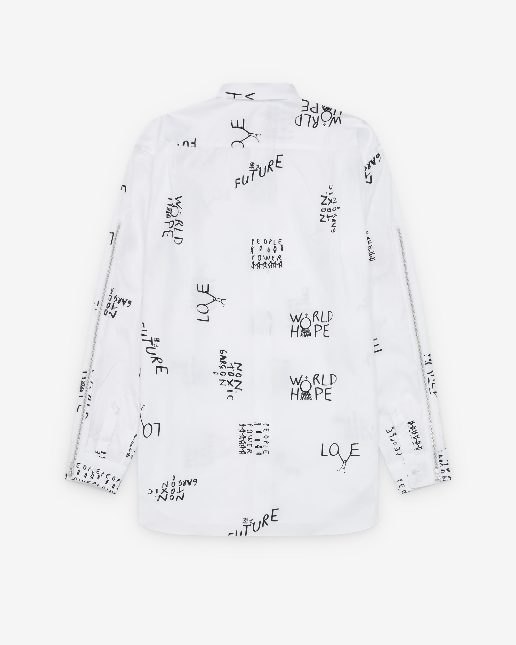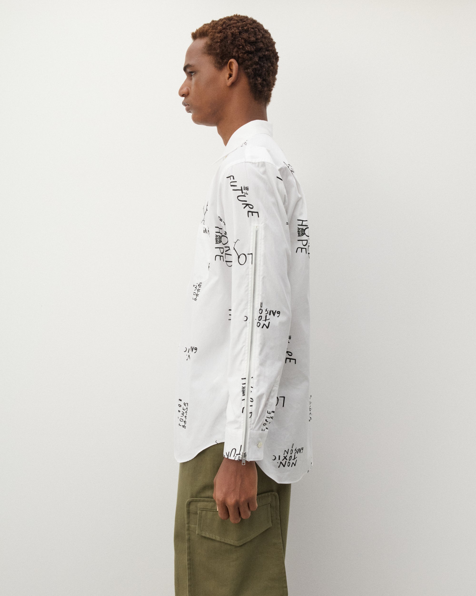 Classic point collarPrinted graphics throughoutFront mother of pearl button placketShirttail curved hemCotton poplin fabricButton close cuffs