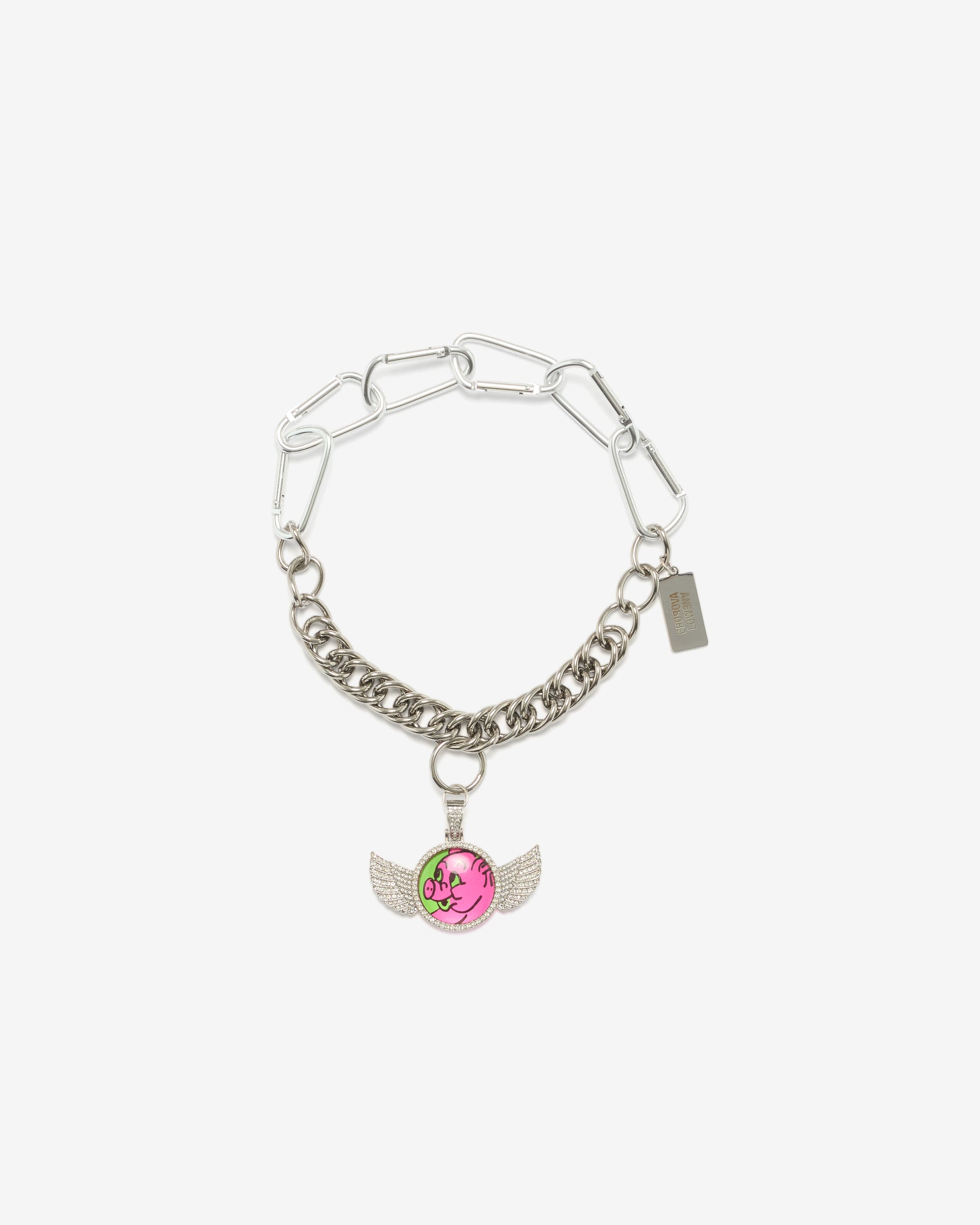 Adjustable carabiner chainCharm at dropEmbossed logo plaque Silver-tone