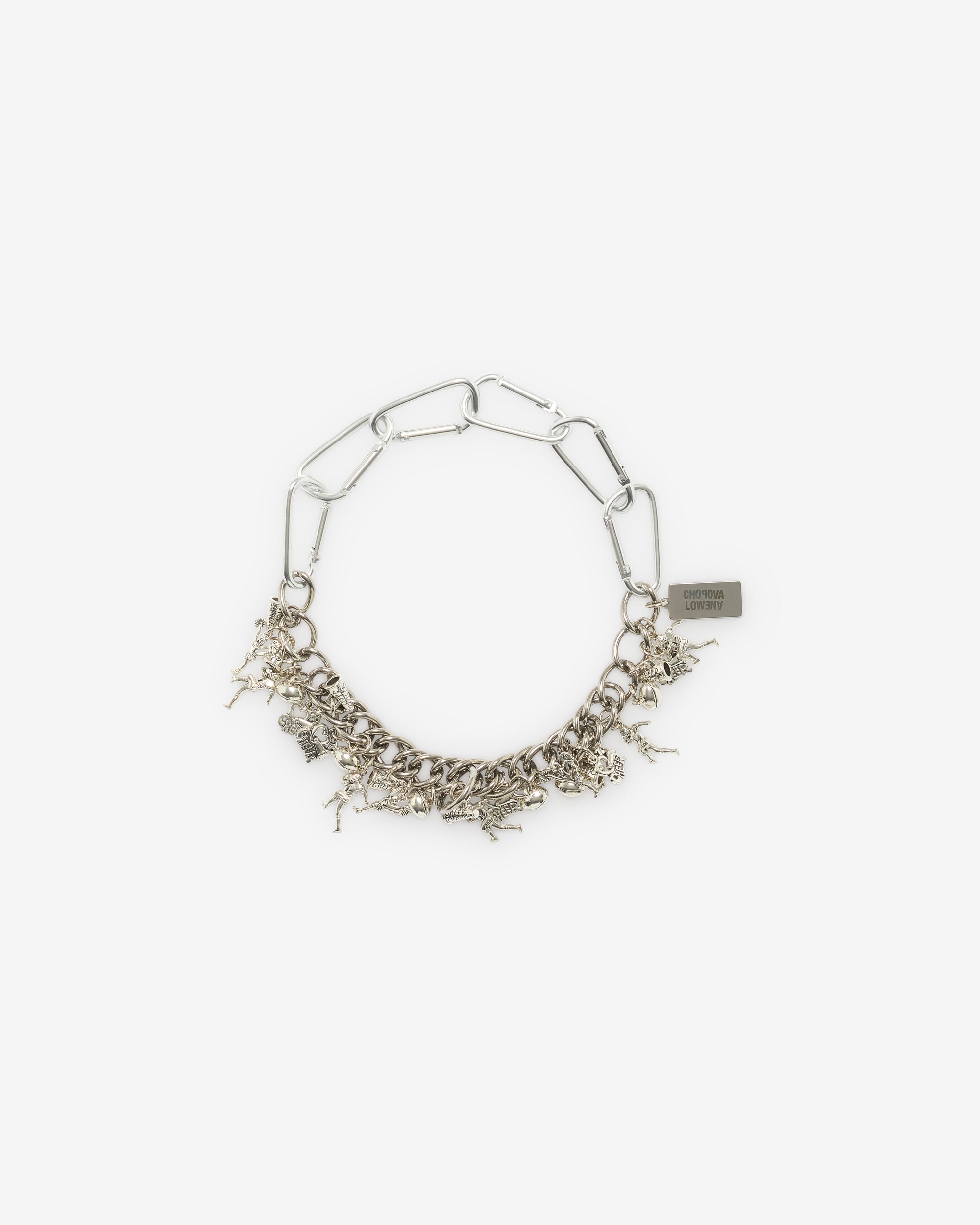 Adjustable carabiner chainAttached charmsEmbossed logo plaque Silver-tone