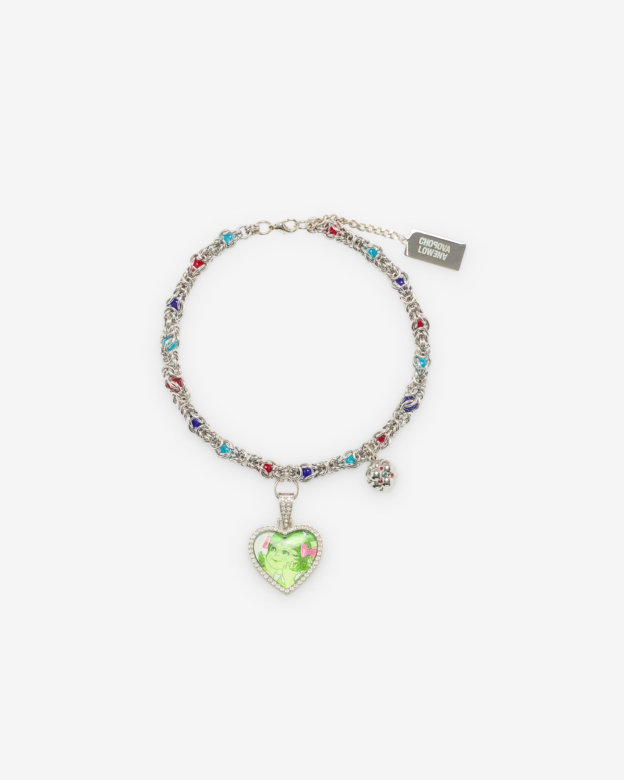 Adjustable carabiner chainCharm at dropEmbossed logo plaque Silver-tone