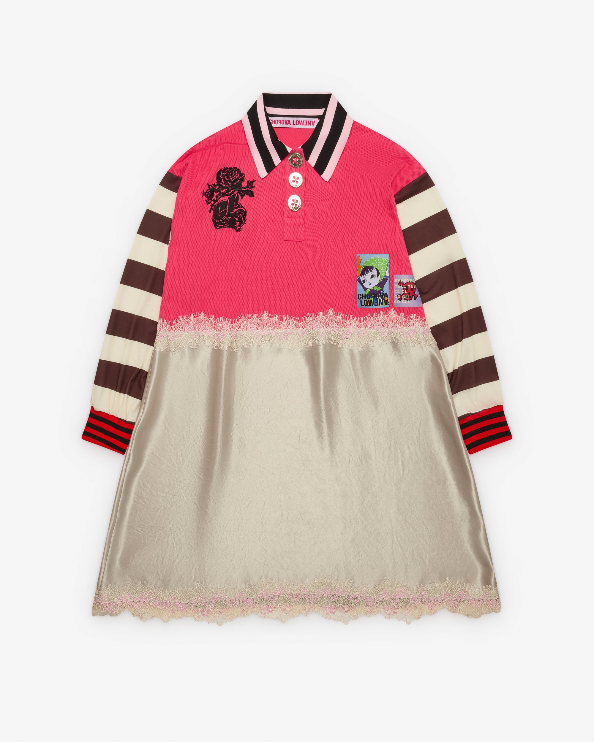 Polo collarContrast sleeves and collarGraphic patches at frontSatin attached skirt Lace trimKnee length