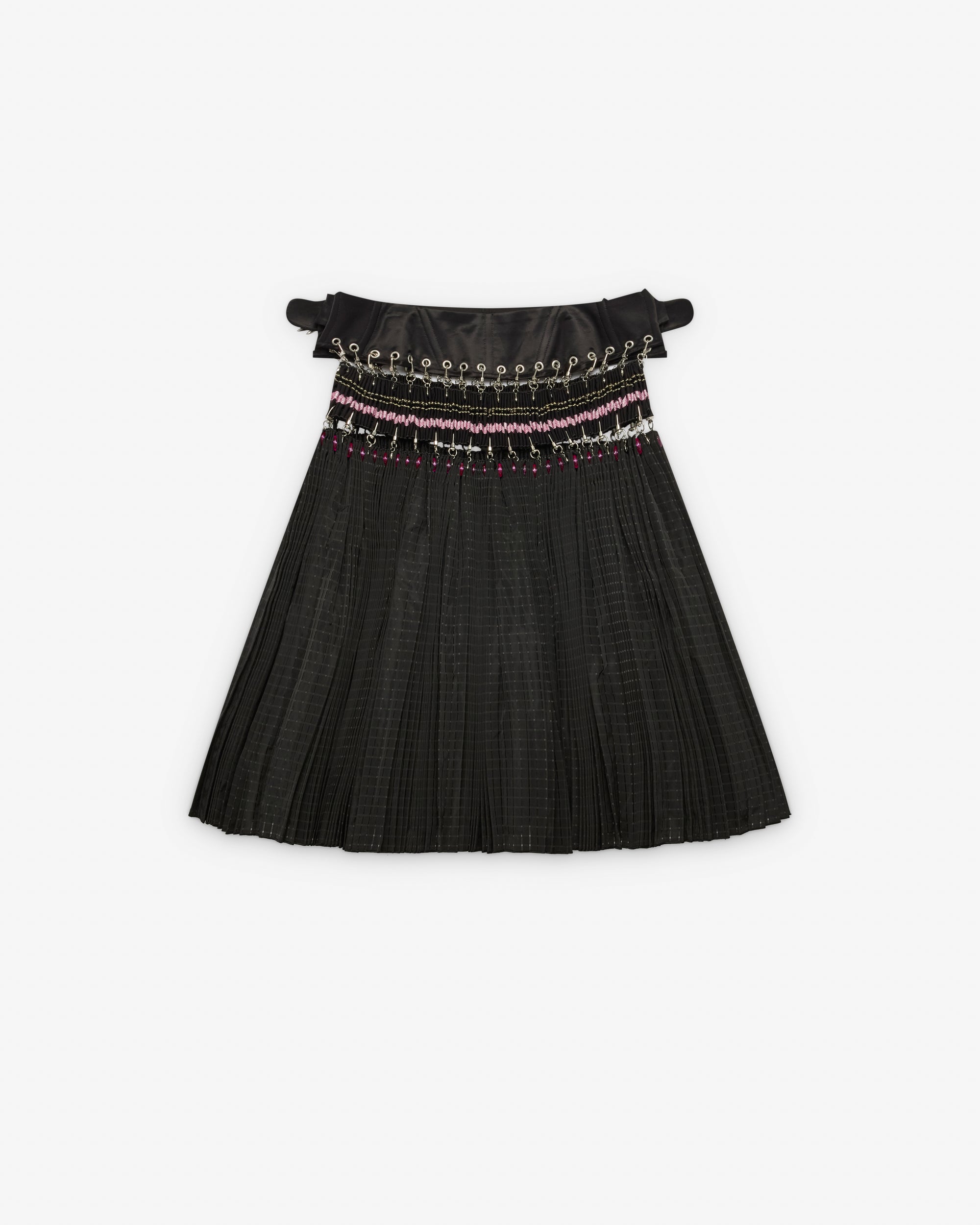 Satin waistbandSkirt affixed by carabinersPleated skirtBelow knee length Silvertone hardware