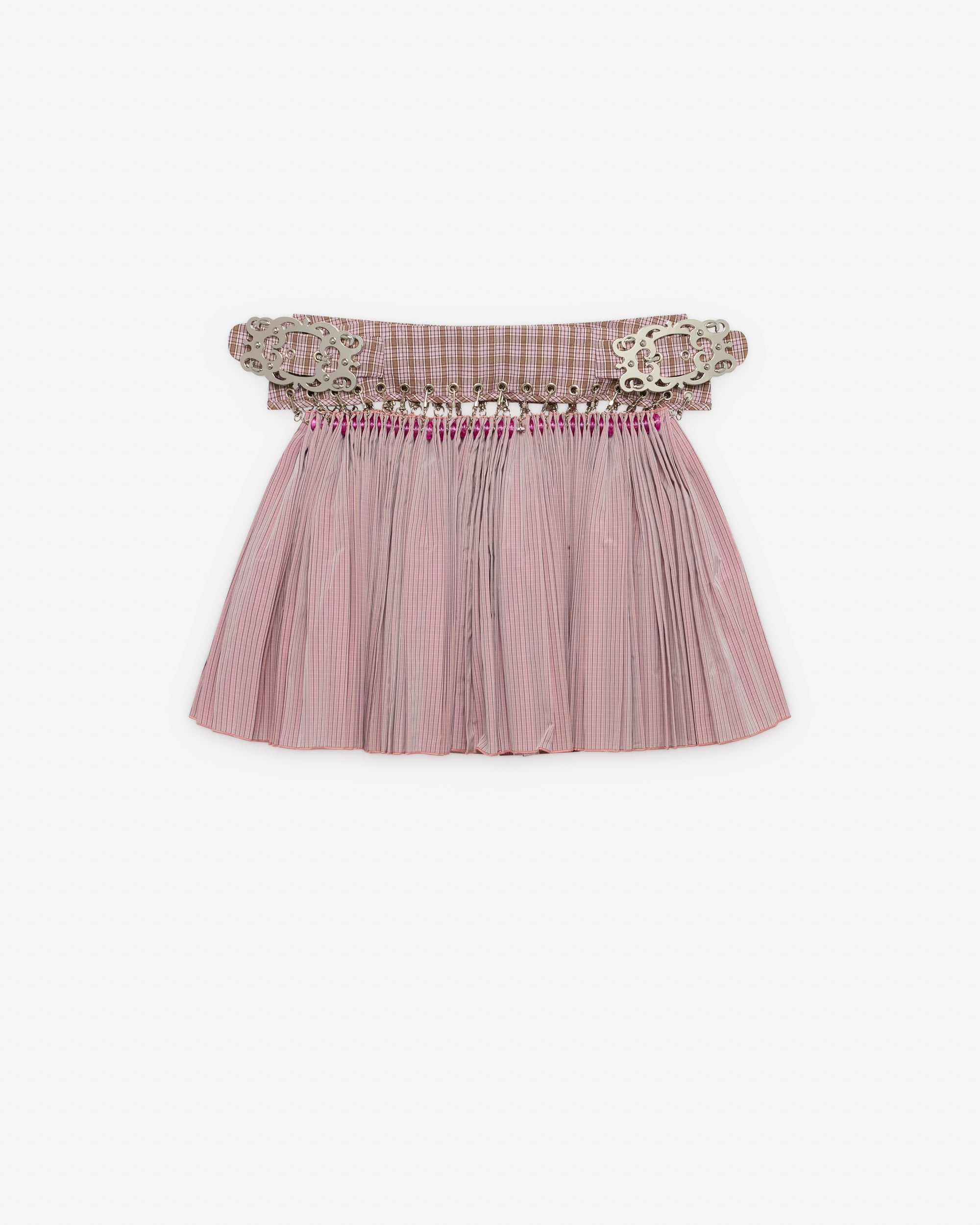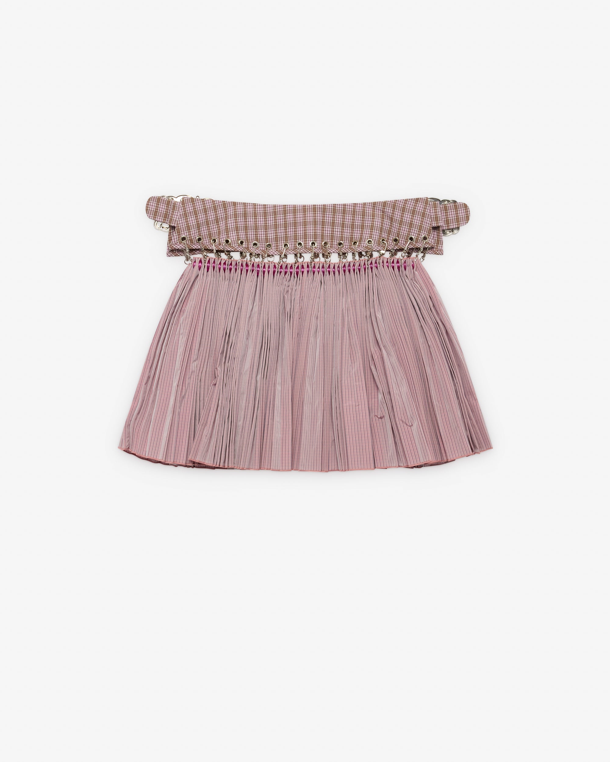Check waist bandSkirt affixed by carabinersPleated skirtMini skirt lengthSilvertone hardware