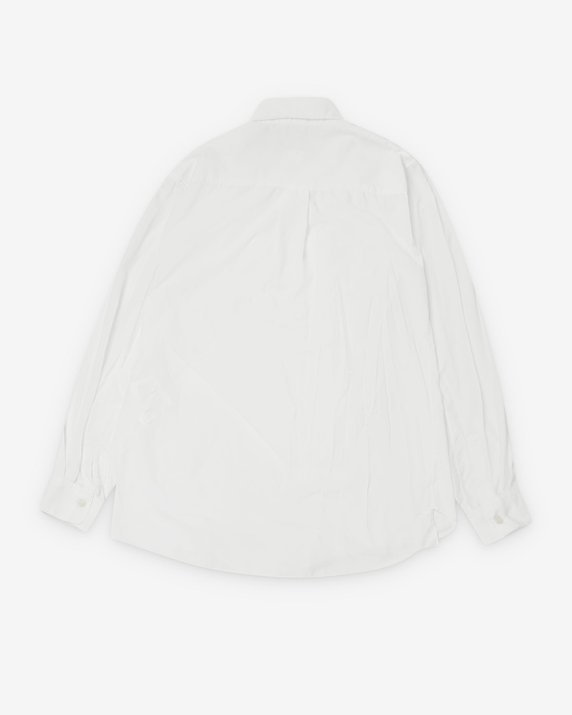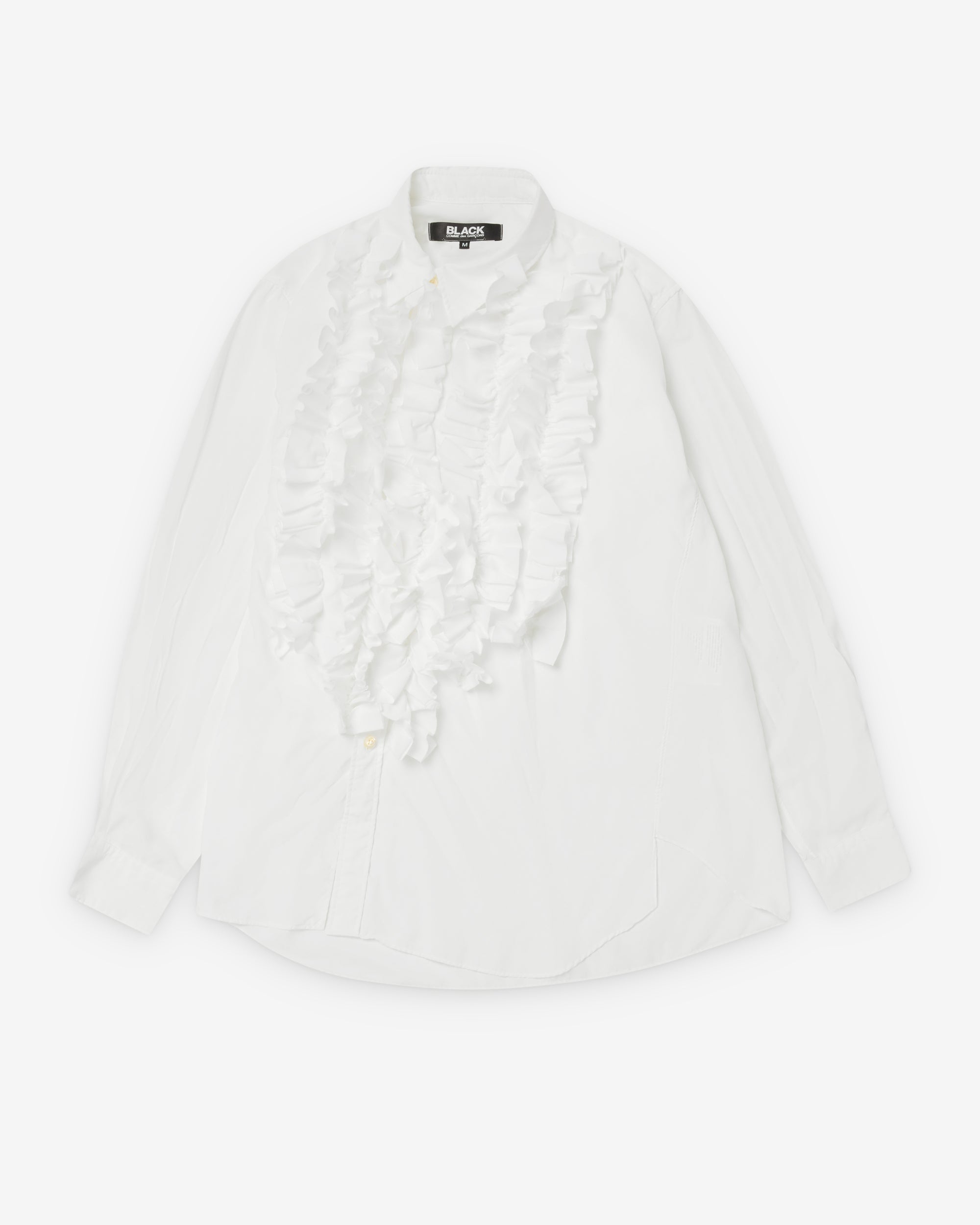 Asymmetric button closureRuffle details at chestLong sleeves with button cuffsShirttail curved hem