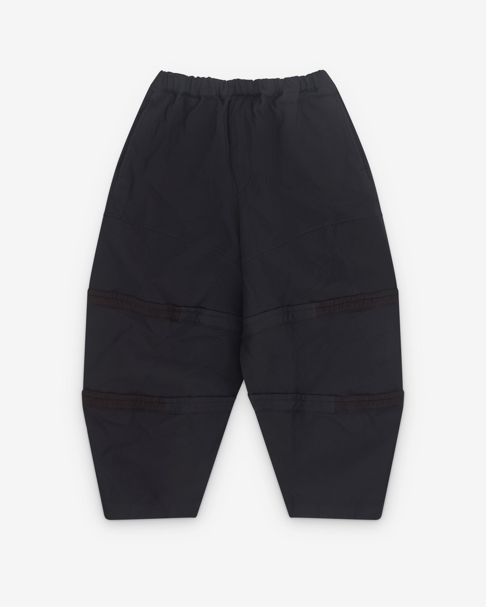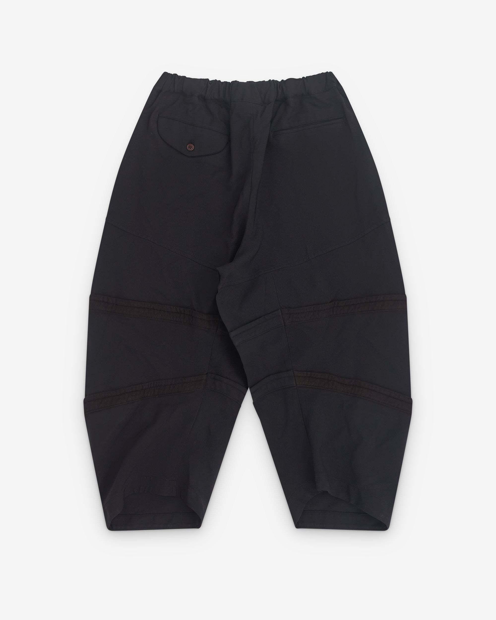 Elasticated waistWide, barrelled legPanelled constructionSide seam pocketsRear welt pocket and button flap pocket