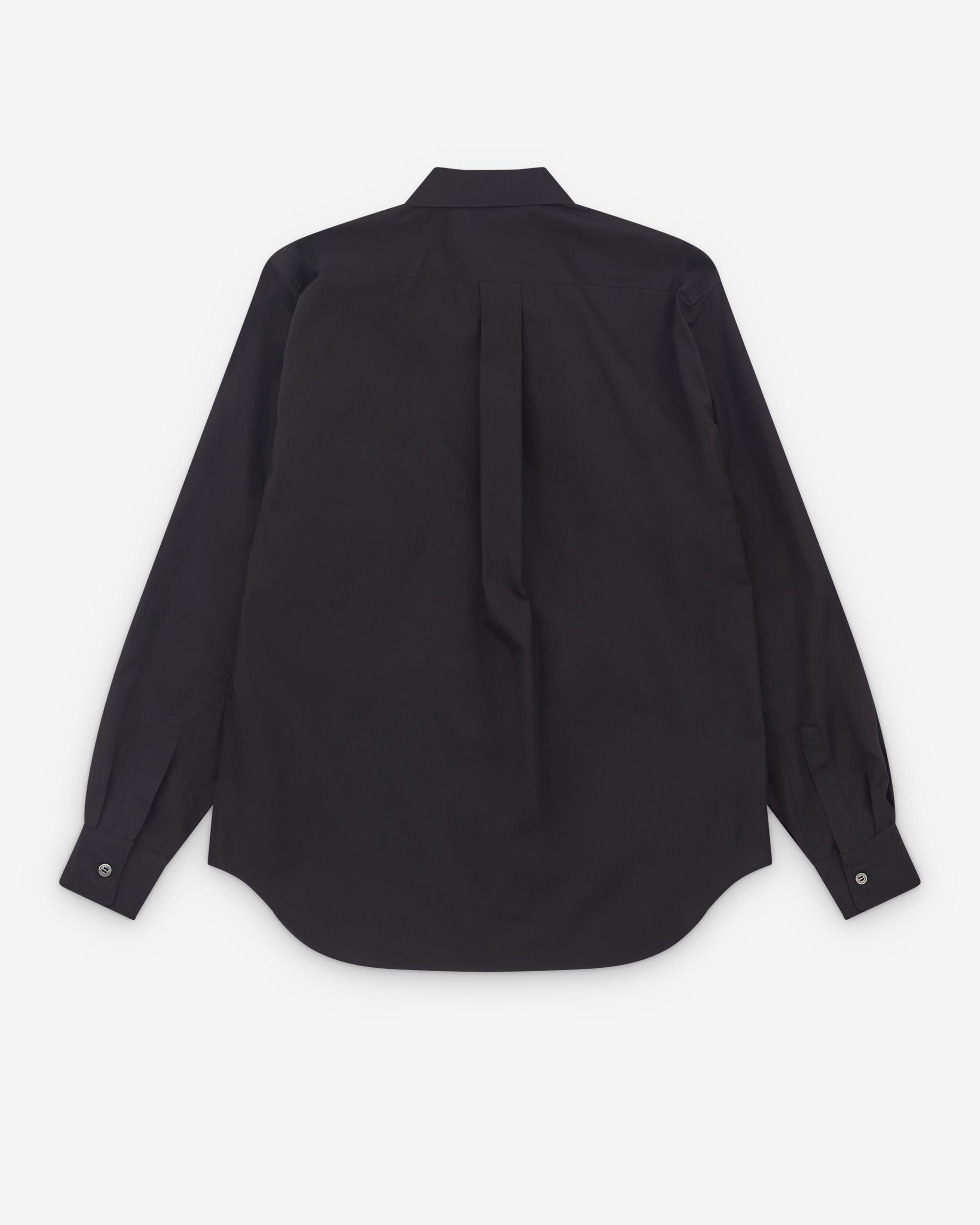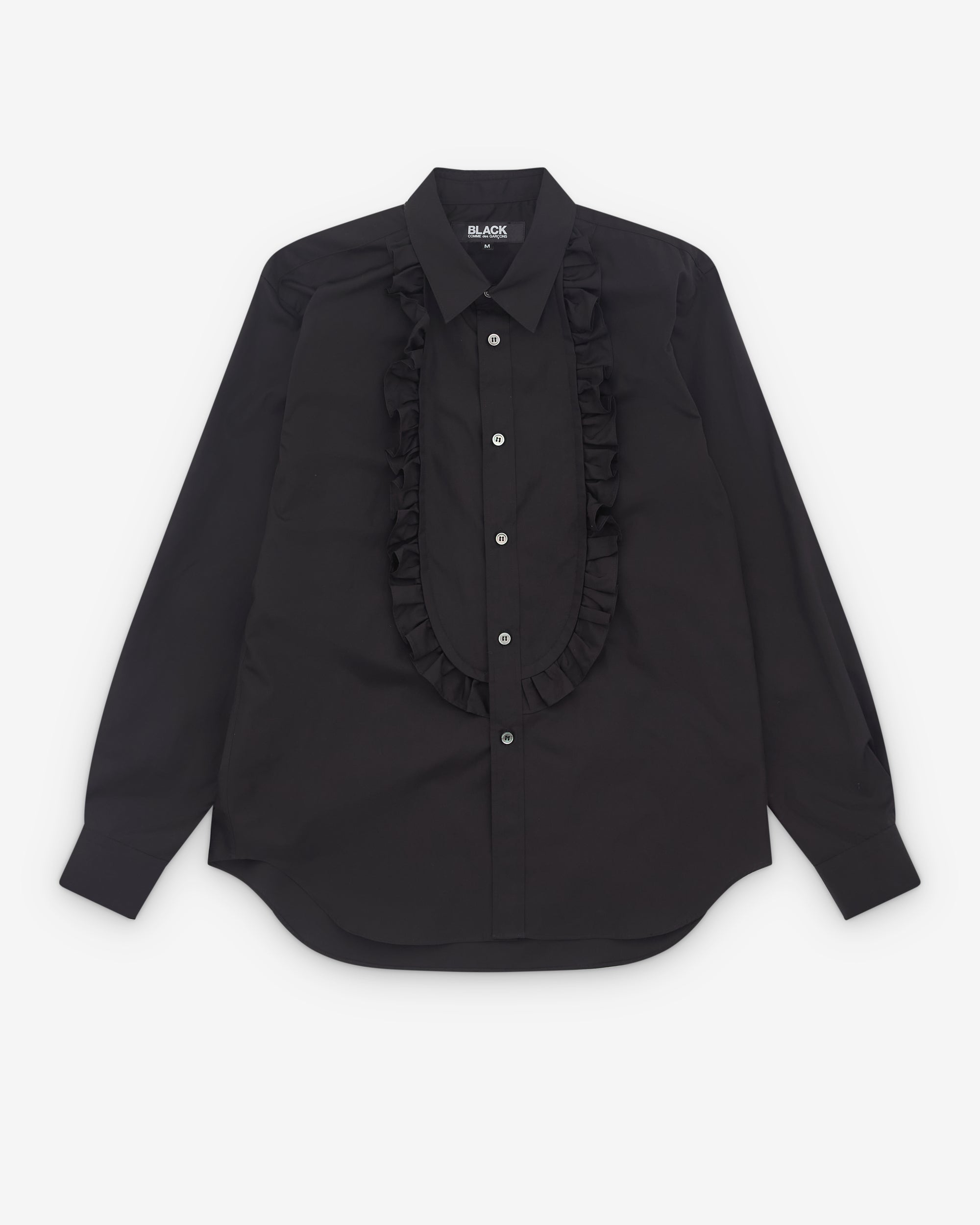 Point collarRuffle yoke detailButton closureCurved hemButton cuffsRear box pleat