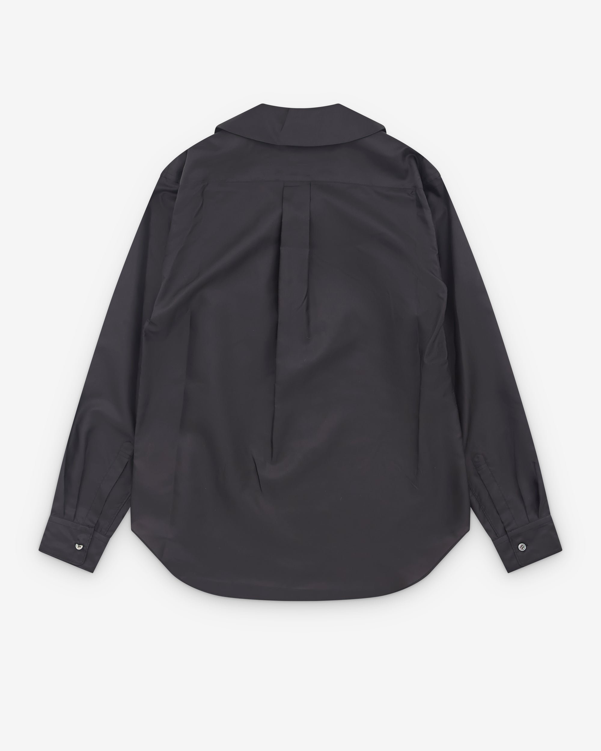 Round collarRuffle yoke detailButton closureCurved hemButton cuffsRear box pleat