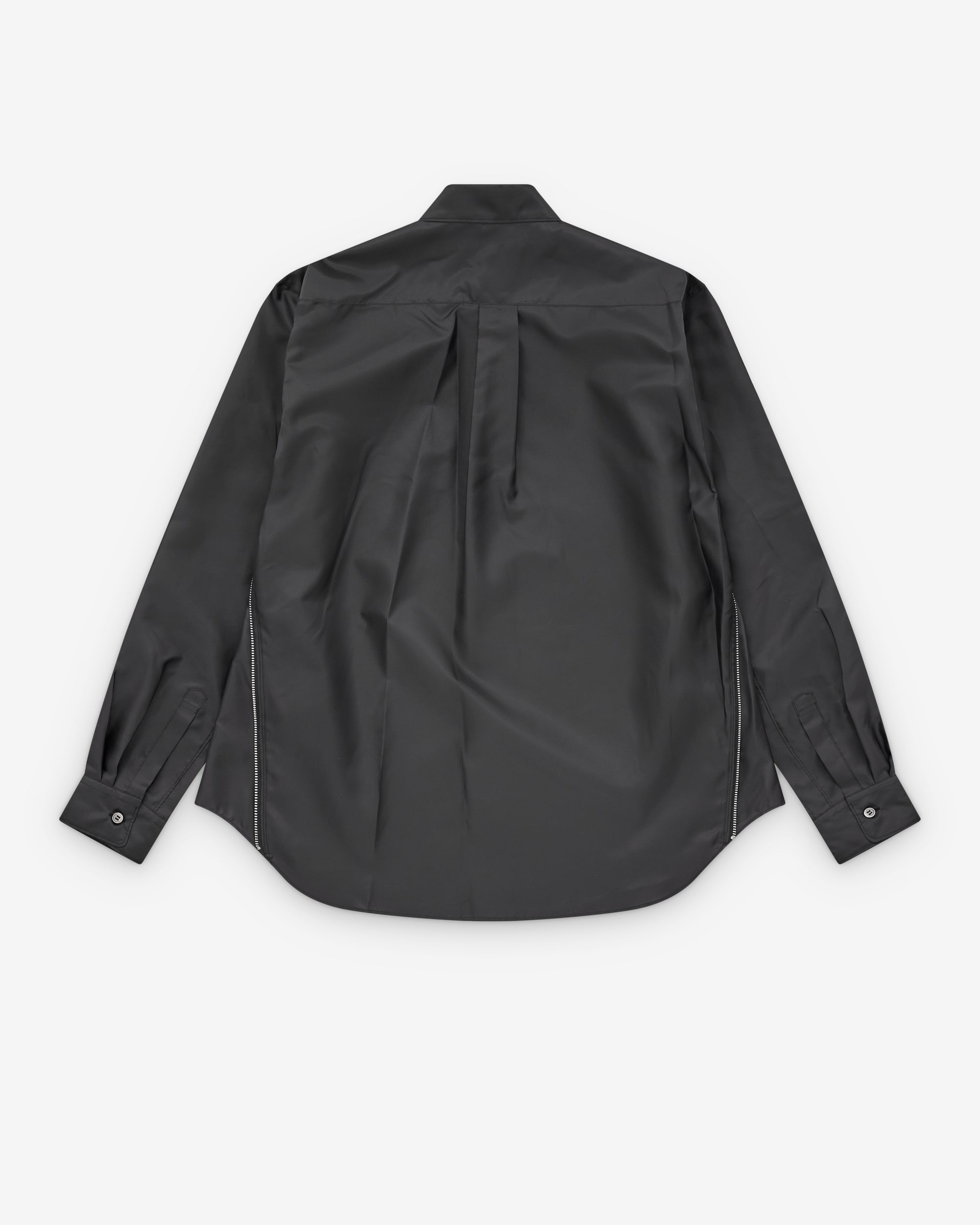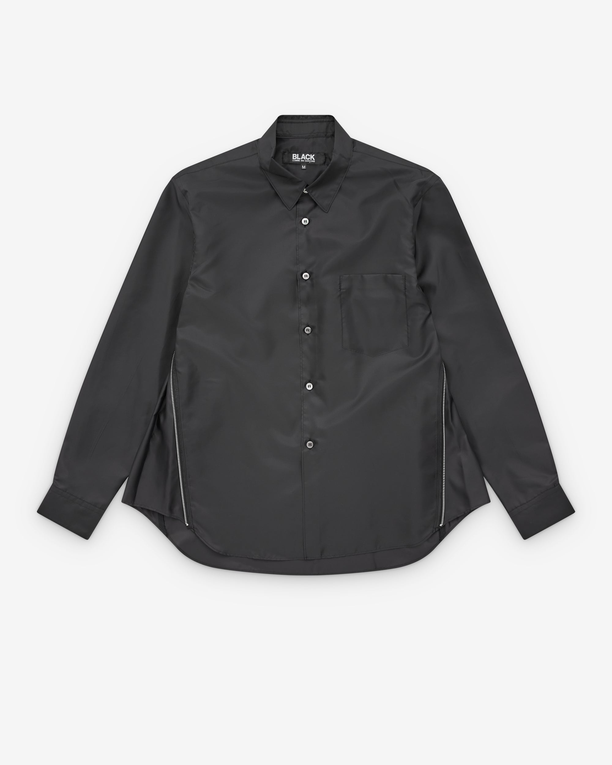 Point collarChest patch pocketSide seam zips with extendable panelingCentre back box pleatCurved hemButton fastening