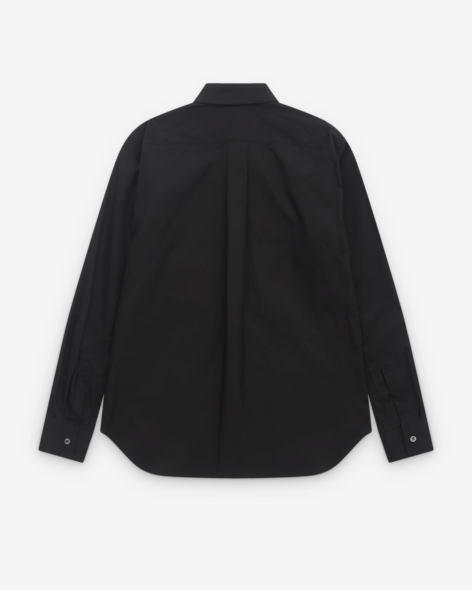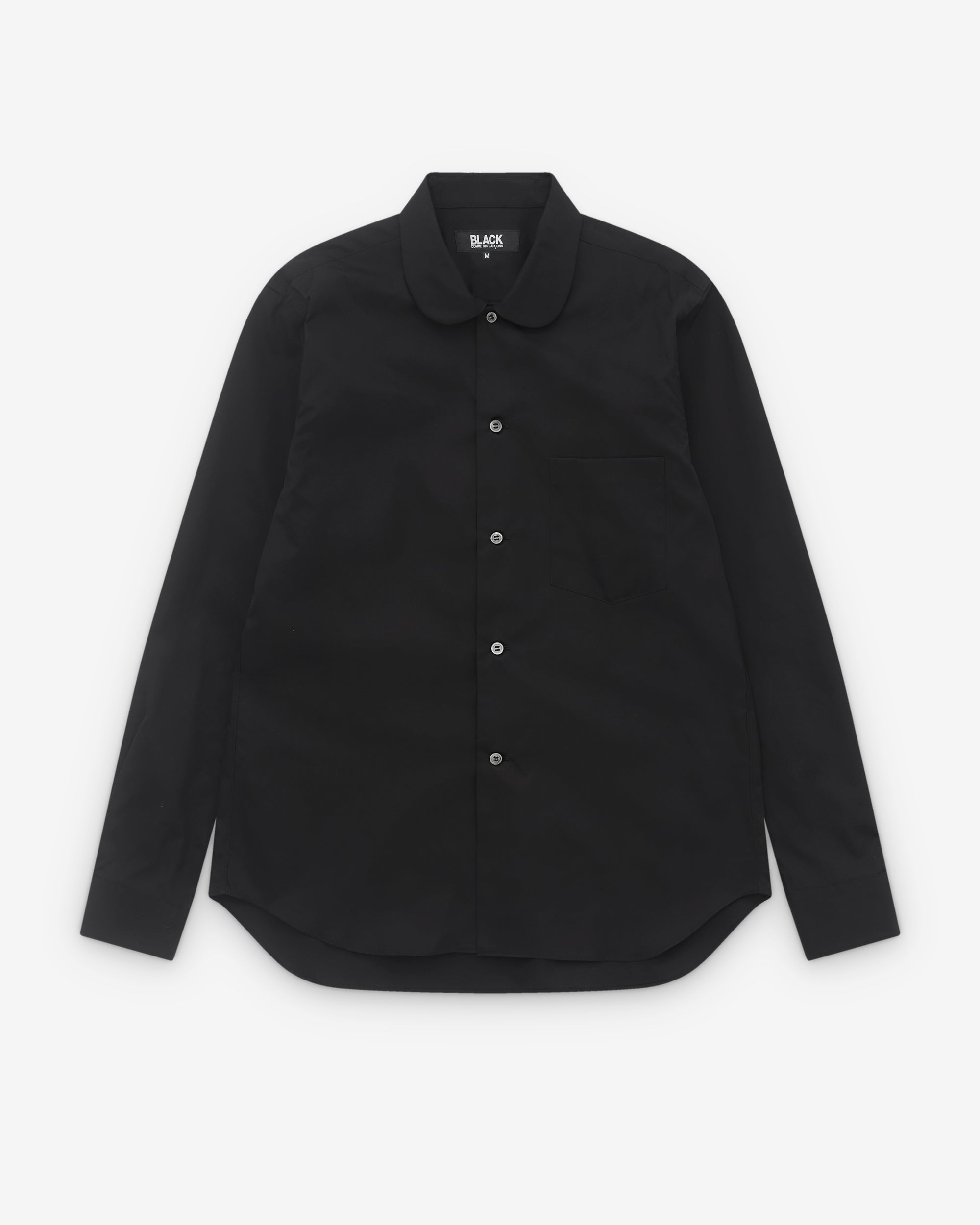 Round collarButton placketChest patch pocketCurved hemCentral box pleat at rear yoke