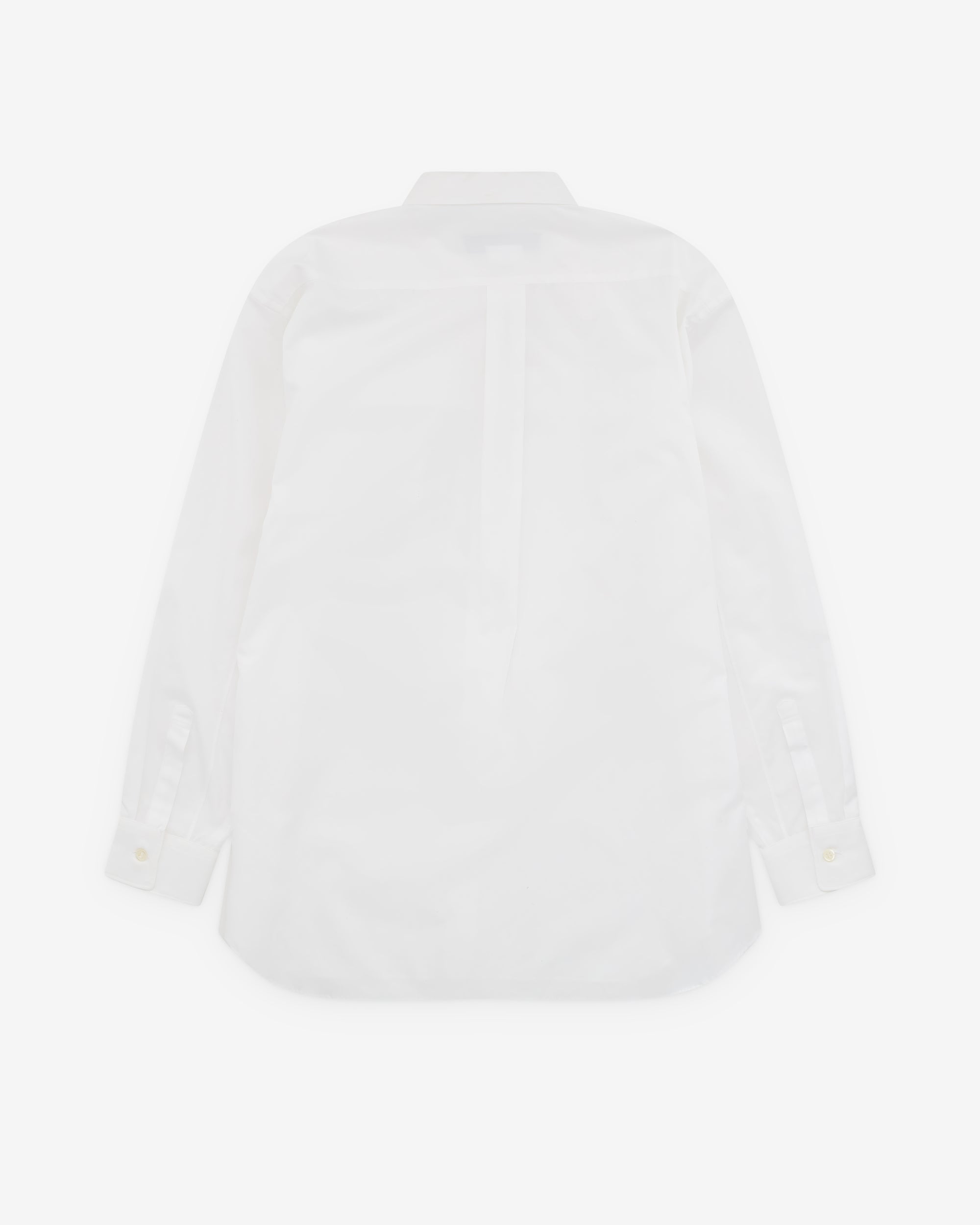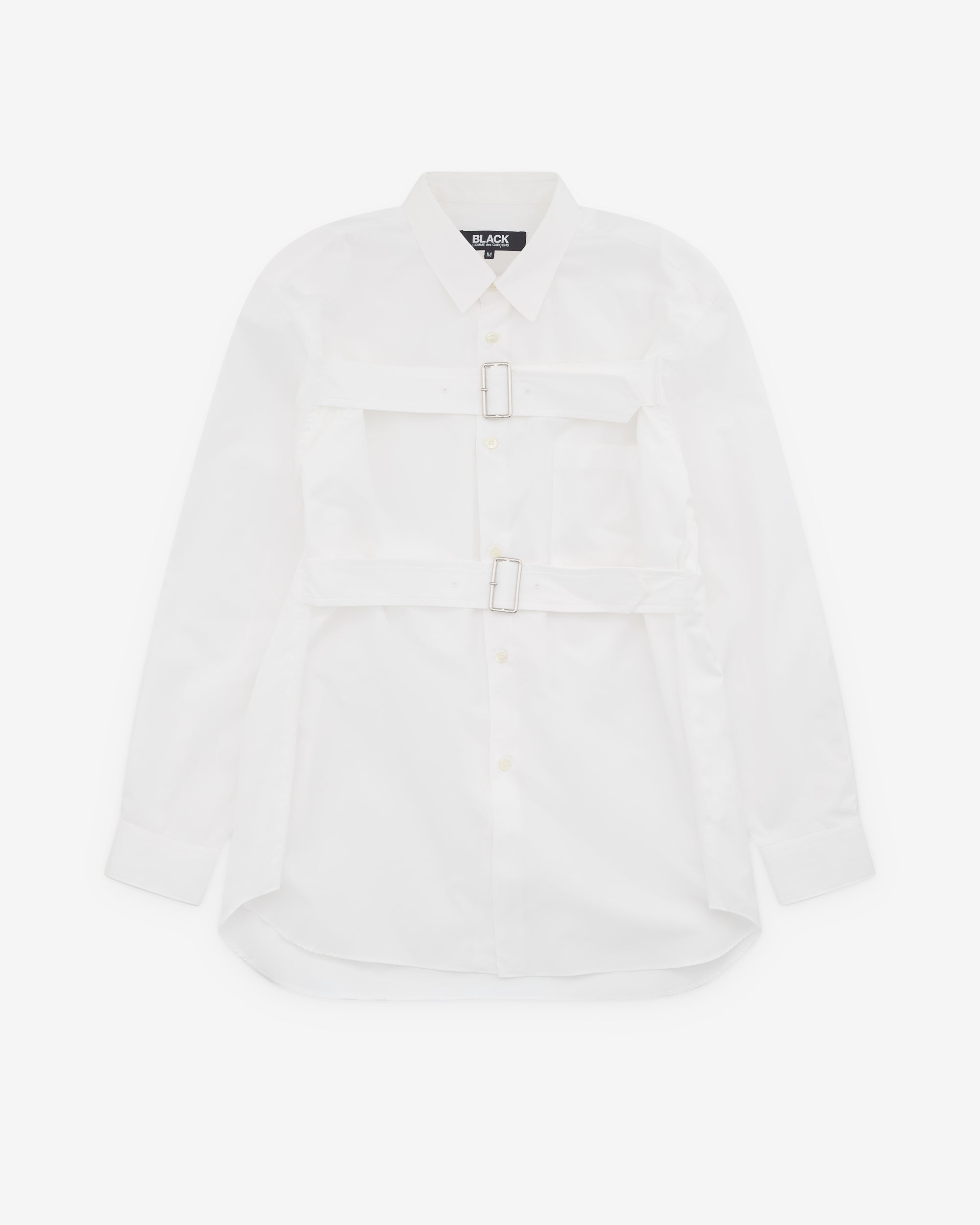 Point collarButton placketDouble buckle detailCurved hemBox pleat at rear