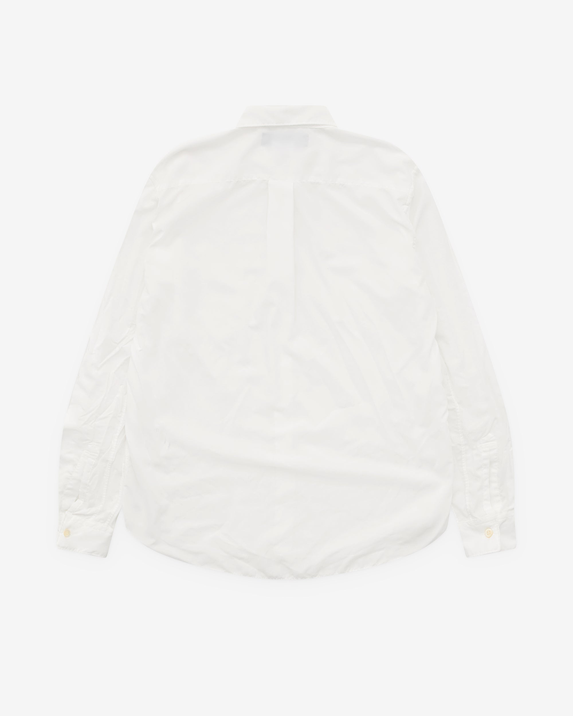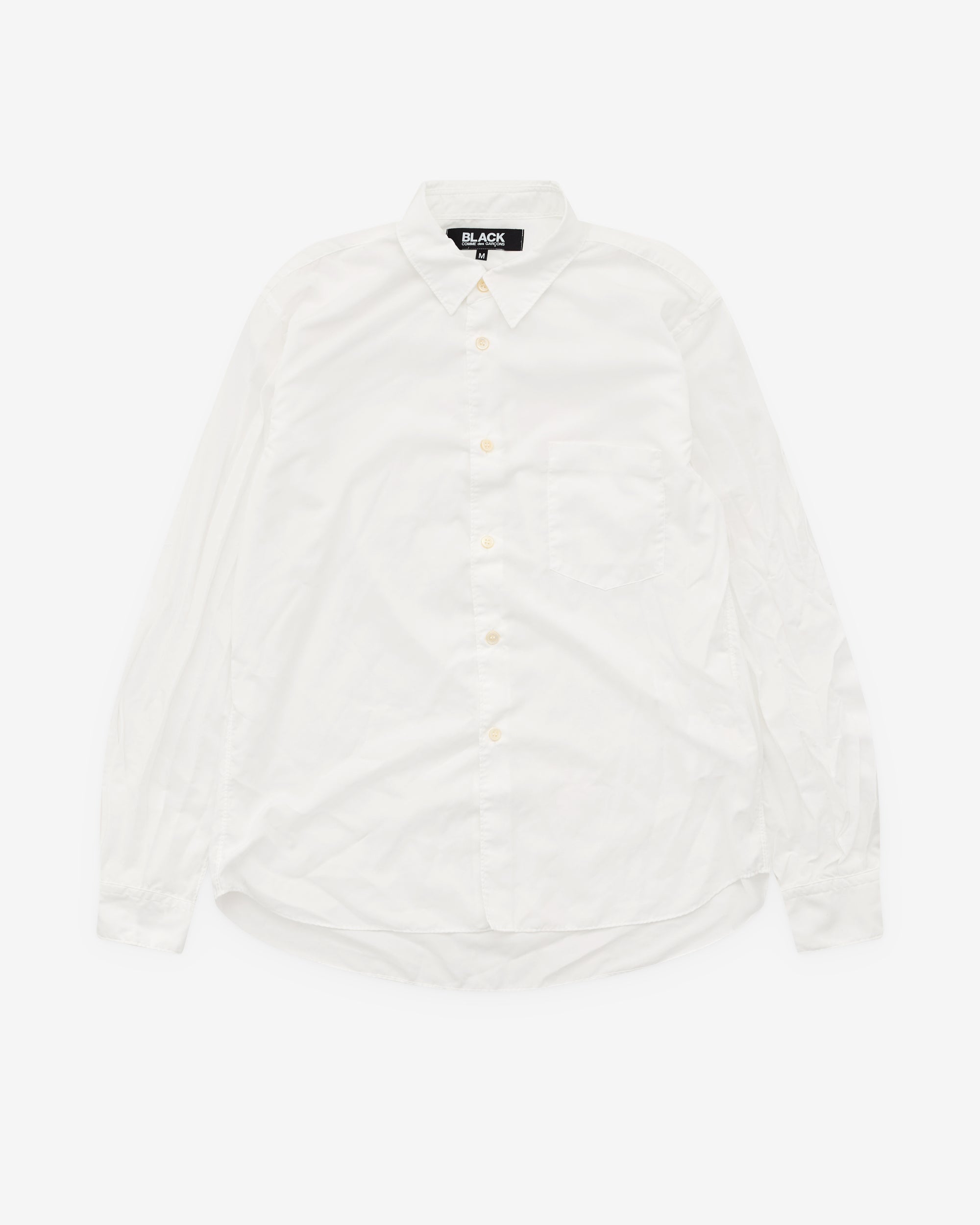 Point collarContrast button fasteningCurved hemIntentional creasing throughoutChest patch pocket