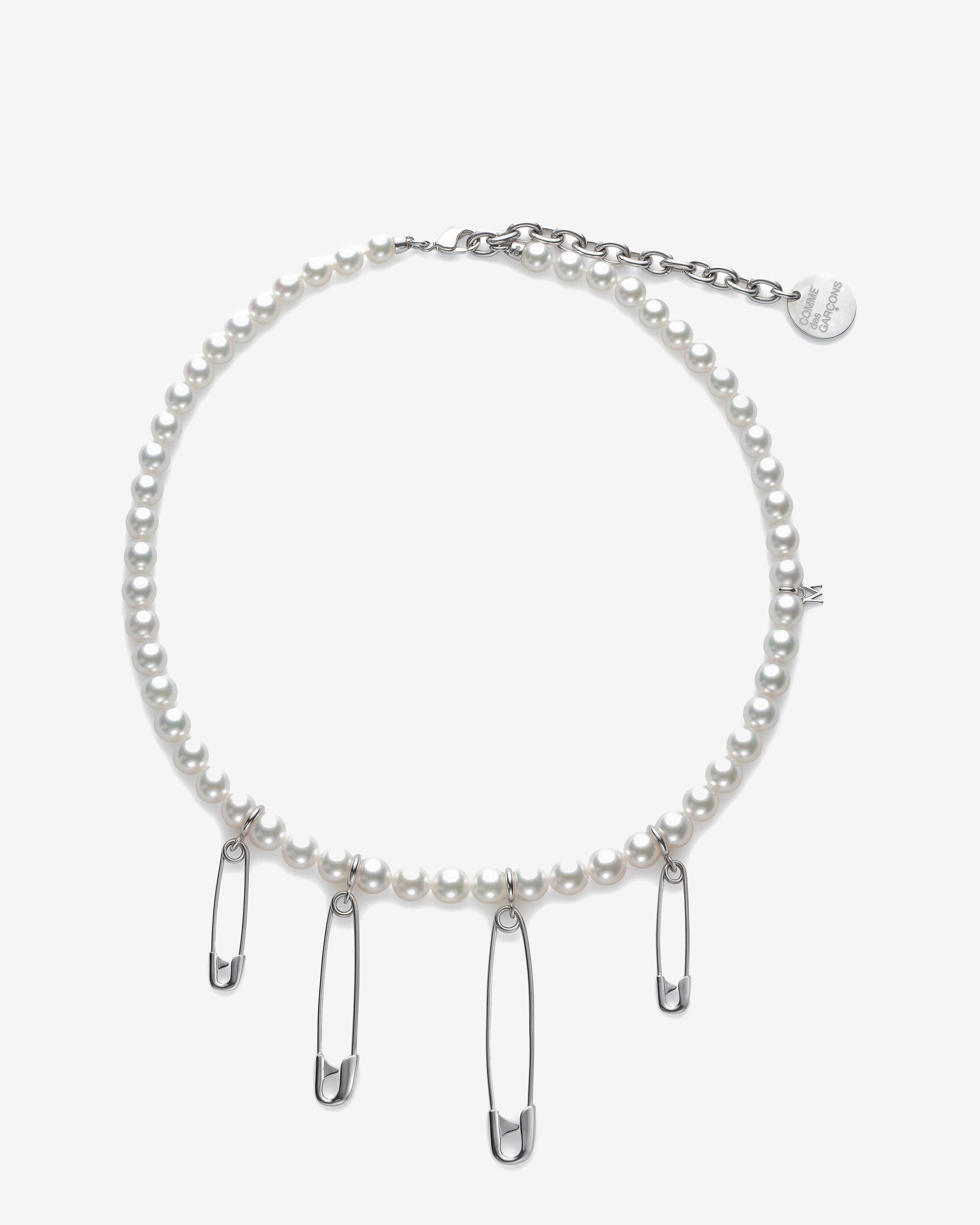 From the second fine jewelry collaboration between COMME des GARÇONS and MIKIMOTO is this pearl and silver safety pin necklace.