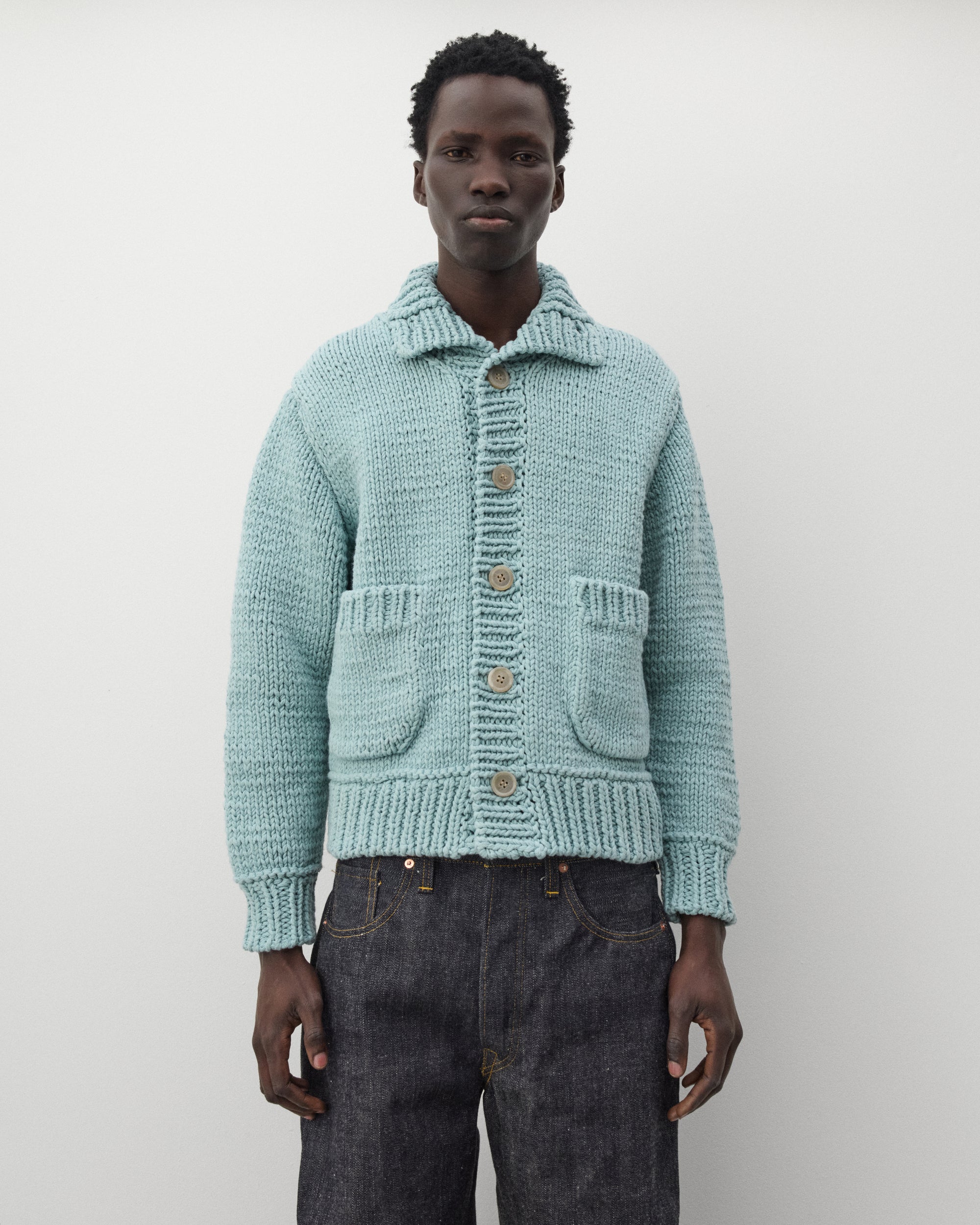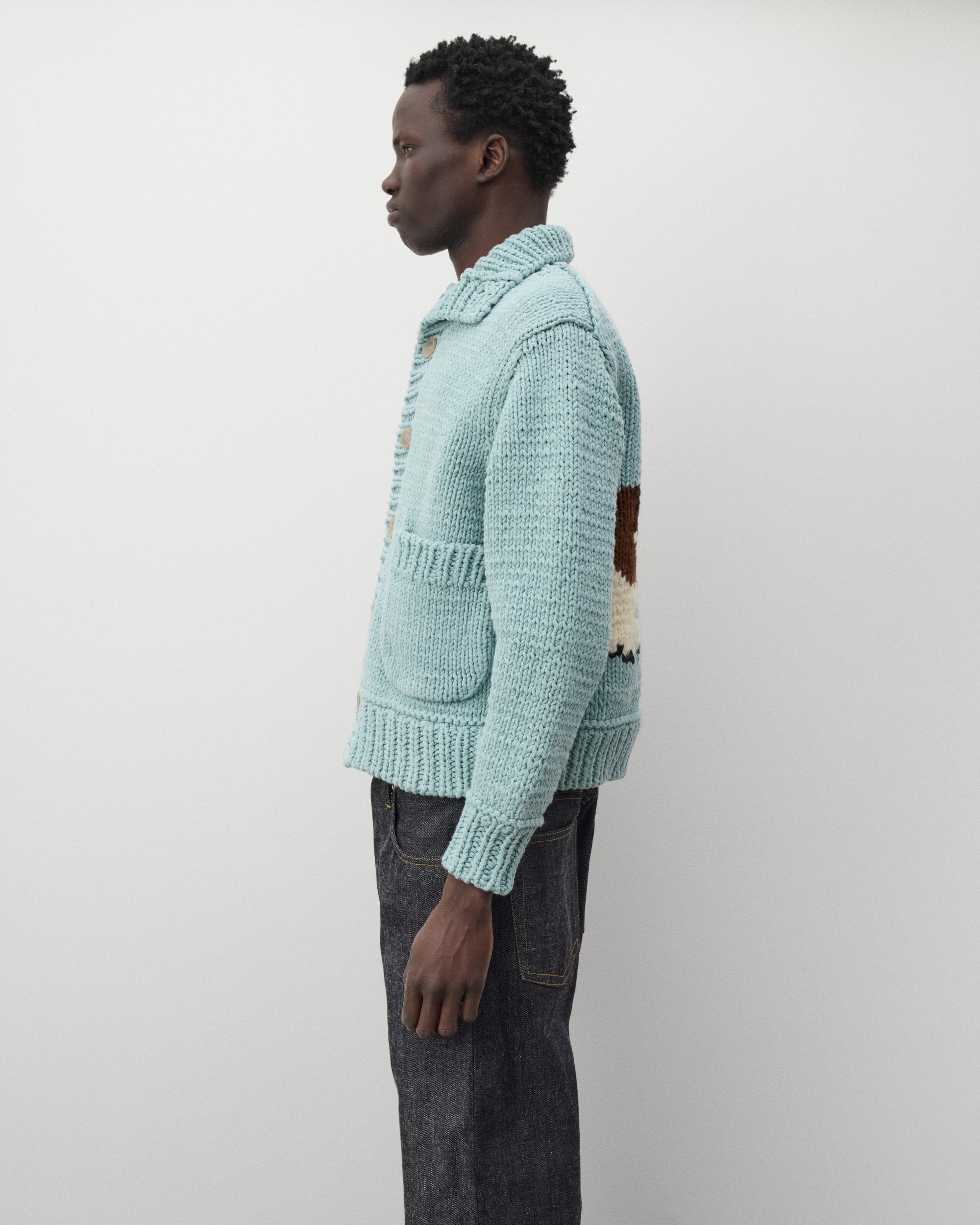 Heavy guage cotton knit fabricIntarsia graphics at backFront patch pocketsFront button closureRibbed knit trims
