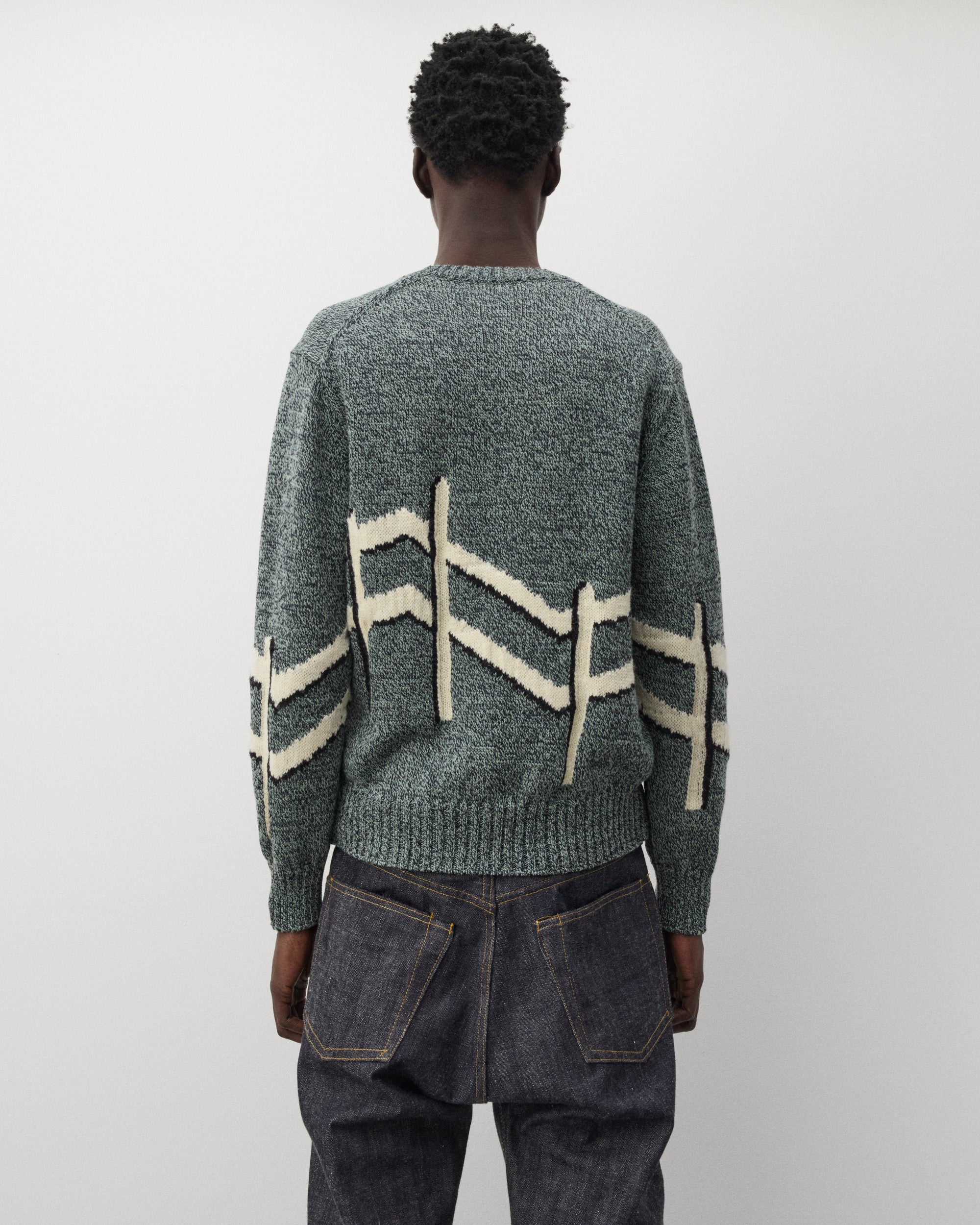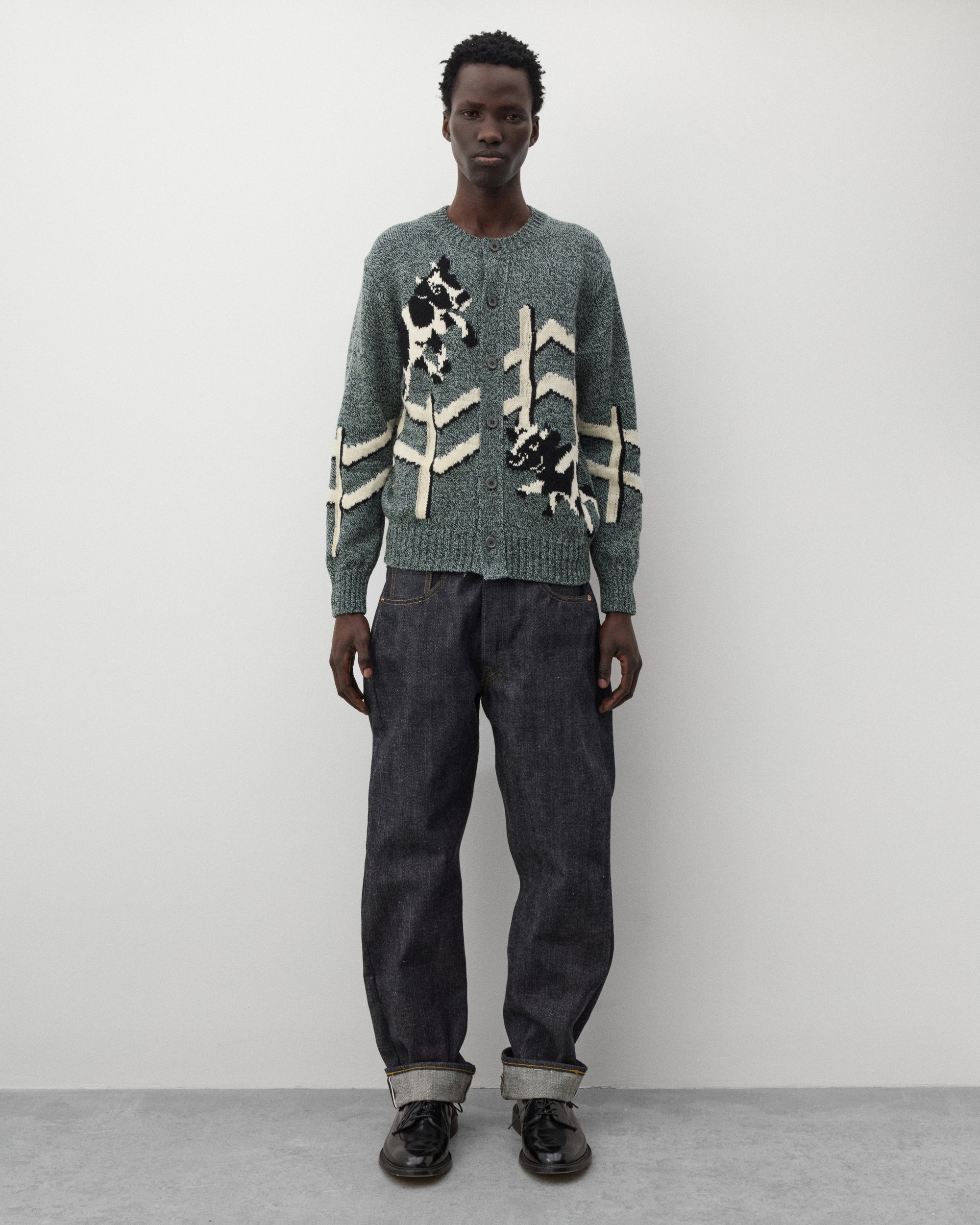 Ribbed rounded collarFront button closureInstarsia knit graphicsRibbed knit cuffs and hem