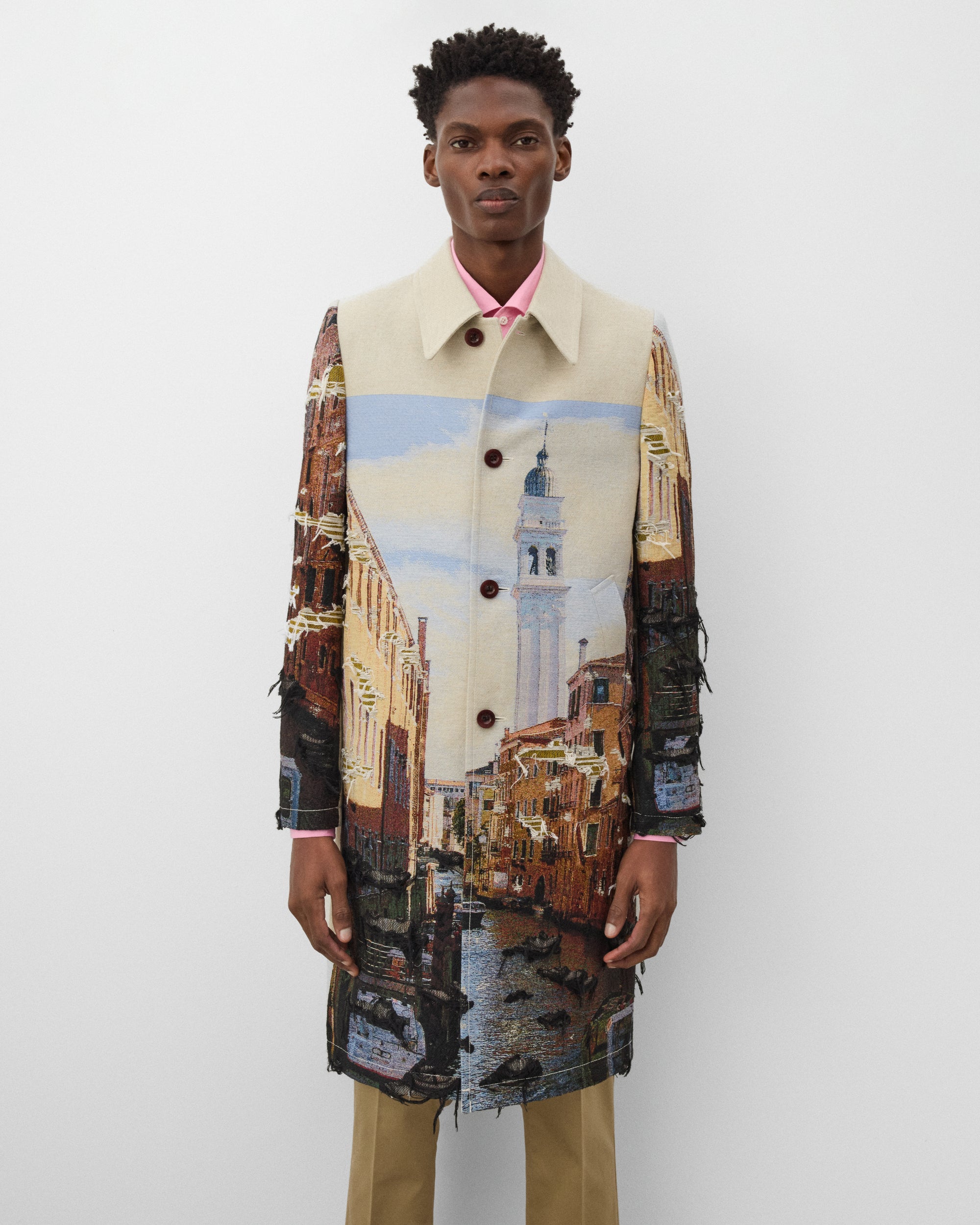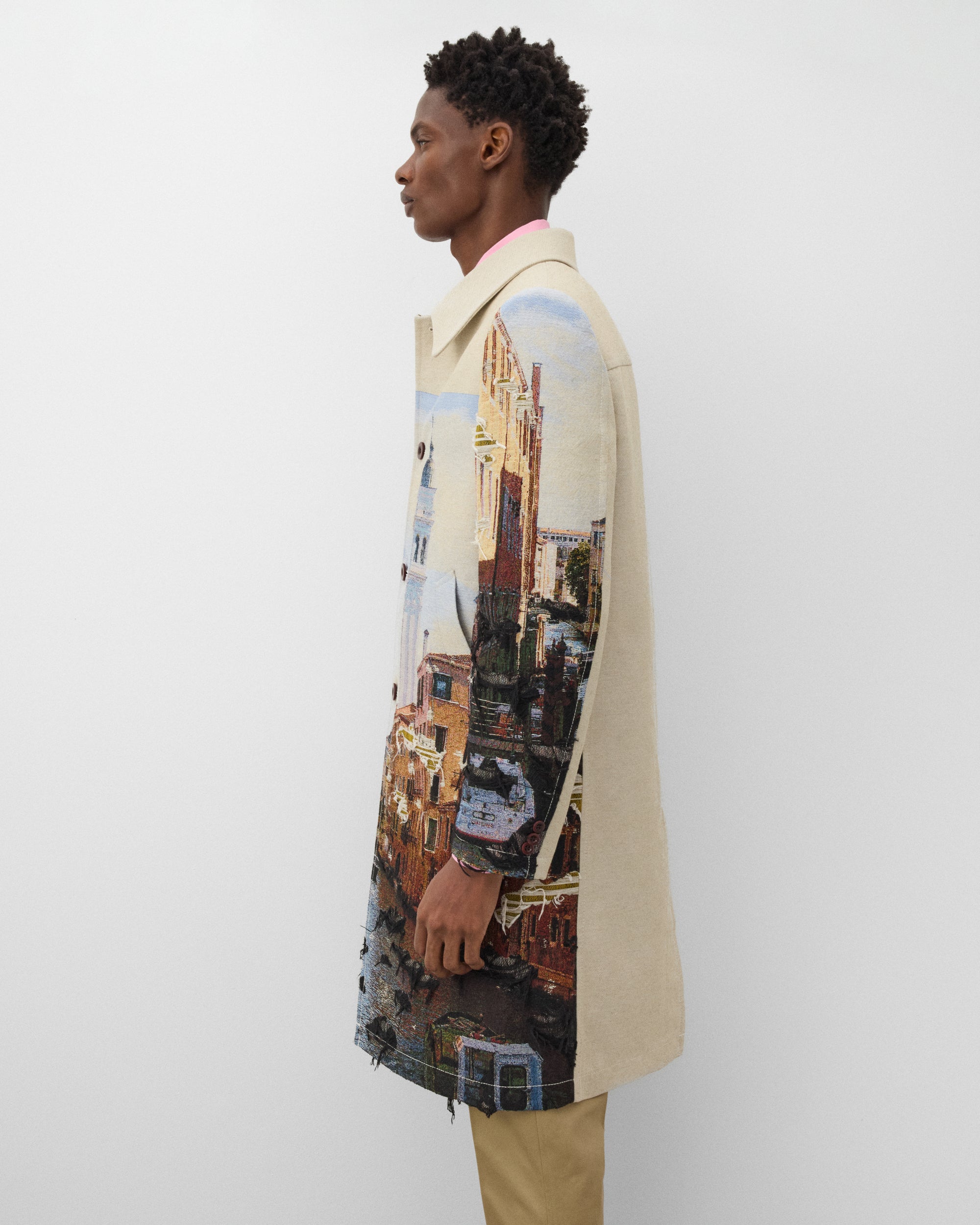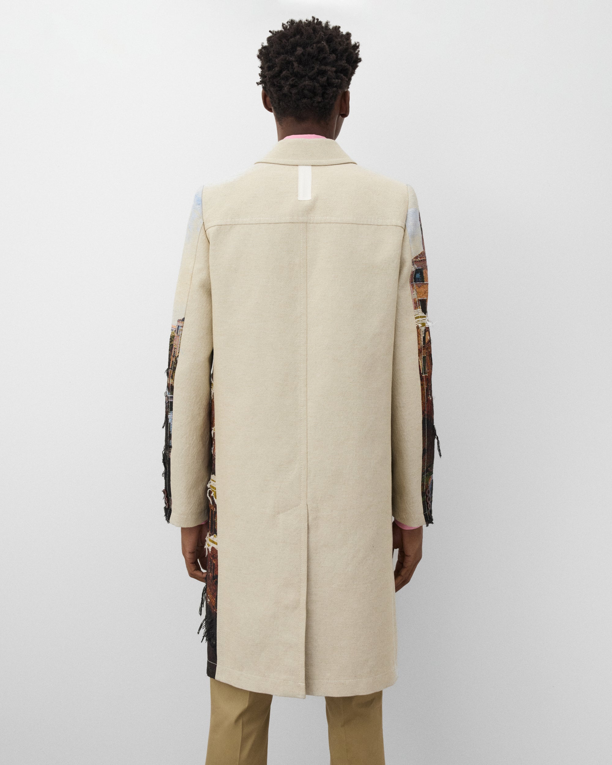 Classic collarSplit rear ventFront button closure Distressed embroidered fabricStructured shoulders