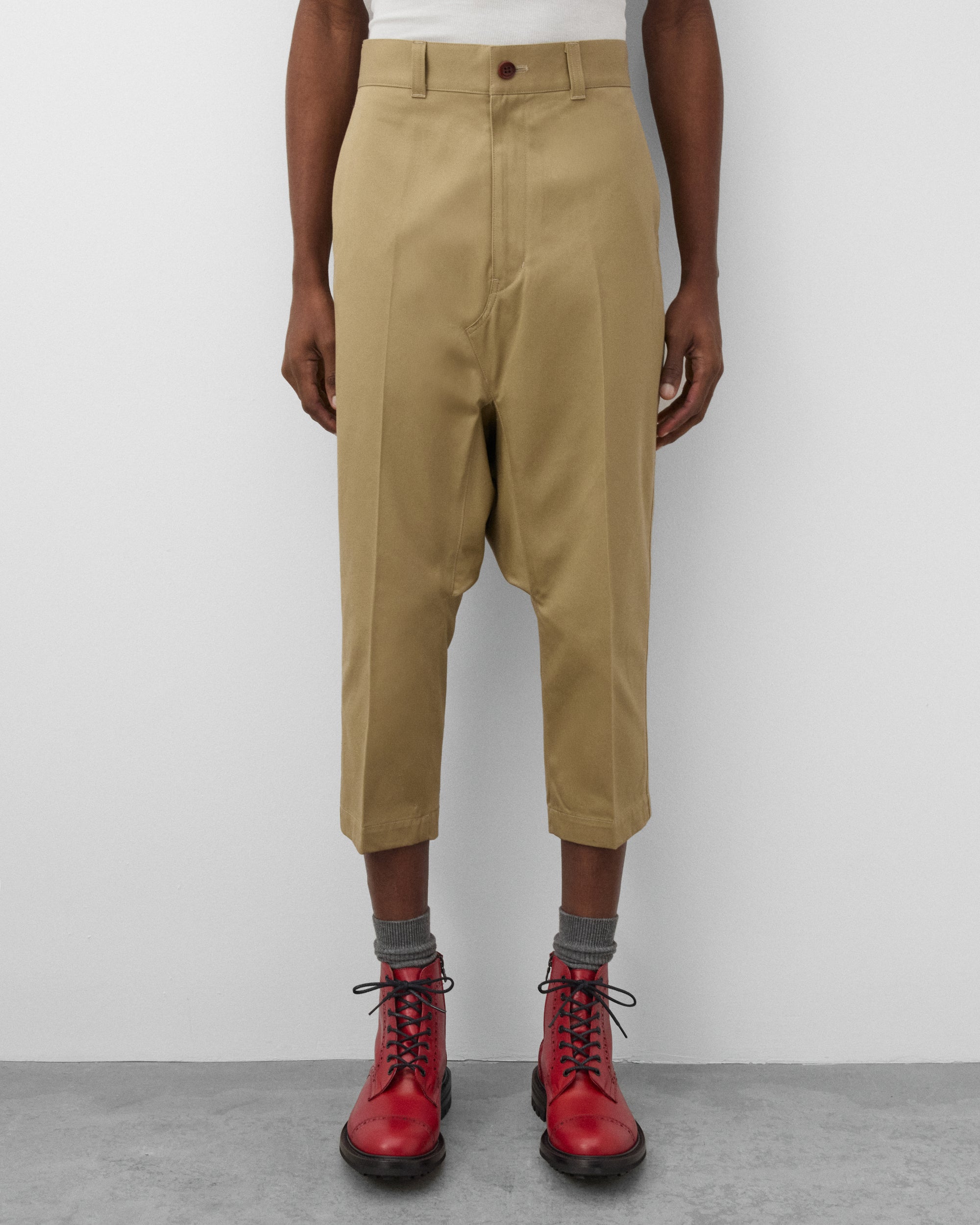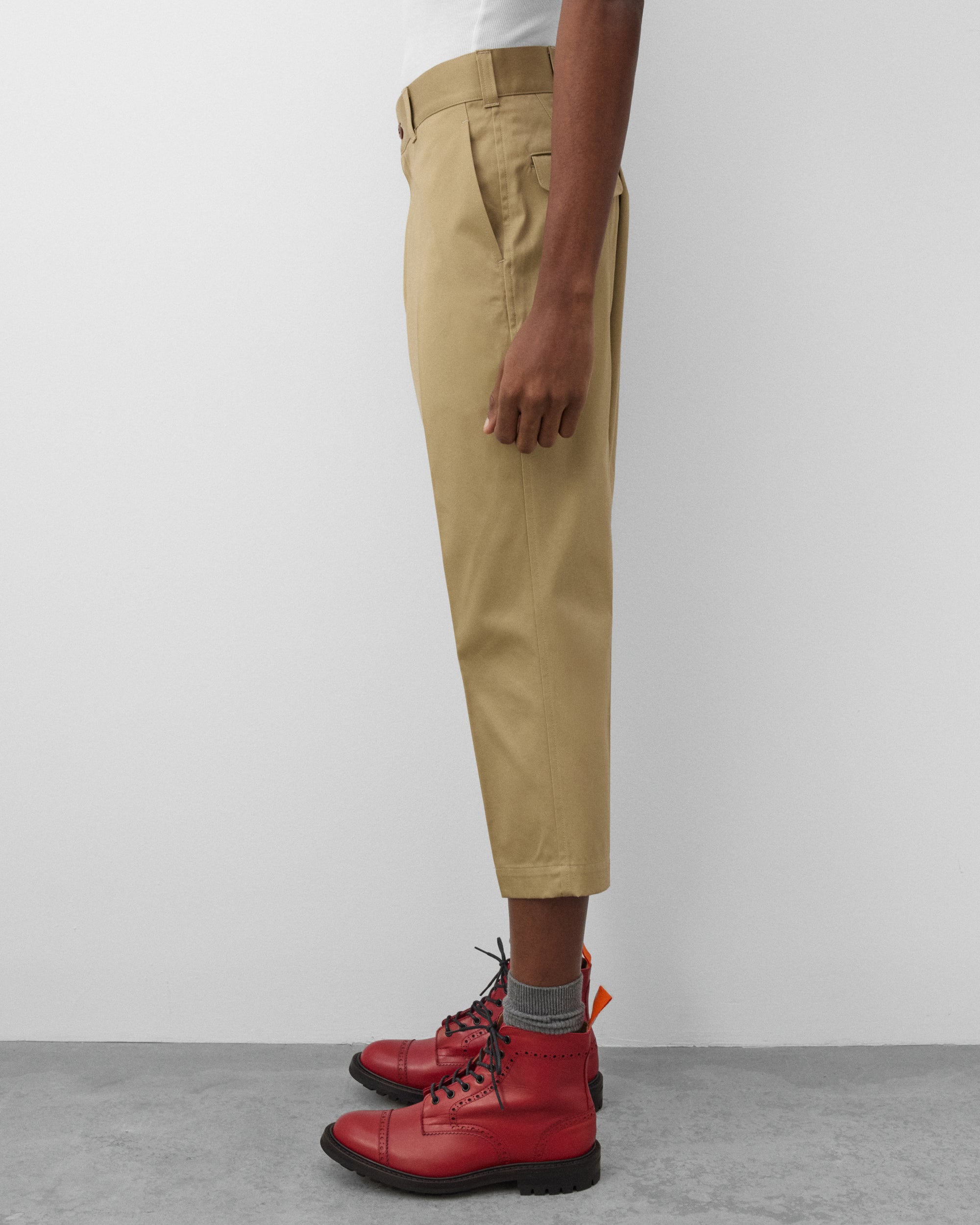 Cropped legFront pleat Button waist, zip flySide seam pocketTwo back pocketsDrop crotch