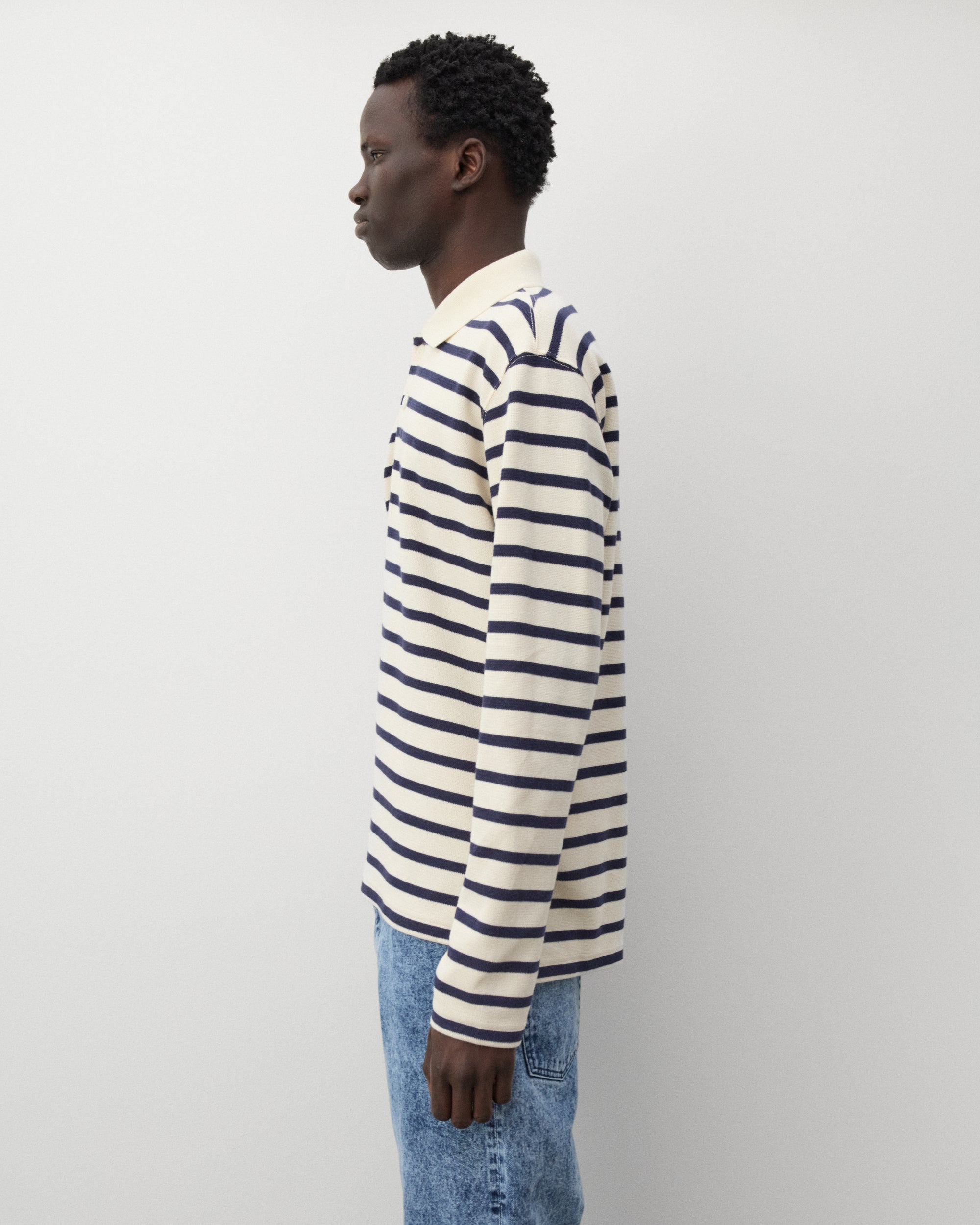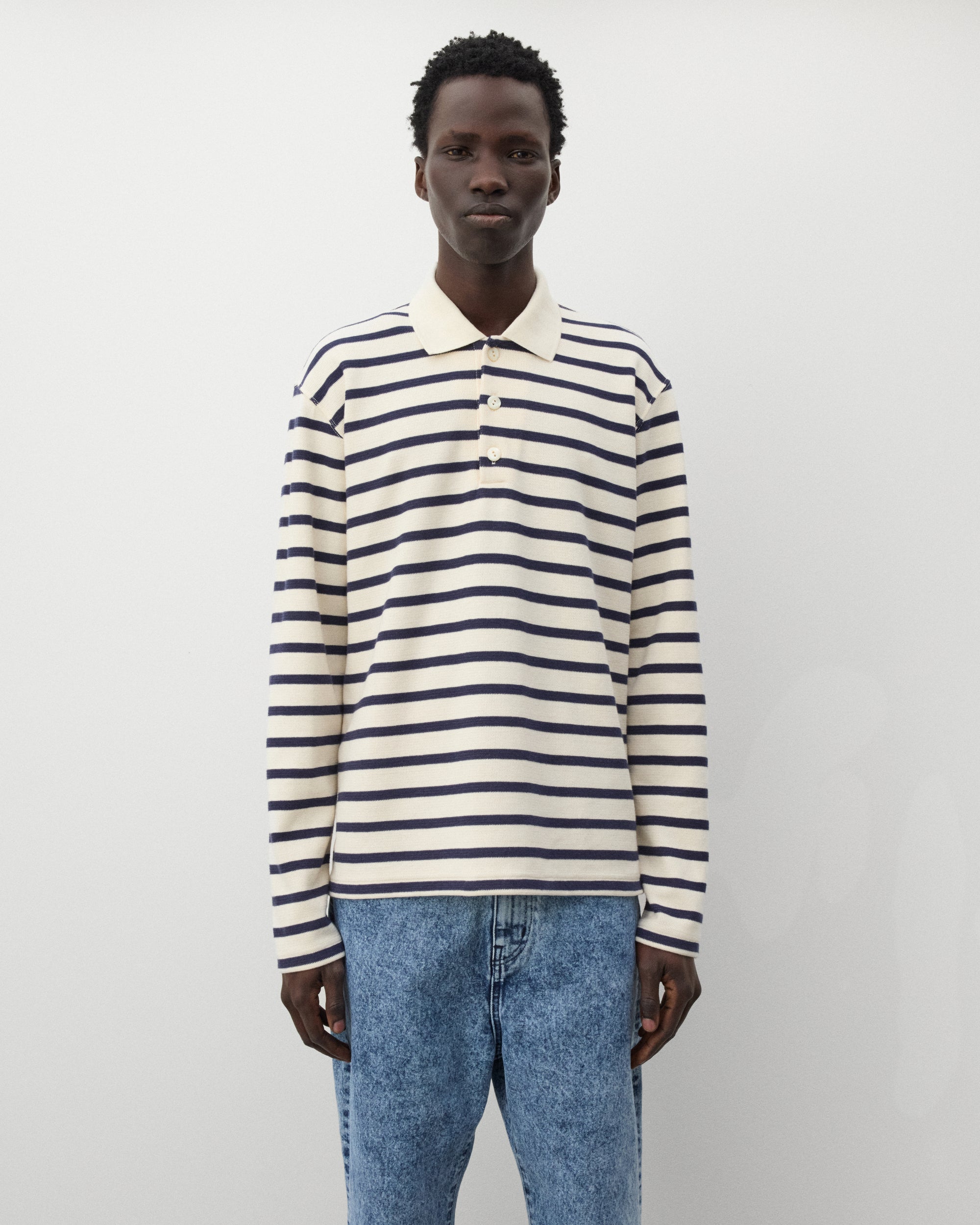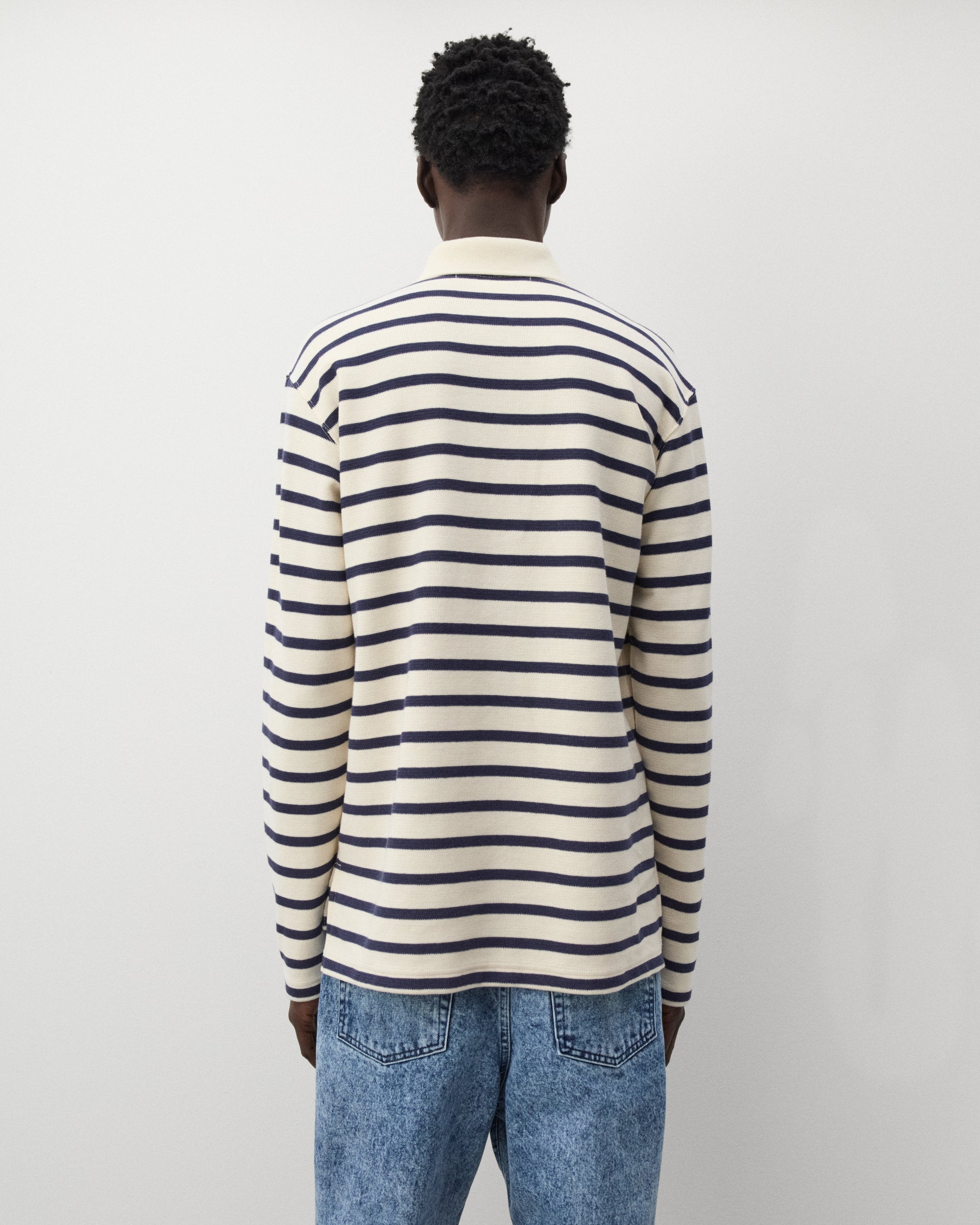 Spread polo collarThree button placketStriped cotton knit fabricLong sleevesDrop rear hem