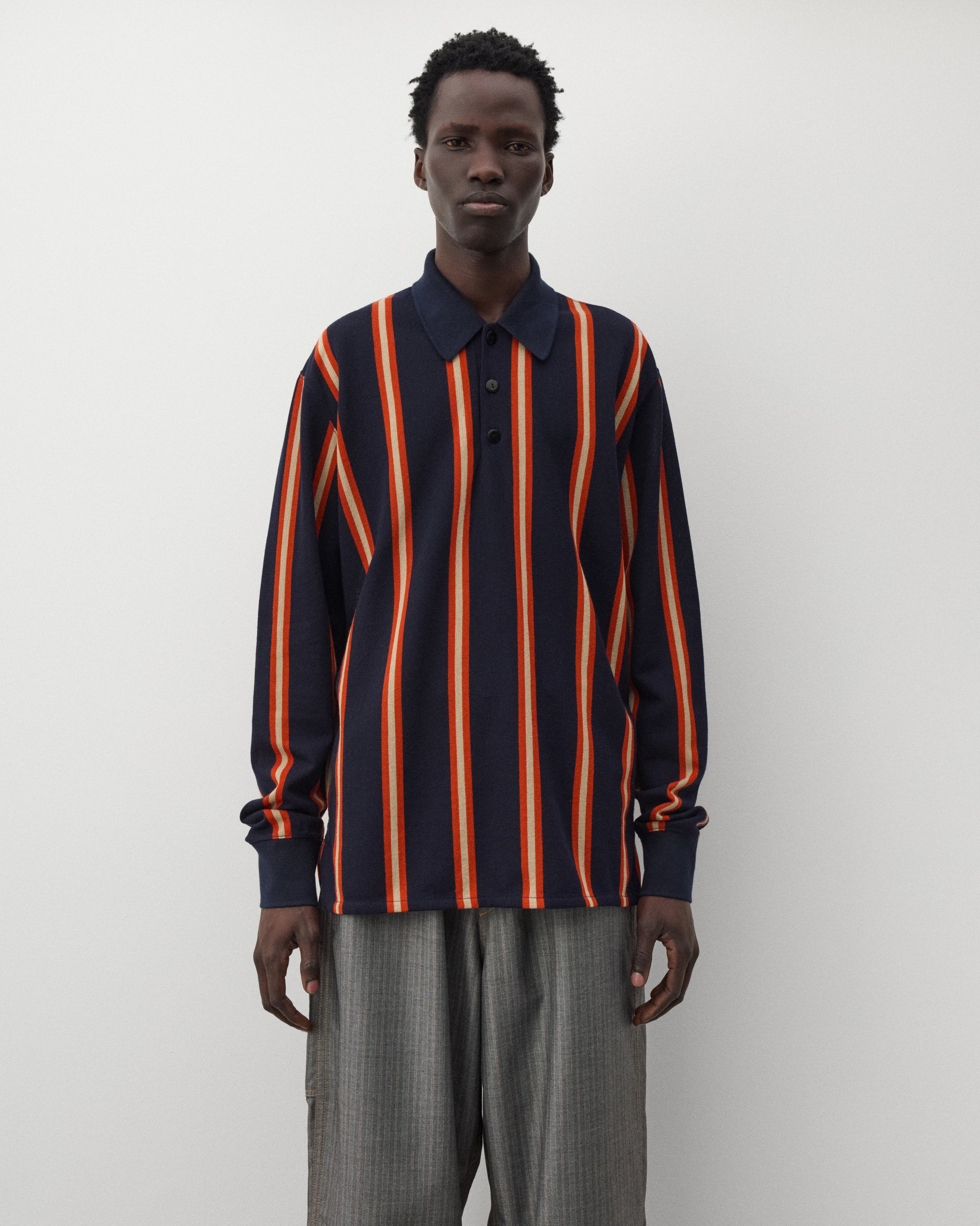 Polo collarThree button placketLong sleevesSplit side seamStriped woven knit fabricRibbed cuffs and collar