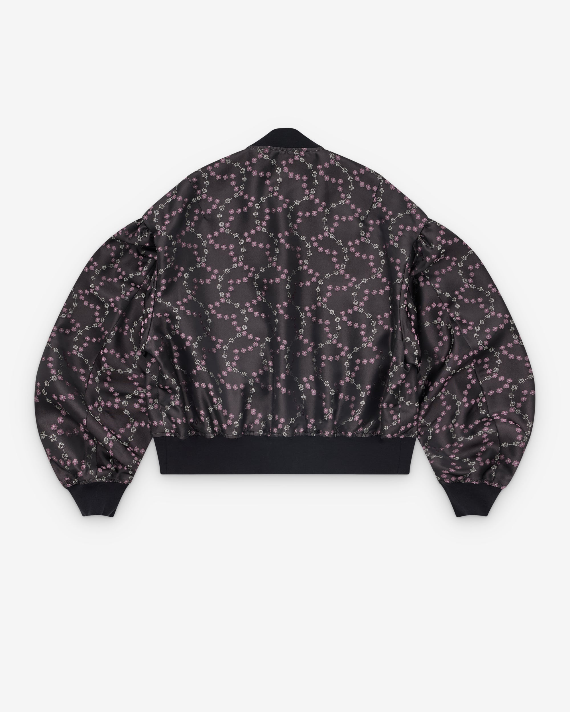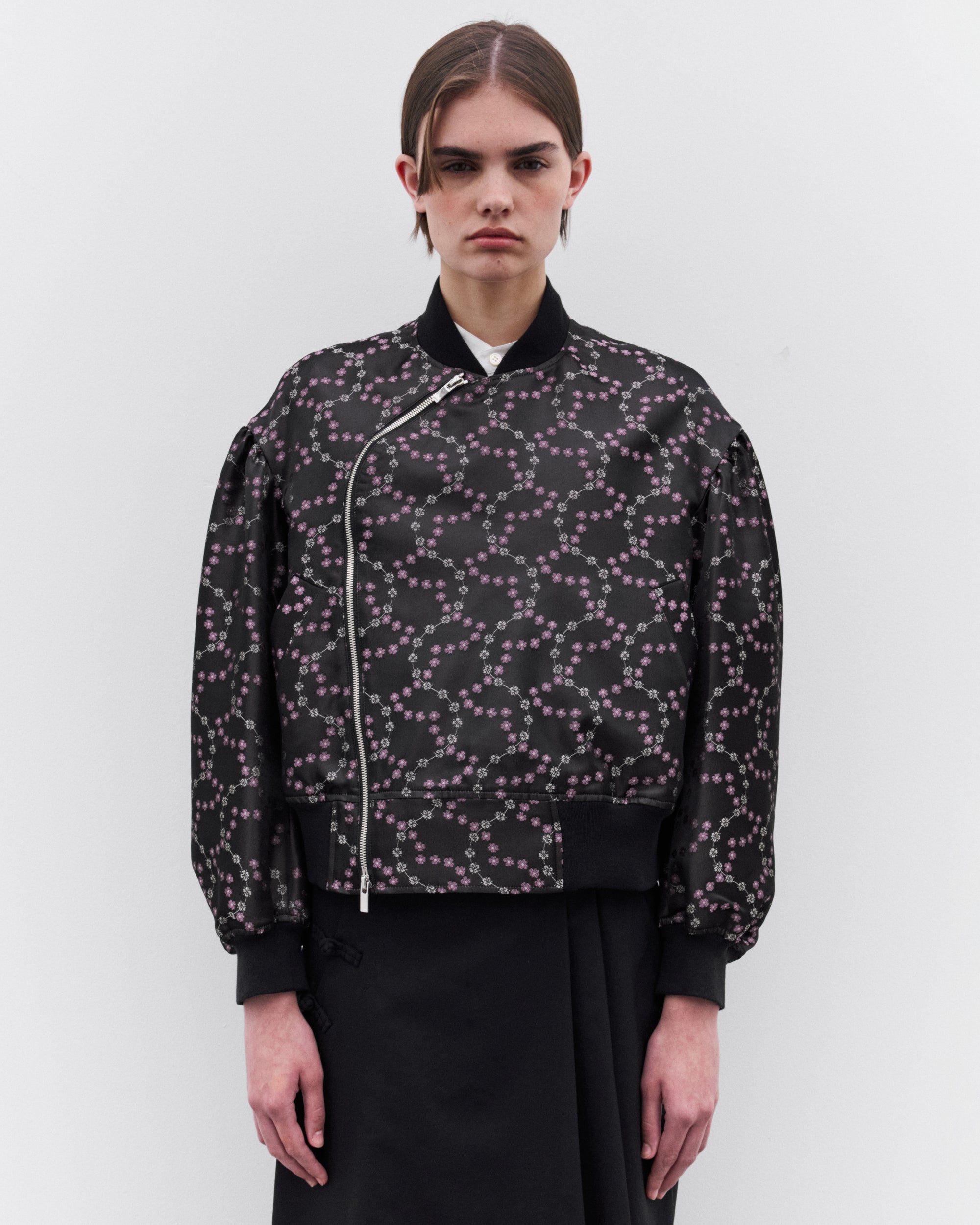 Rib knit trimsFloral design throughoutLarge, exaggerated sleevesAsymmetric two-way zip fasteningSilver-tone hardwareSide welt pockets57% Polyester, 43%RayonMade in Japan