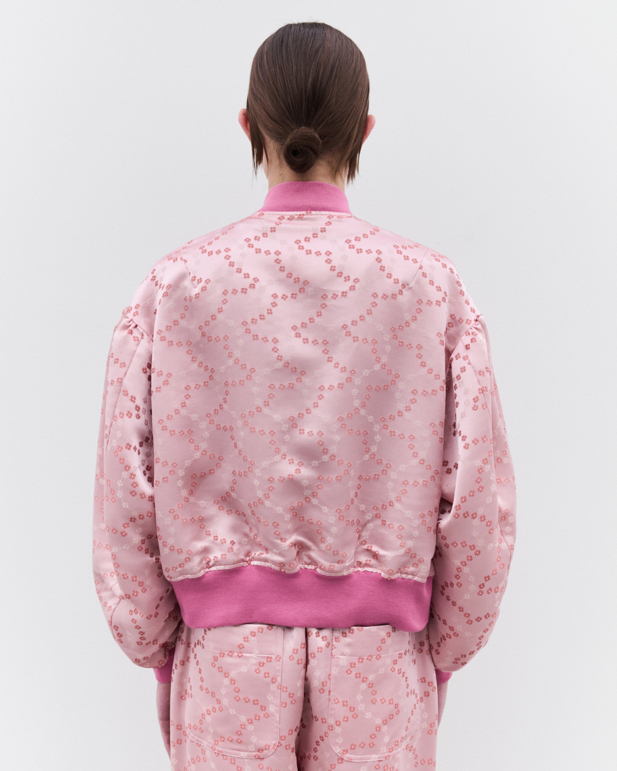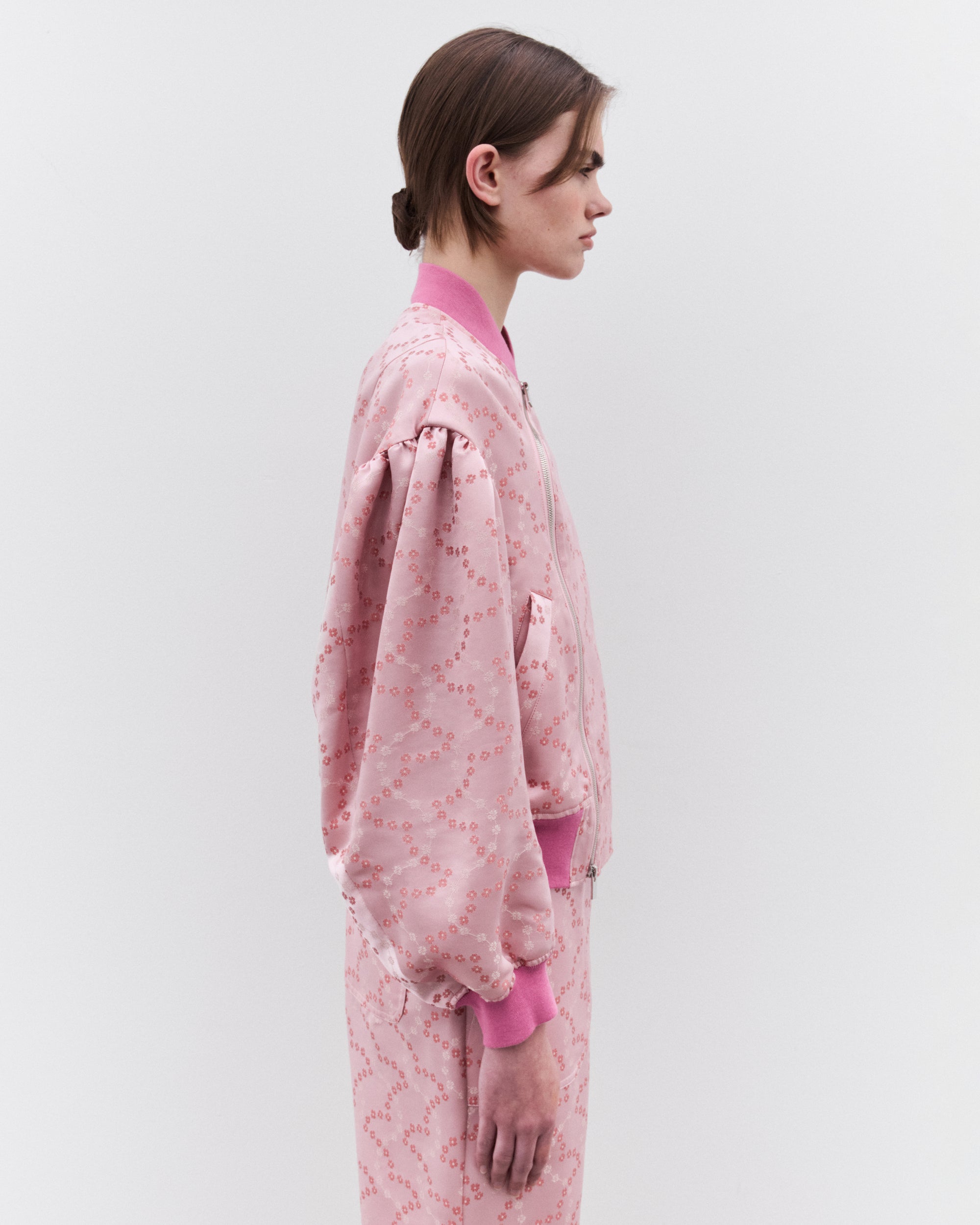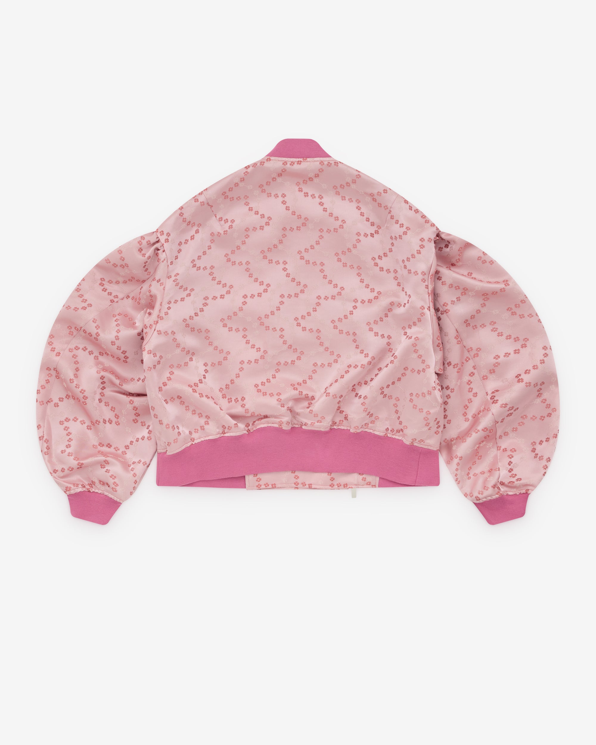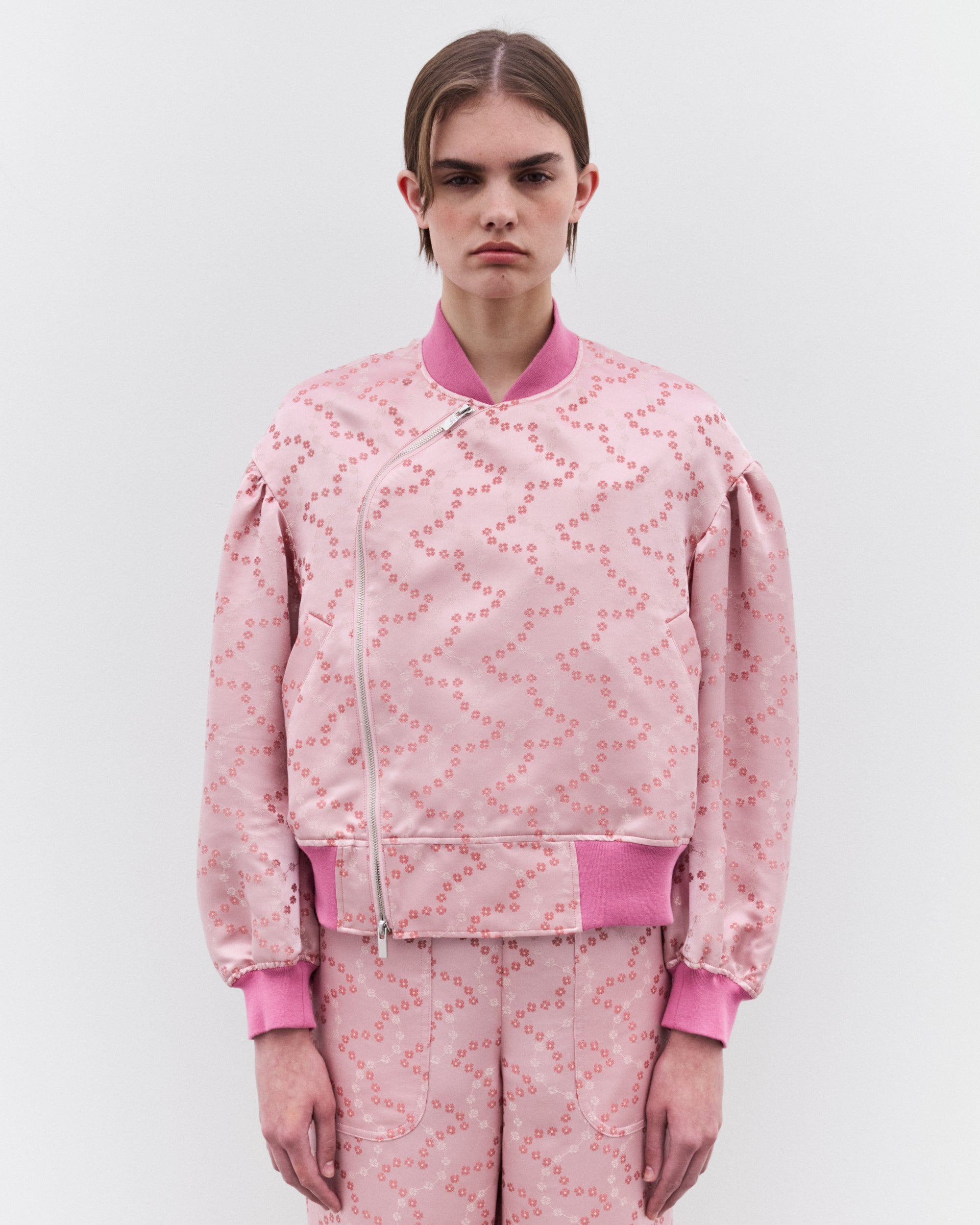 Rib knit trimsFloral design throughoutLarge, exaggerated sleevesAsymmetric two-way zip fasteningSilver-tone hardwareSide welt pockets57% Polyester, 43%RayonMade in Japan