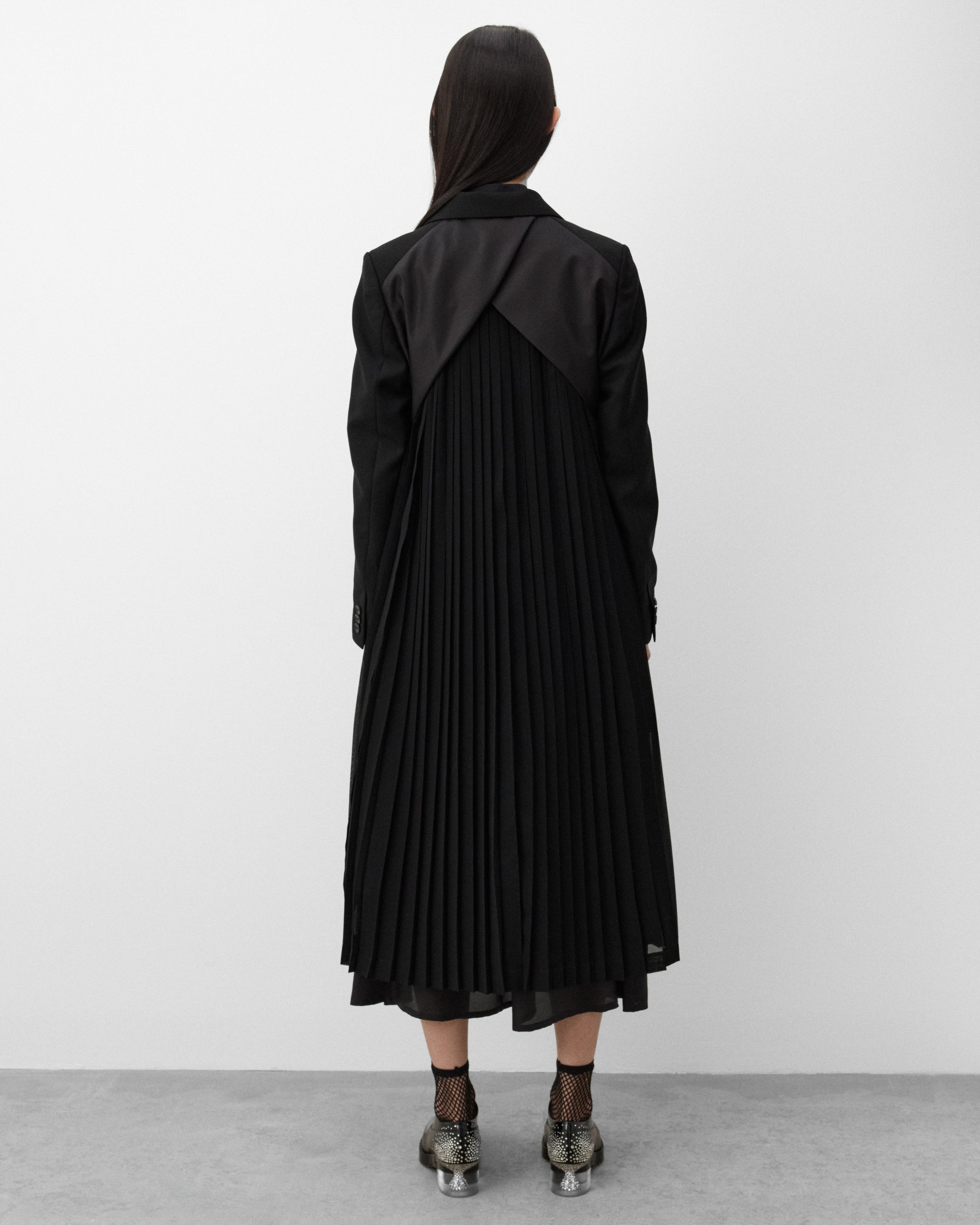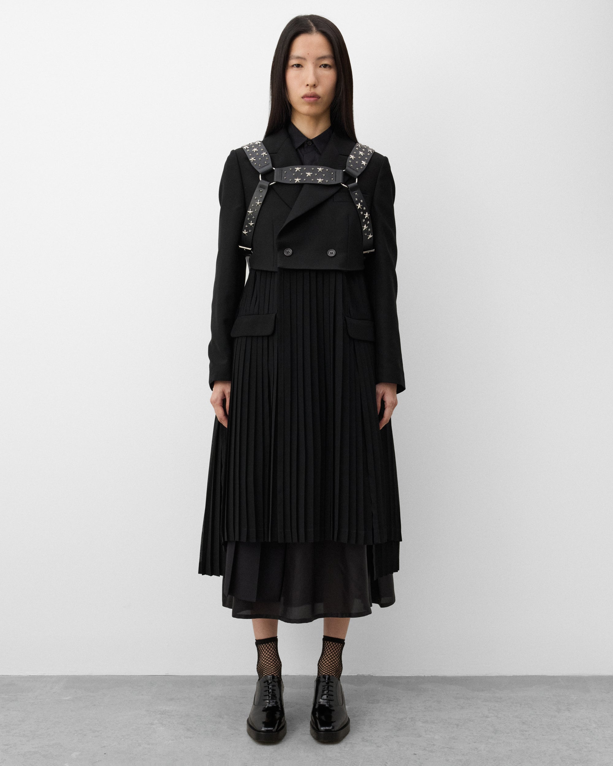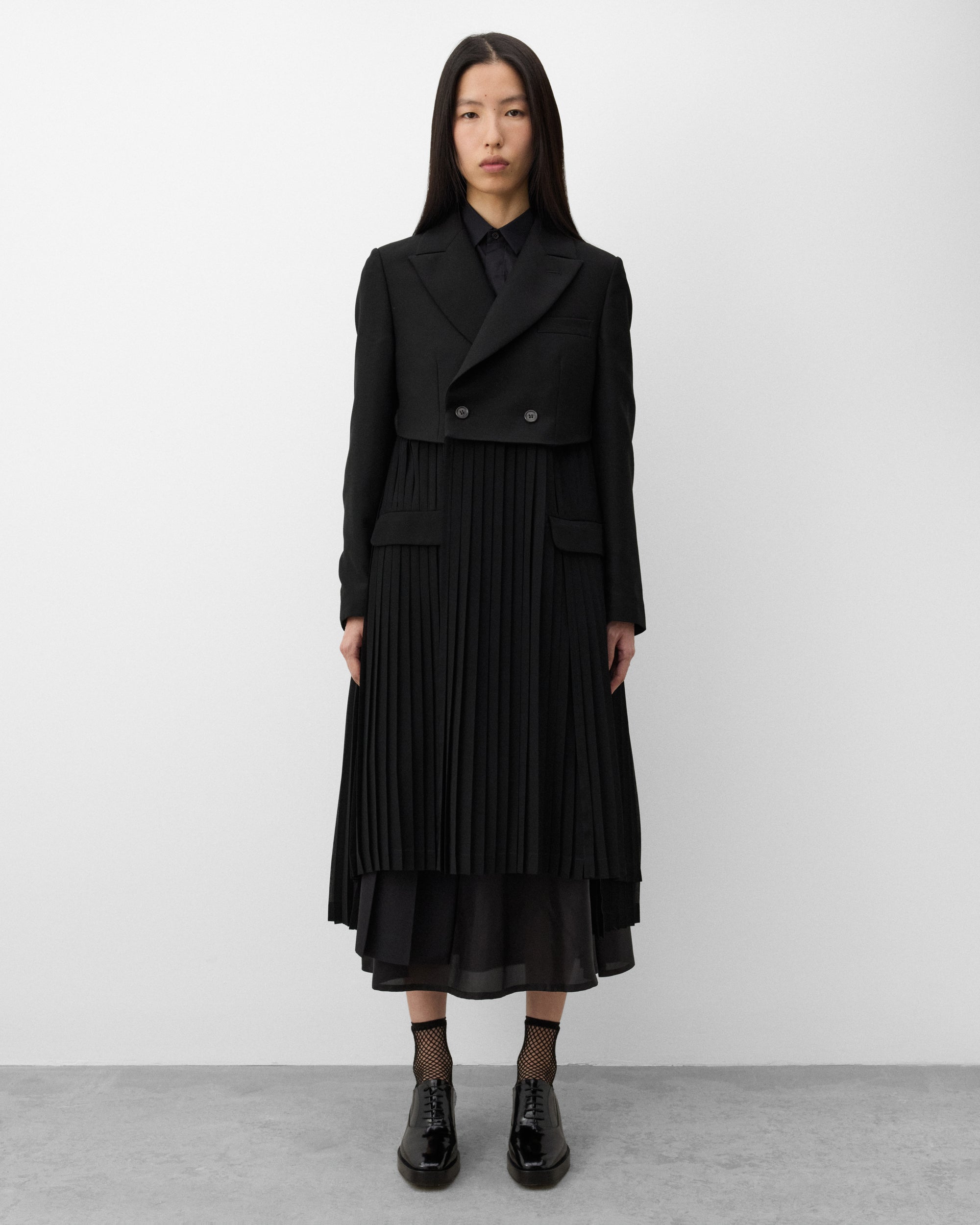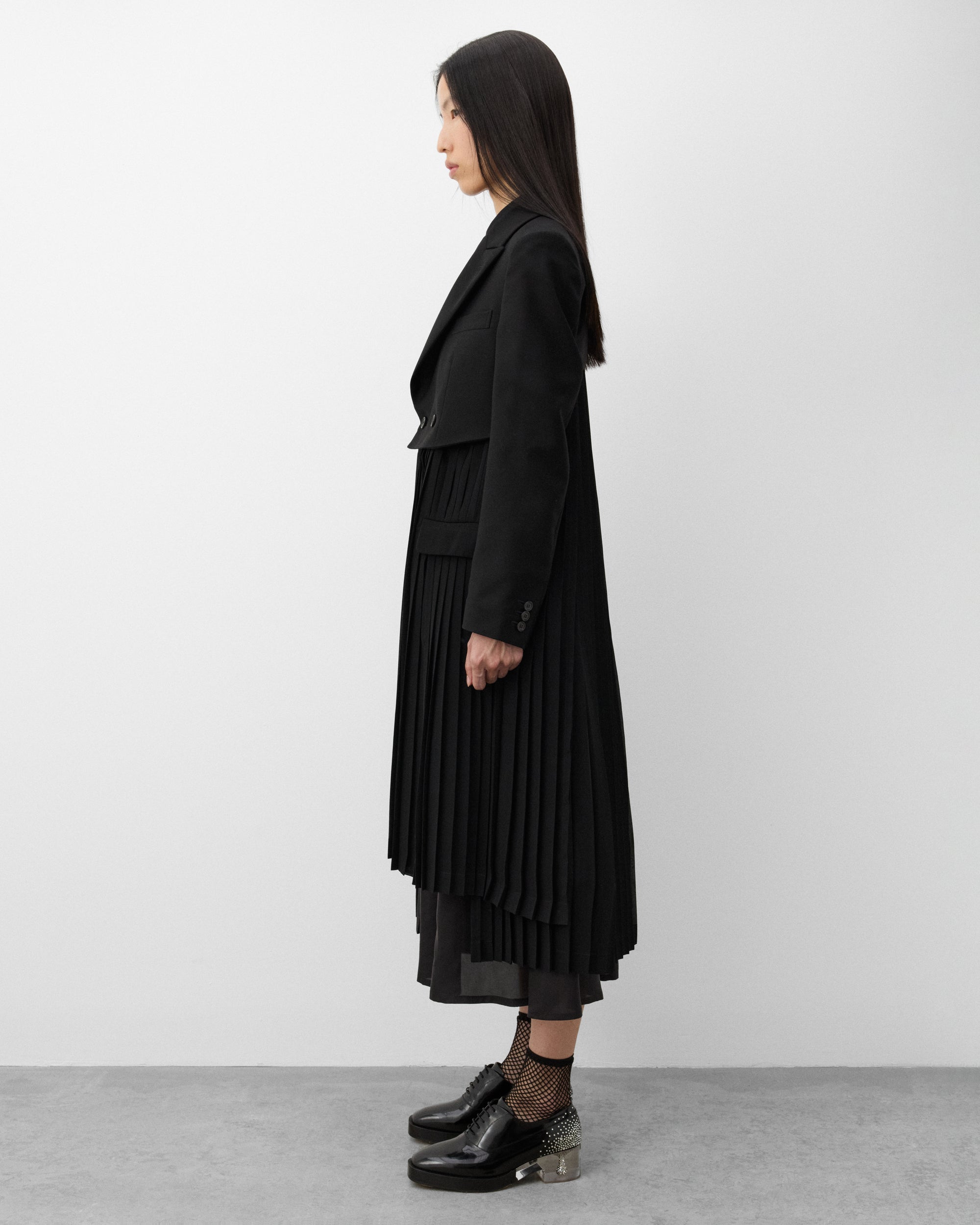 Single breasted blazer upperPeak lapel collarLong sleevesFull internal lining Pleated pleated skirtMidi length Two front flap close pockets