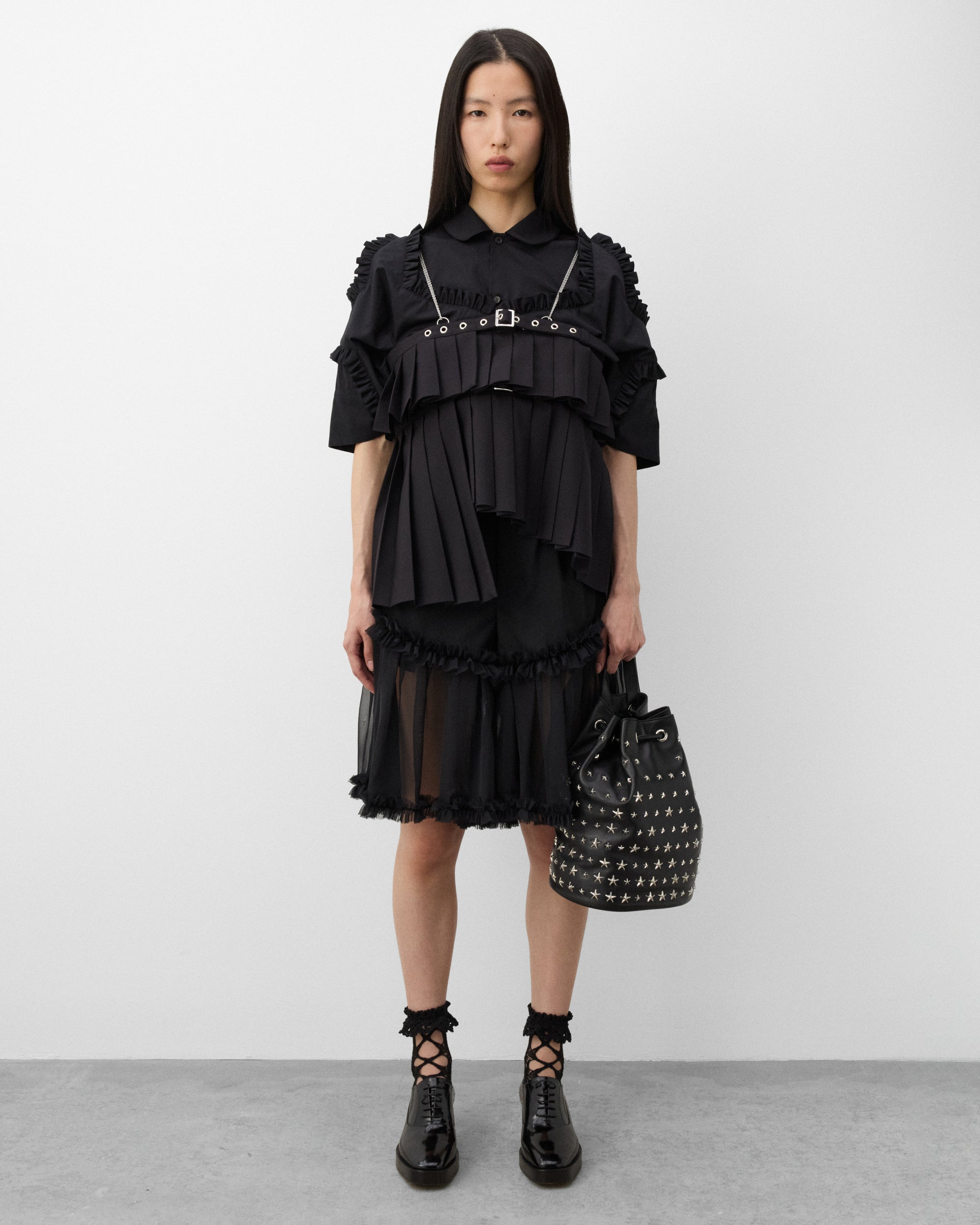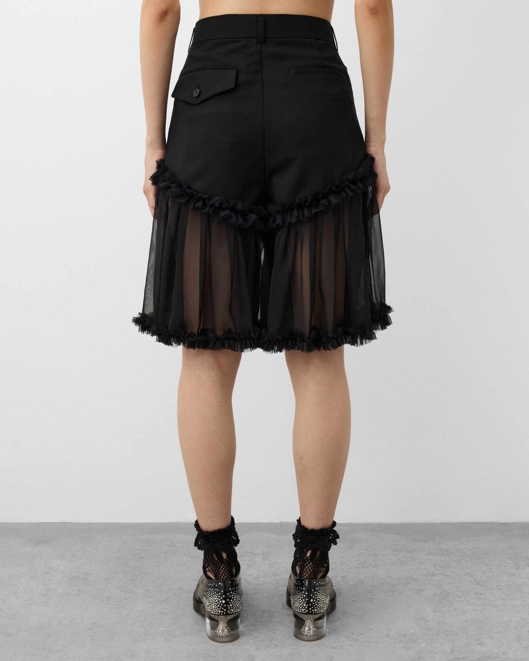 Button waist, Zip flyFront slip pockets and two back pocketsSheer tulle panels Ruffle trims Pleated front