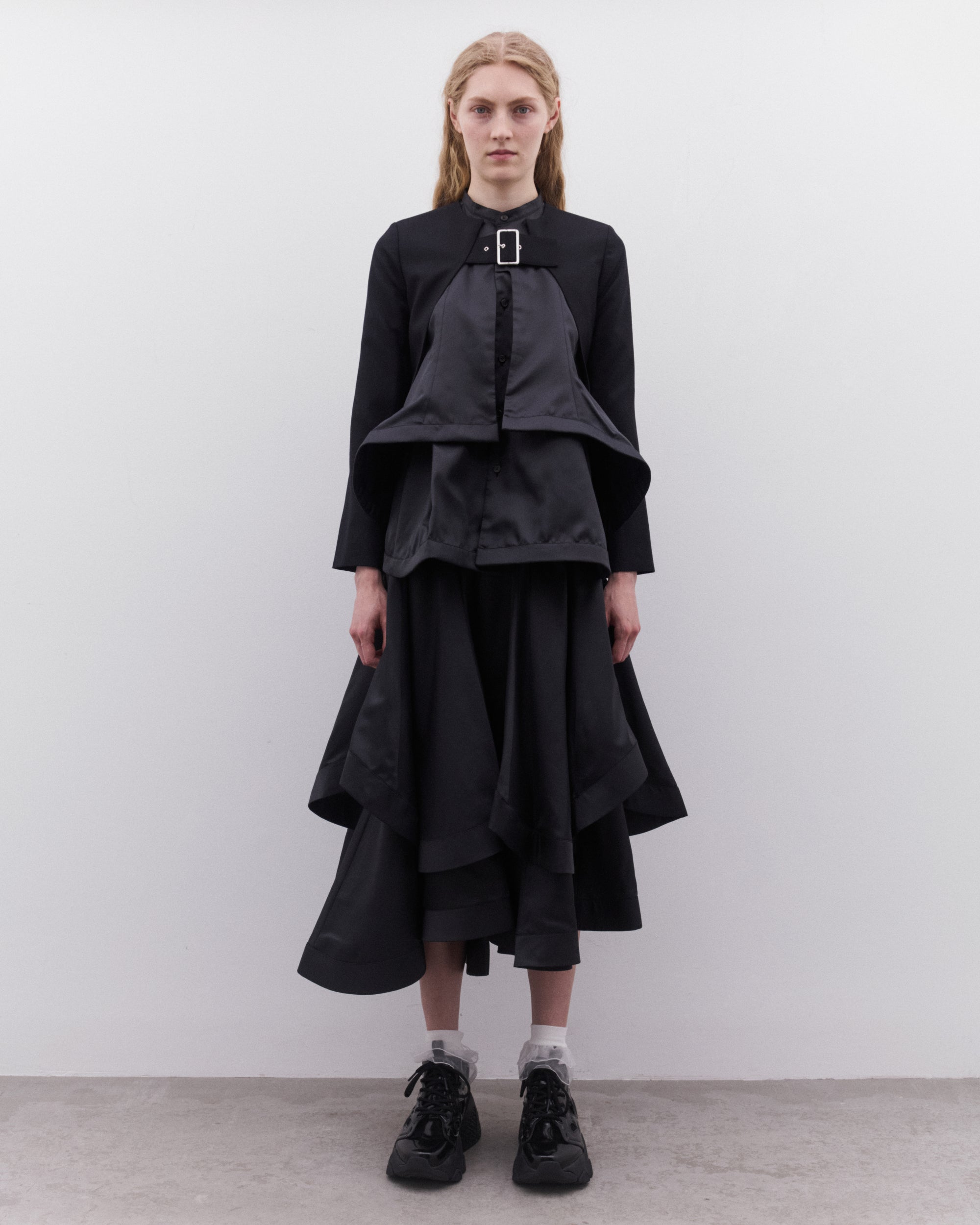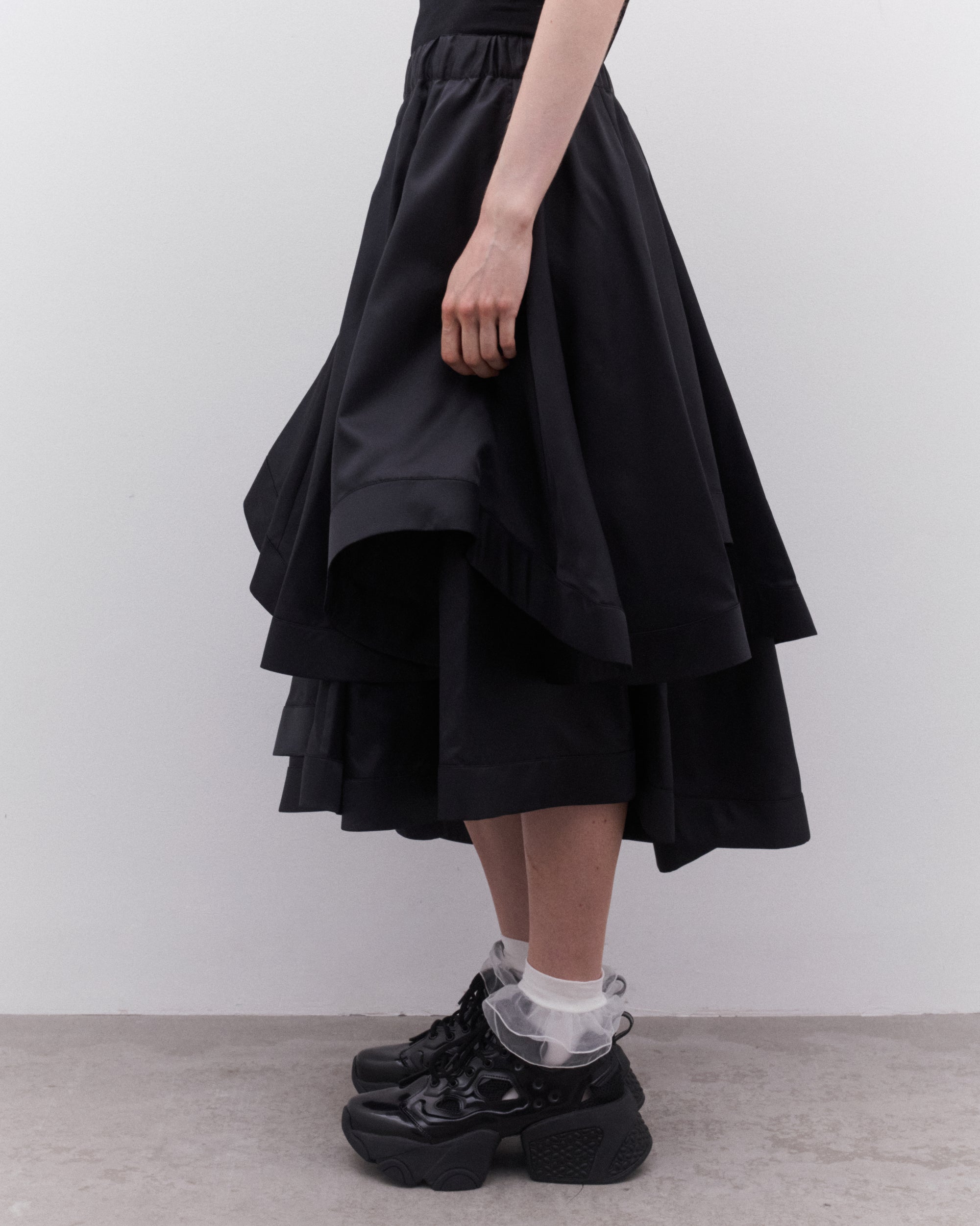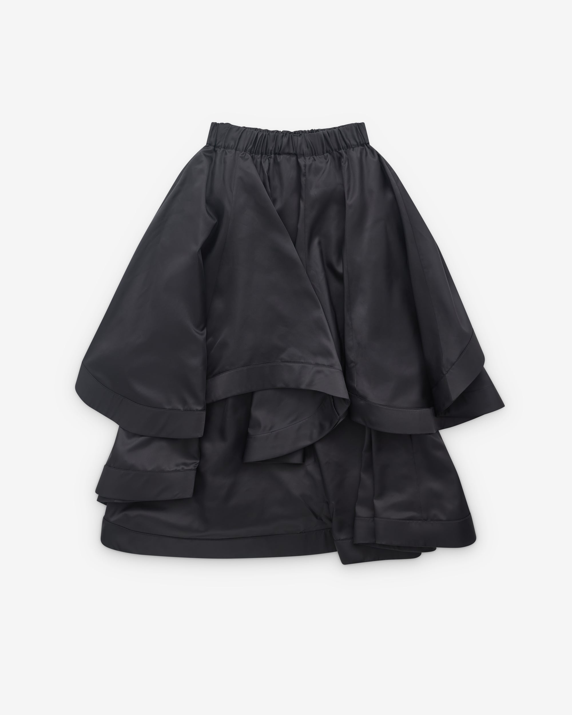 Elasticated waist with internal drawcordDouble layer structureDouble faced reinforced hemsMId lengthA-line silhouette