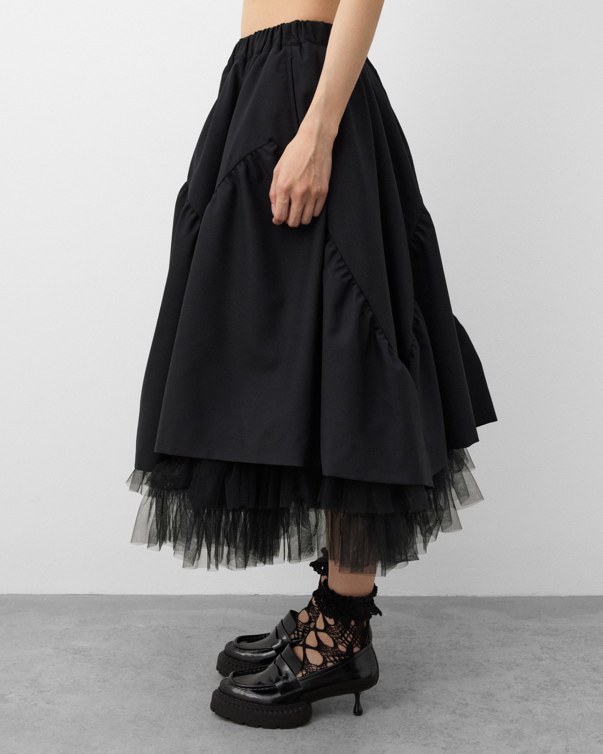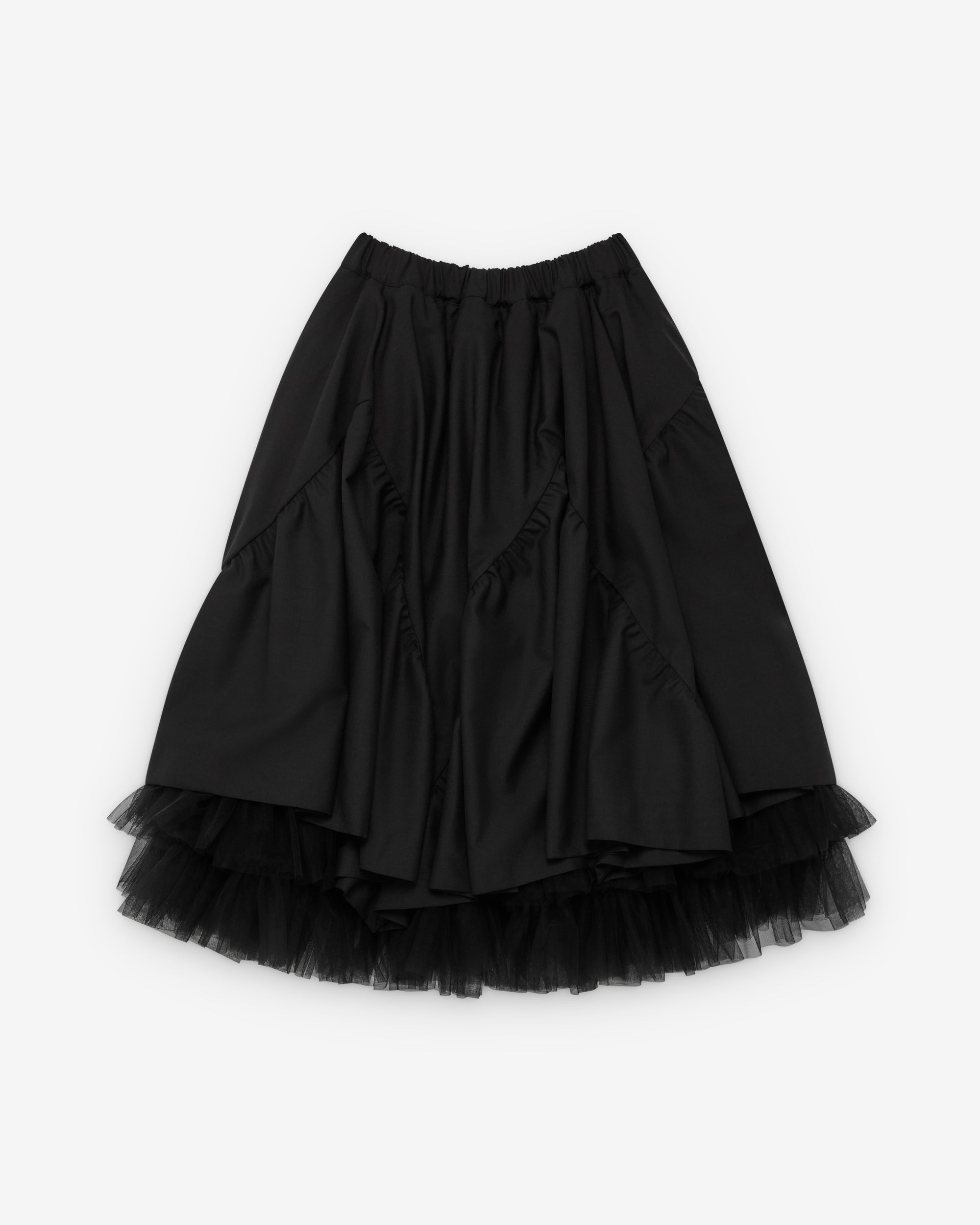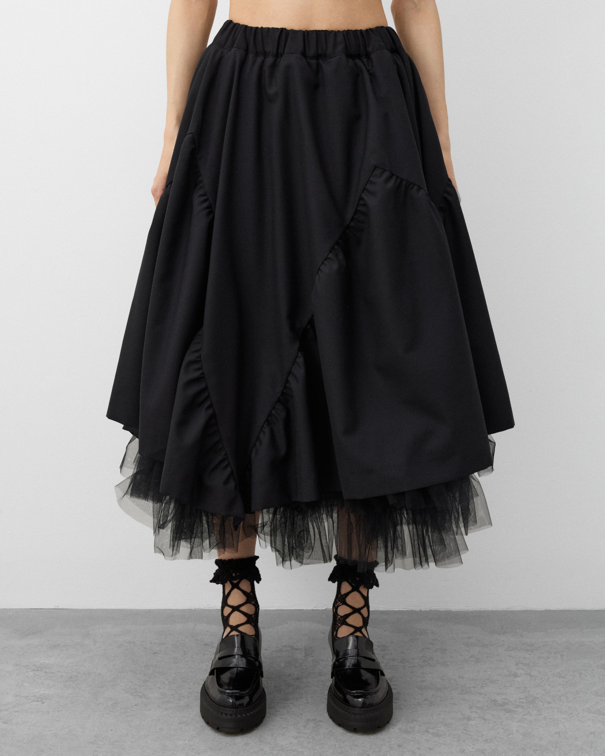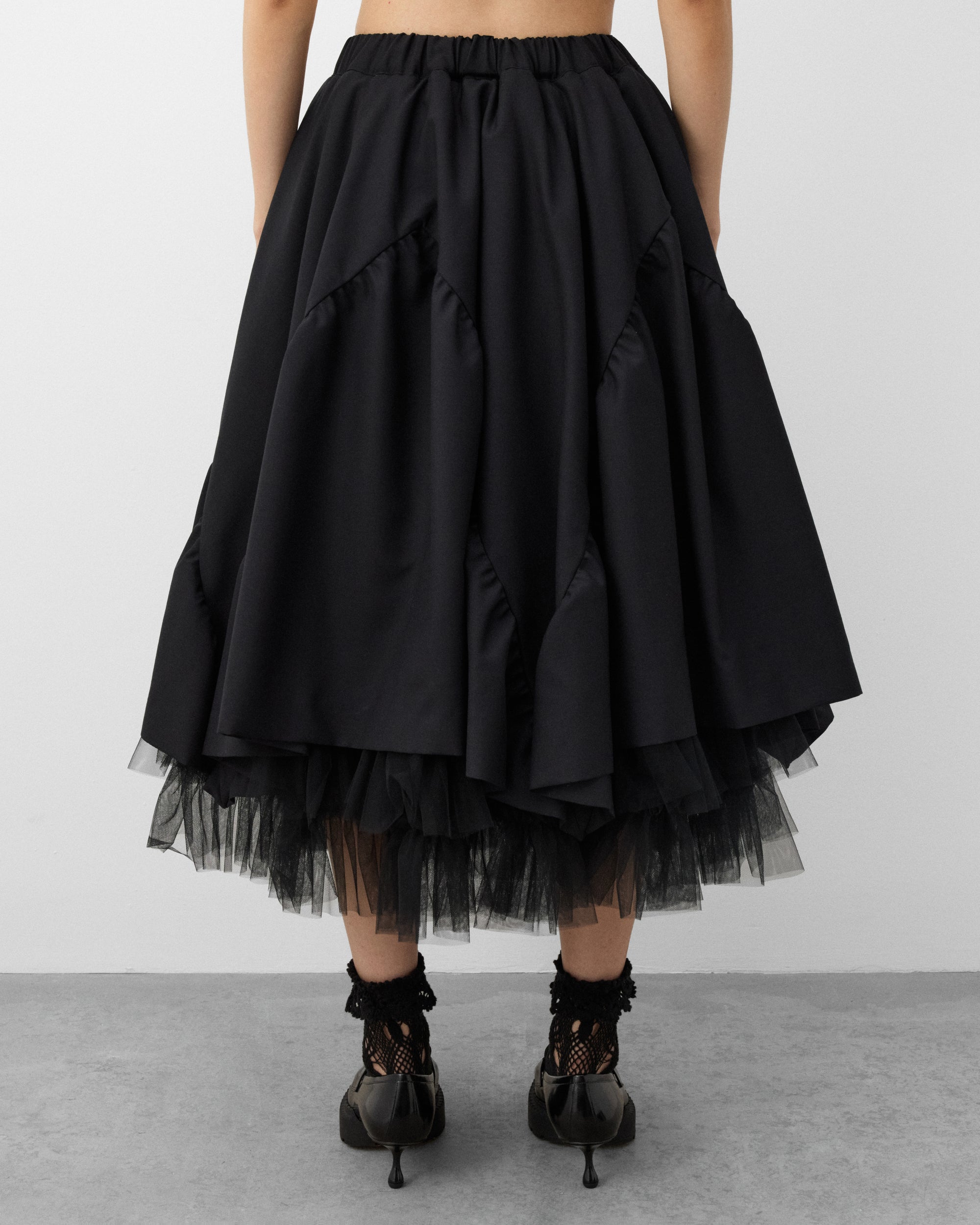 Elasticated waist bandVoluminous A-line cutFront slip pocketsTulle underlay Below knee lengthSatin underlay