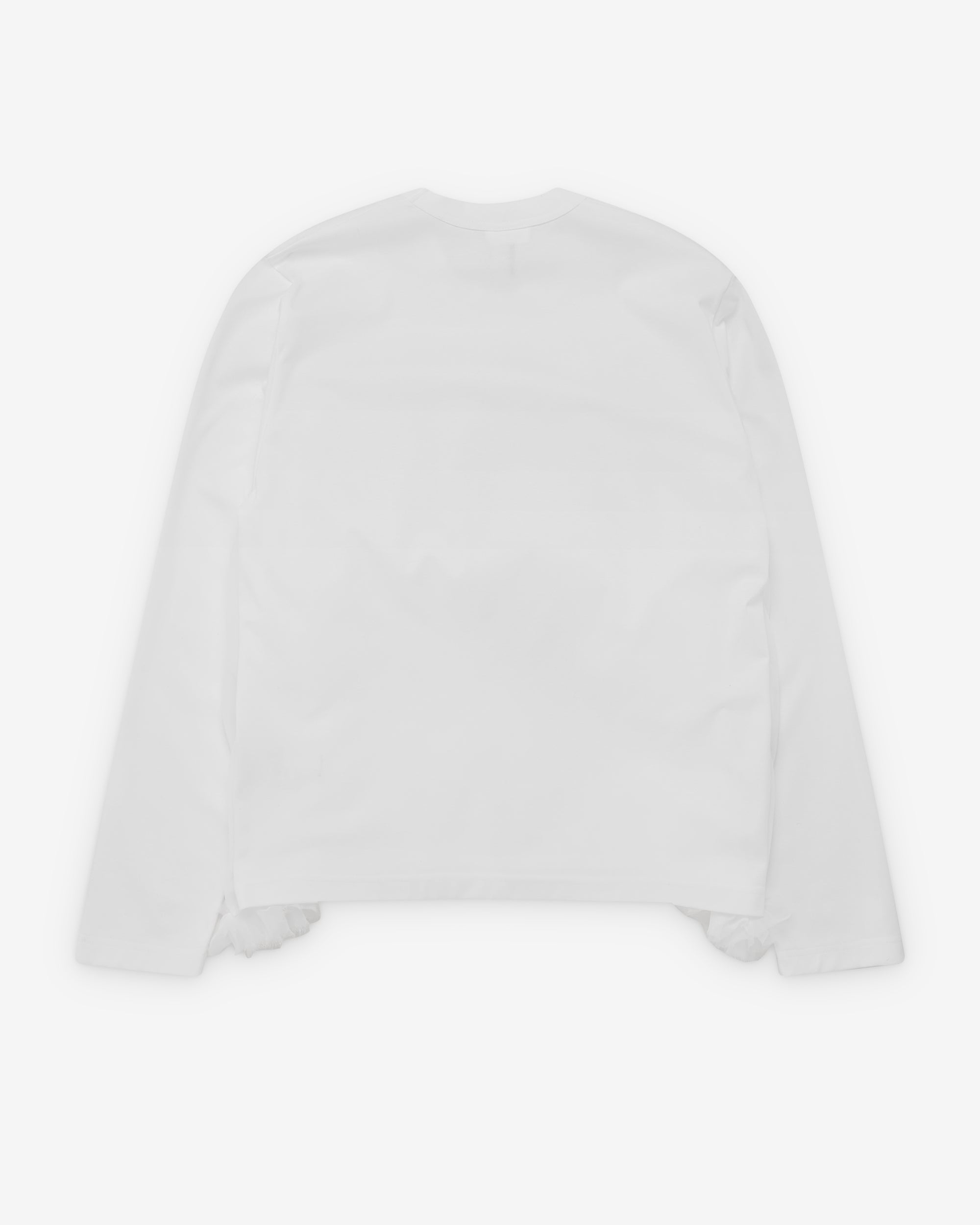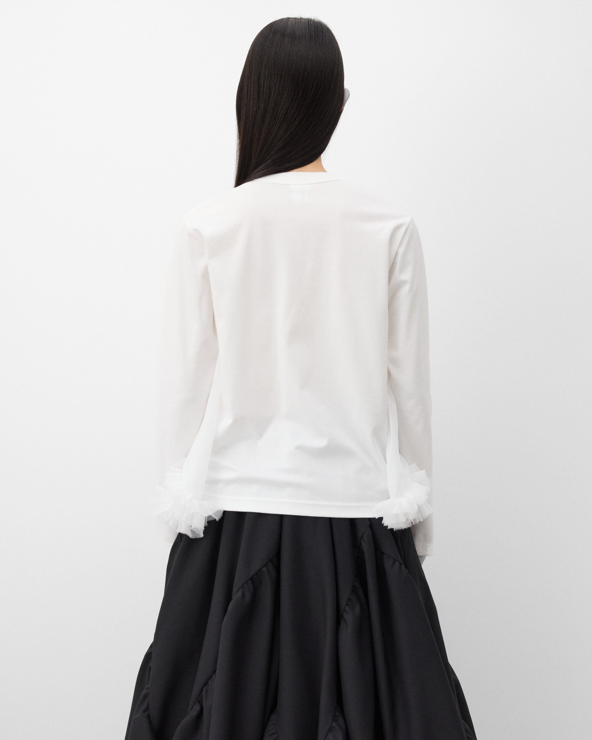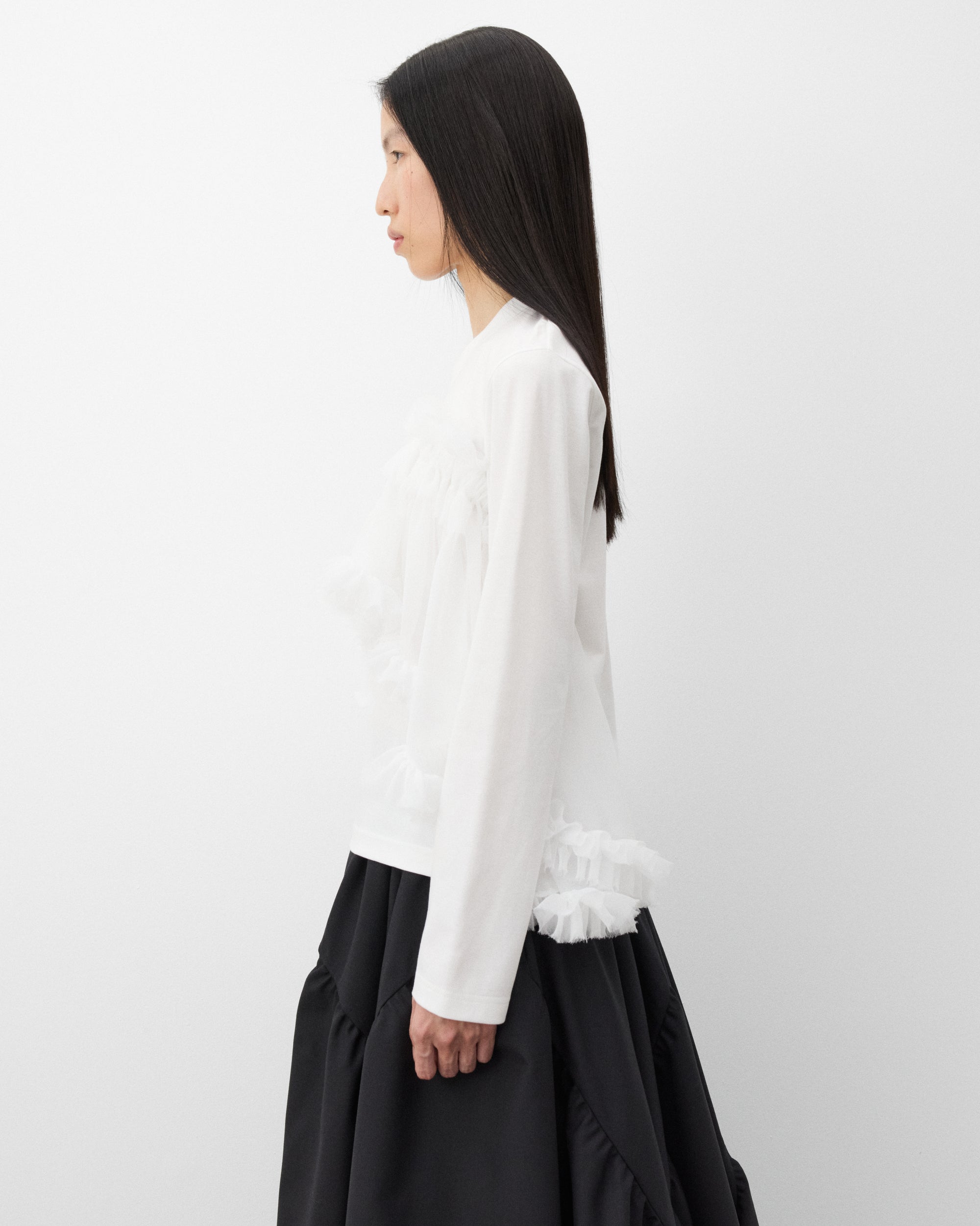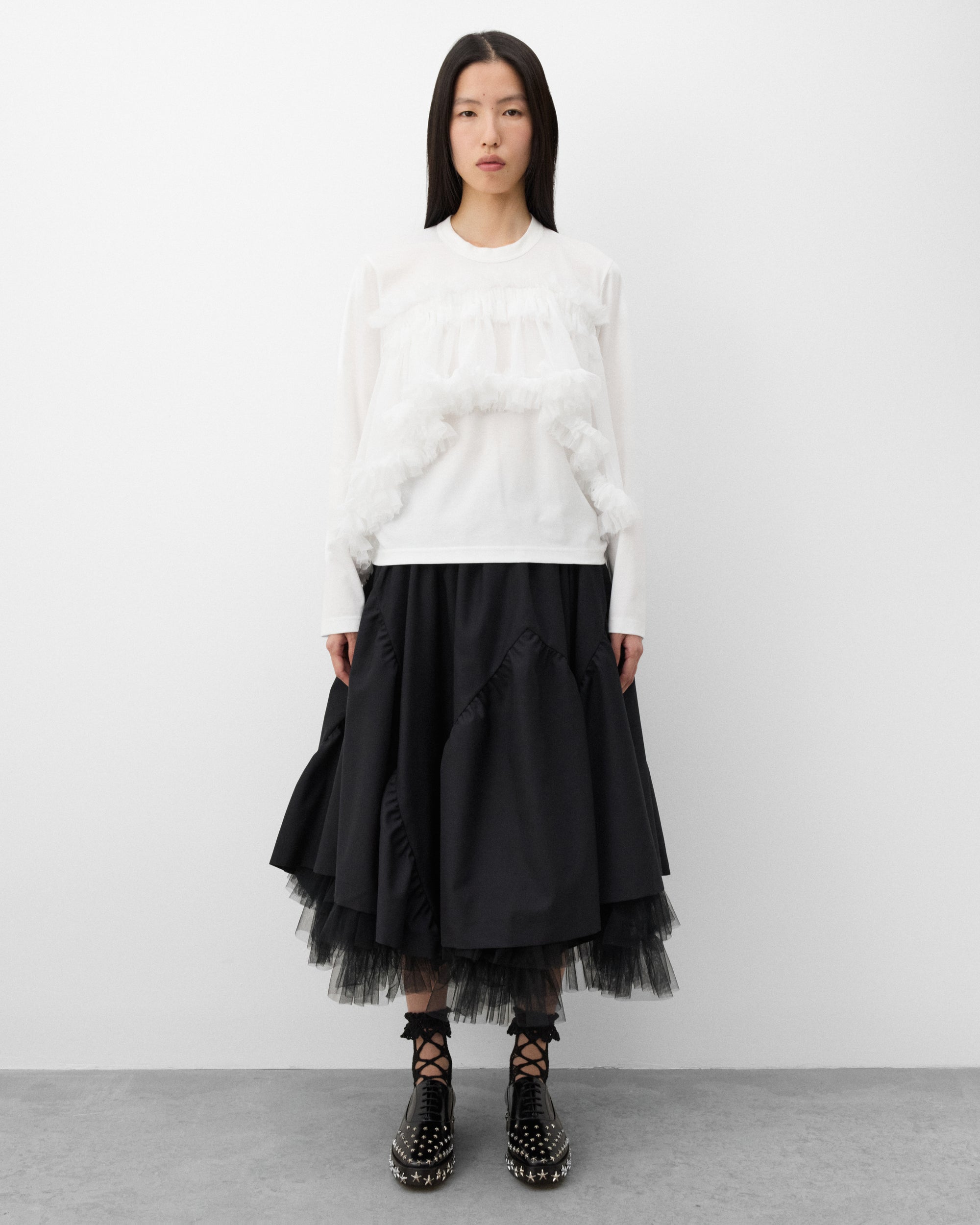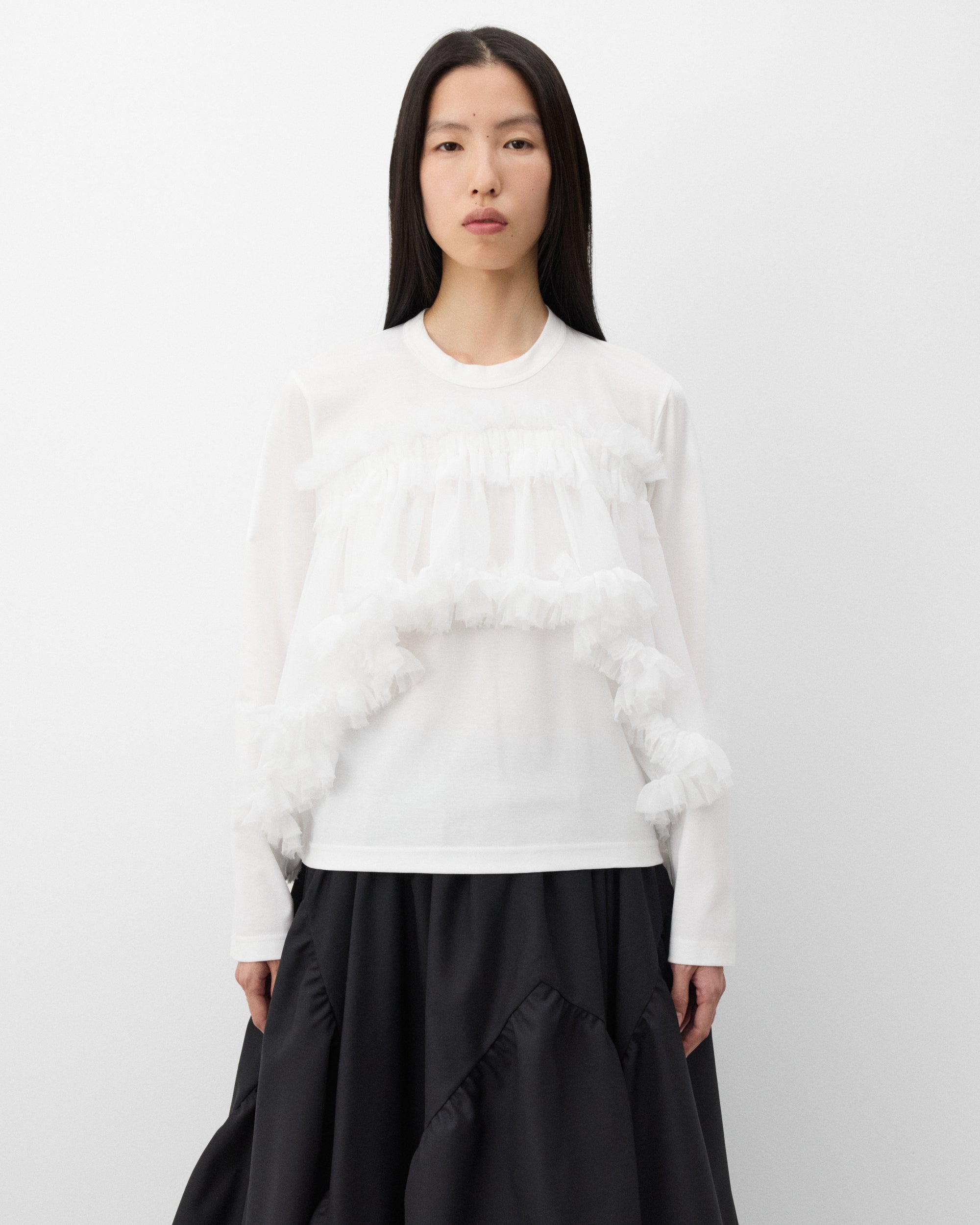 Long sleeveRounded necklineTiered tulle overlayStraight hem