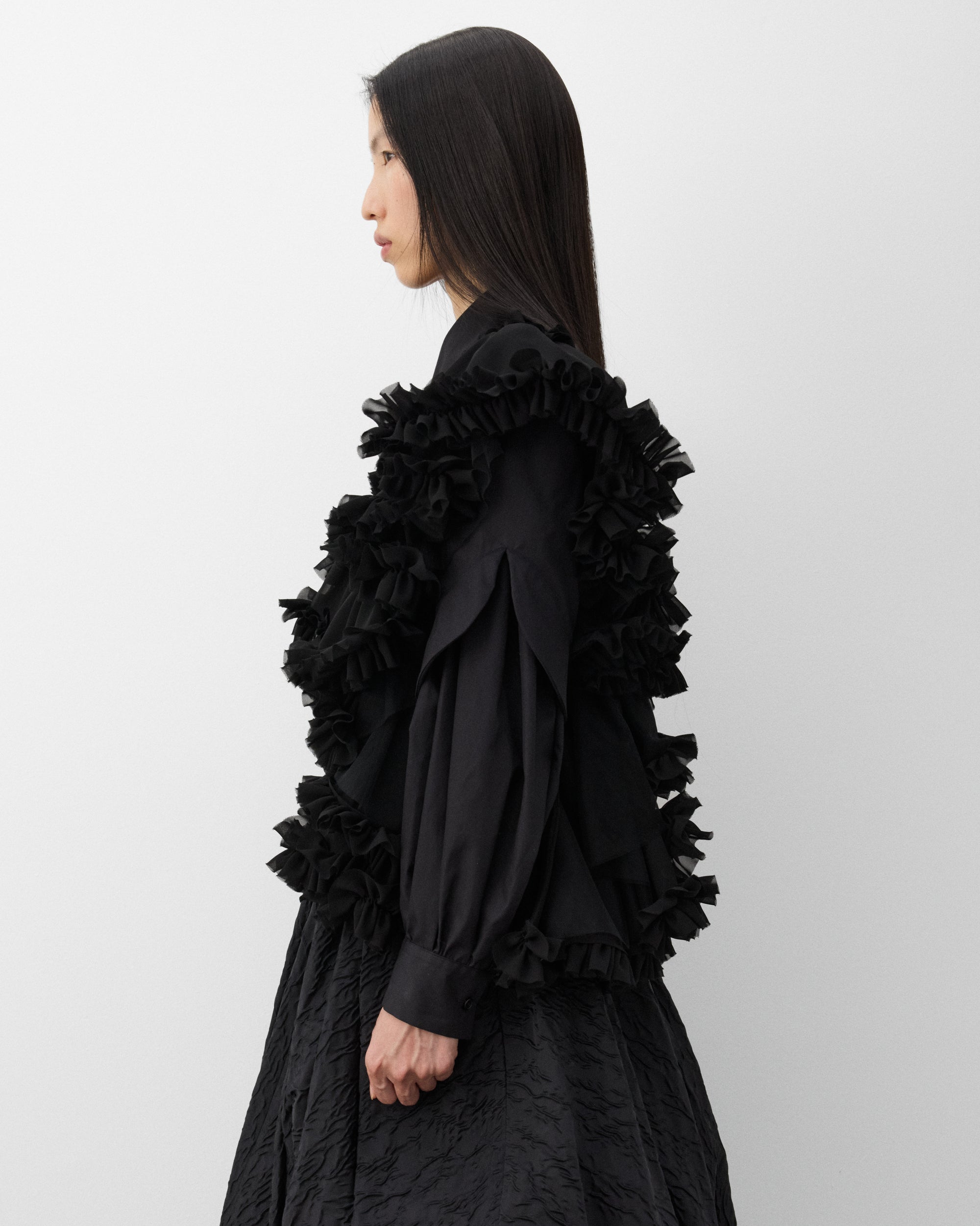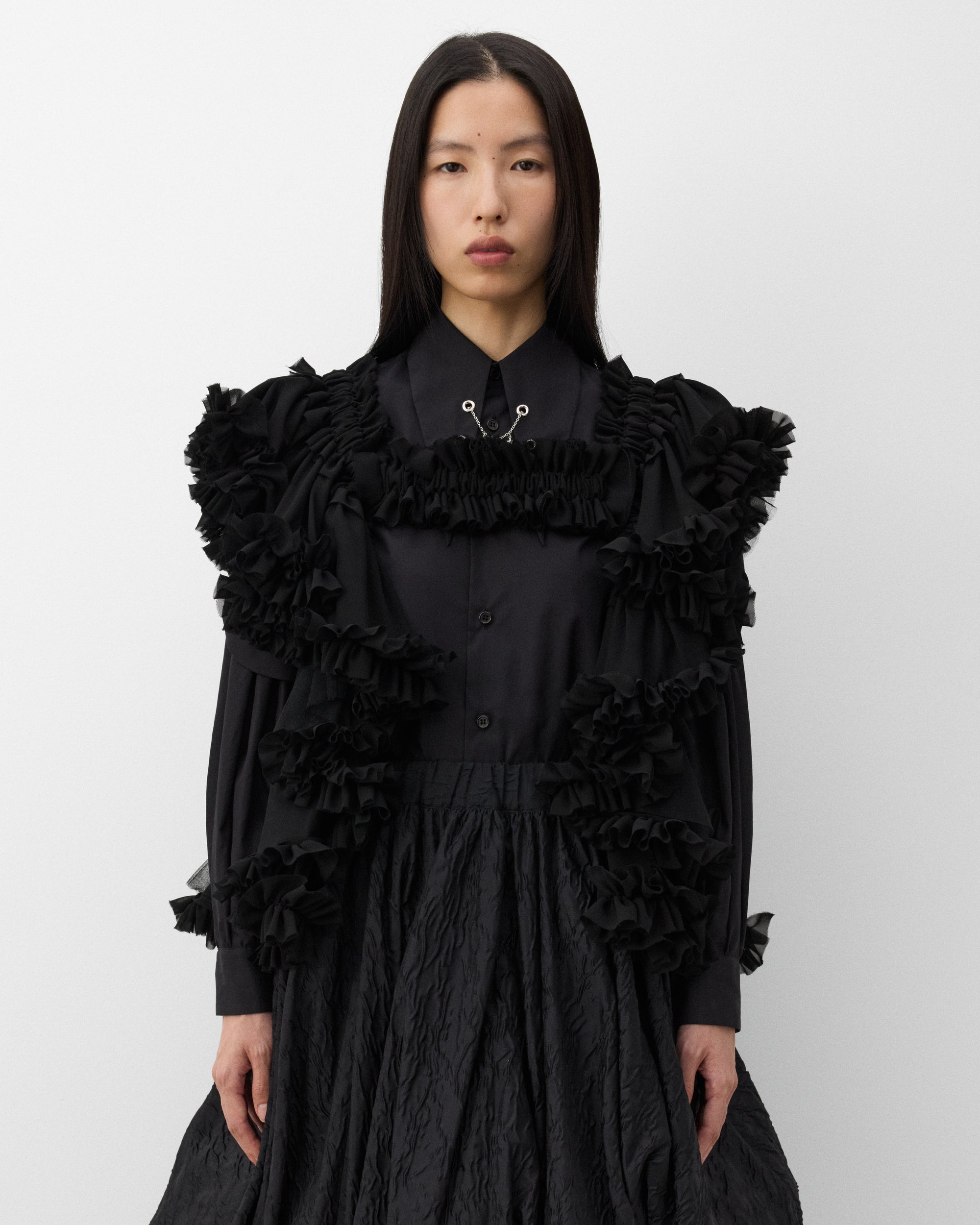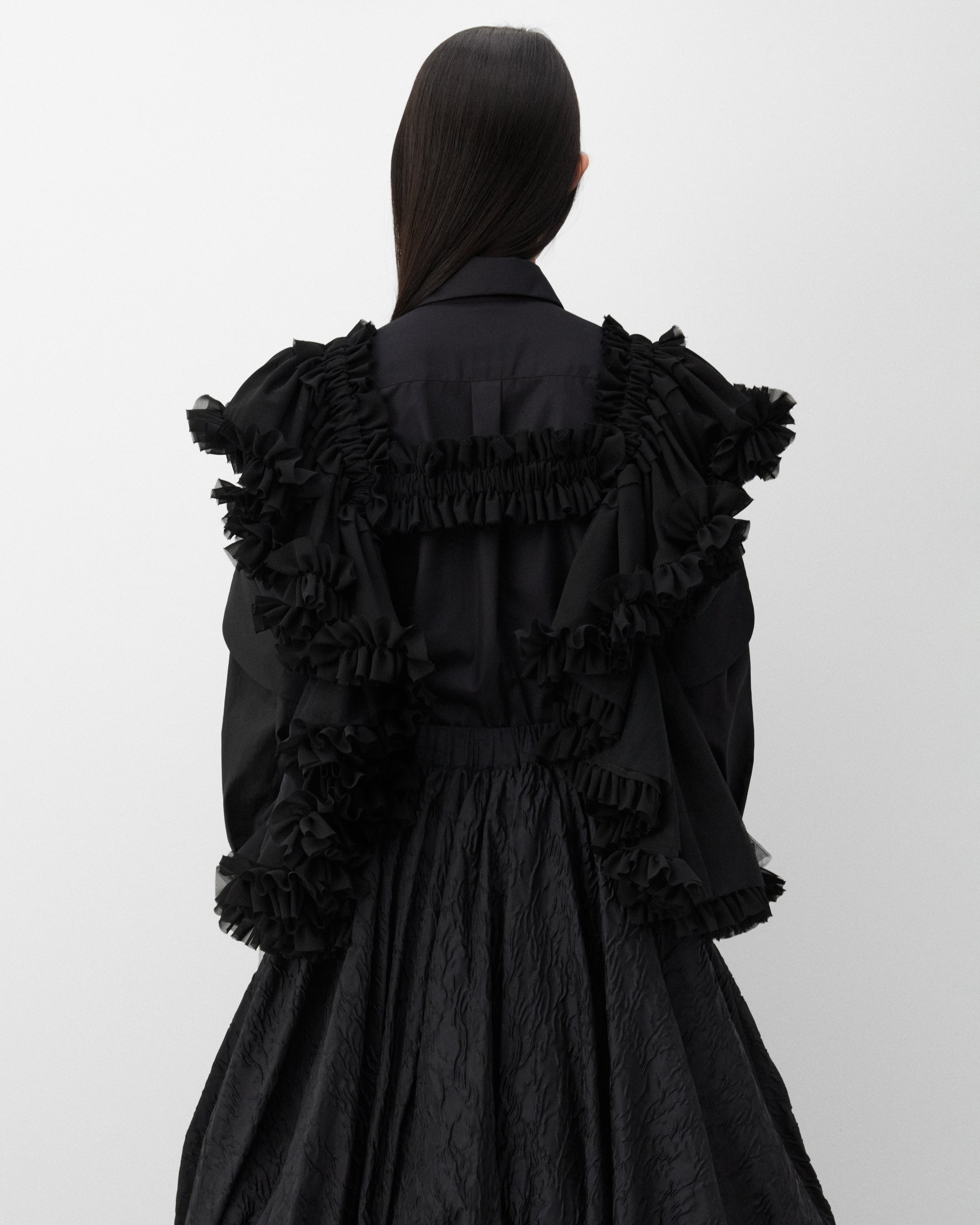 Tiered tulle and ruffle fabricElasticated band at chestOpen back and frontSleeveless Tulle overlays