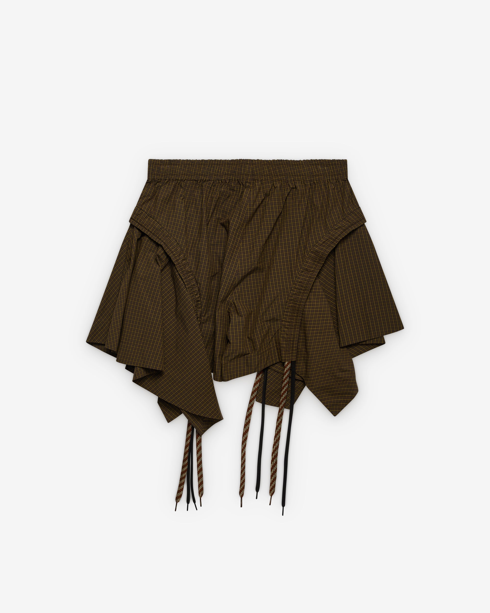 Elasticated waist bandCheck fabricDraped panels at legSide seam pocketsDrawstring details