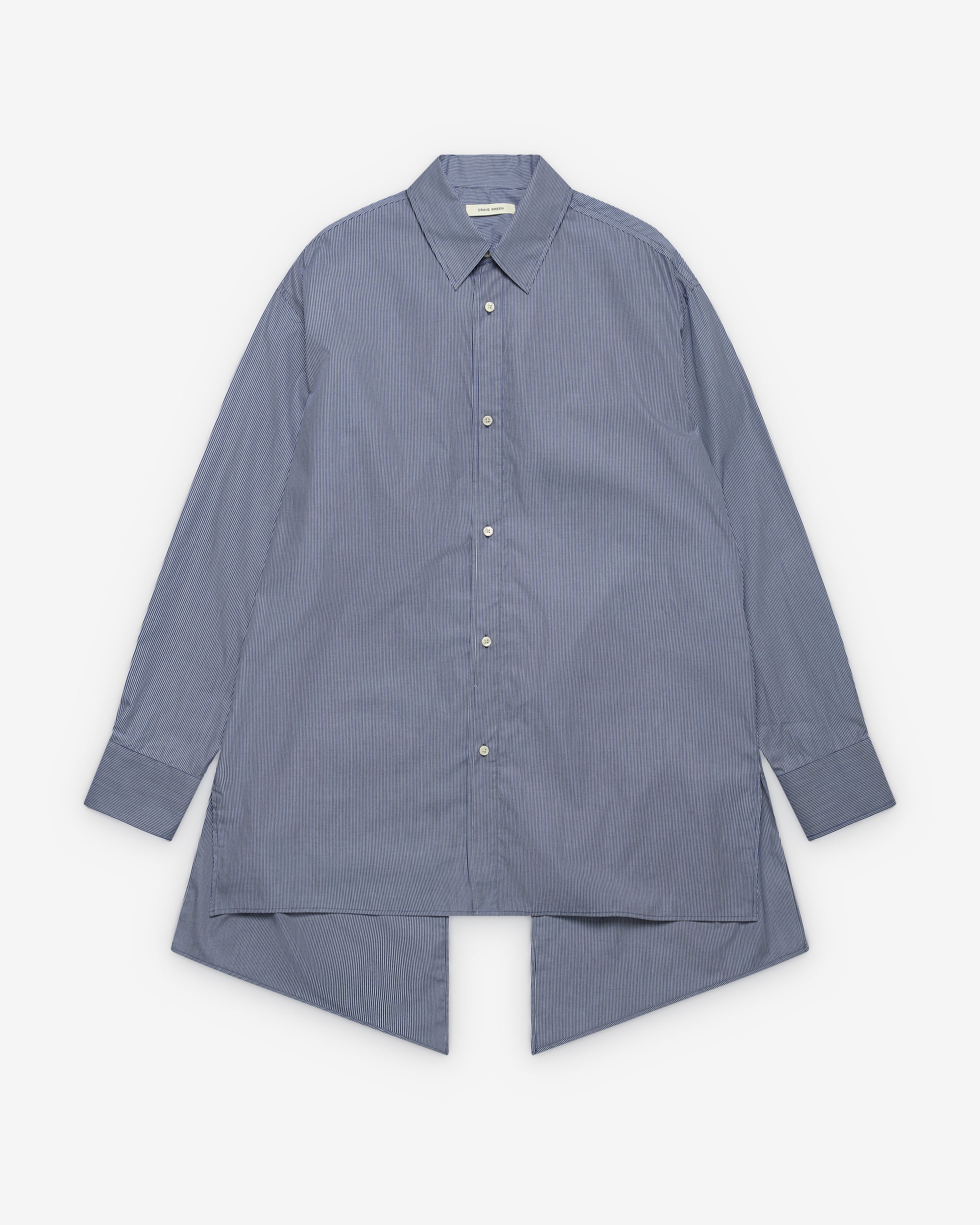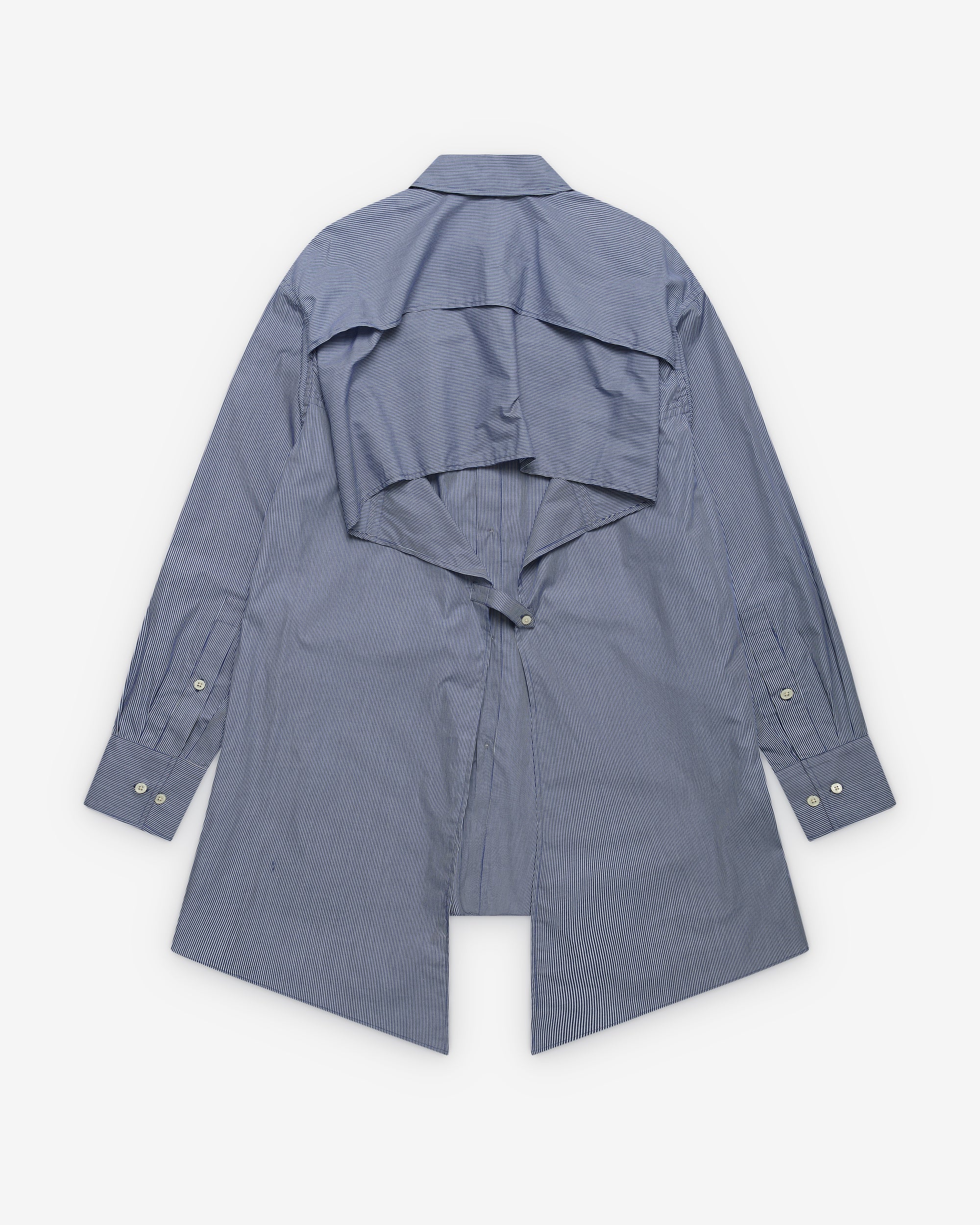 Point collarFront button closureElongated fit Cut out open backAsymmetric panels at backButton close cuffs